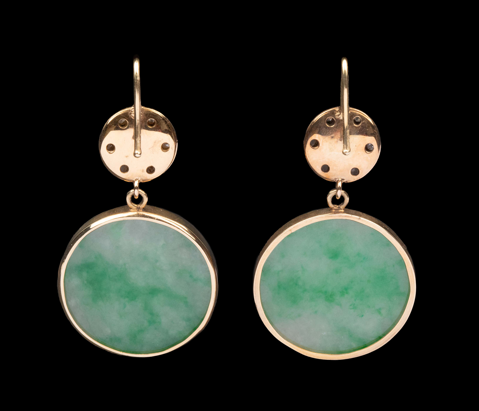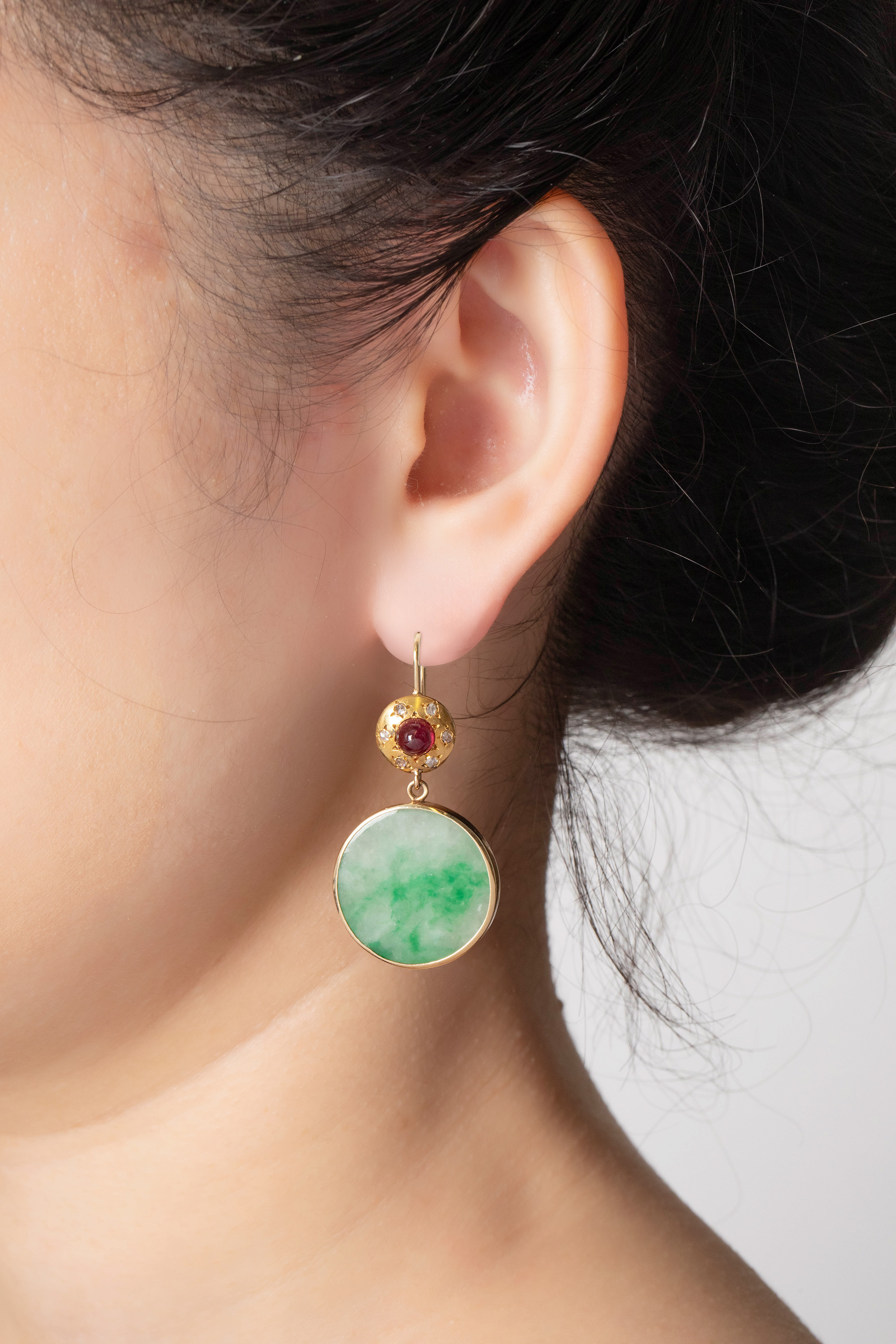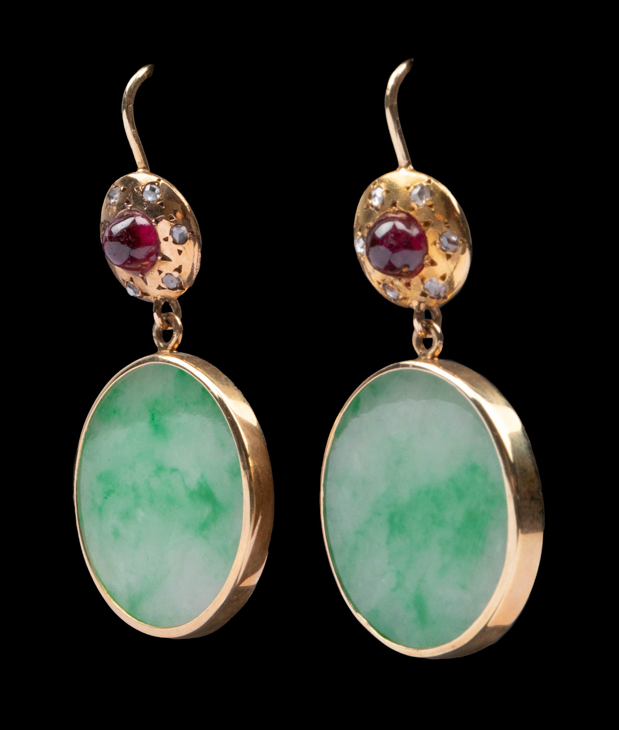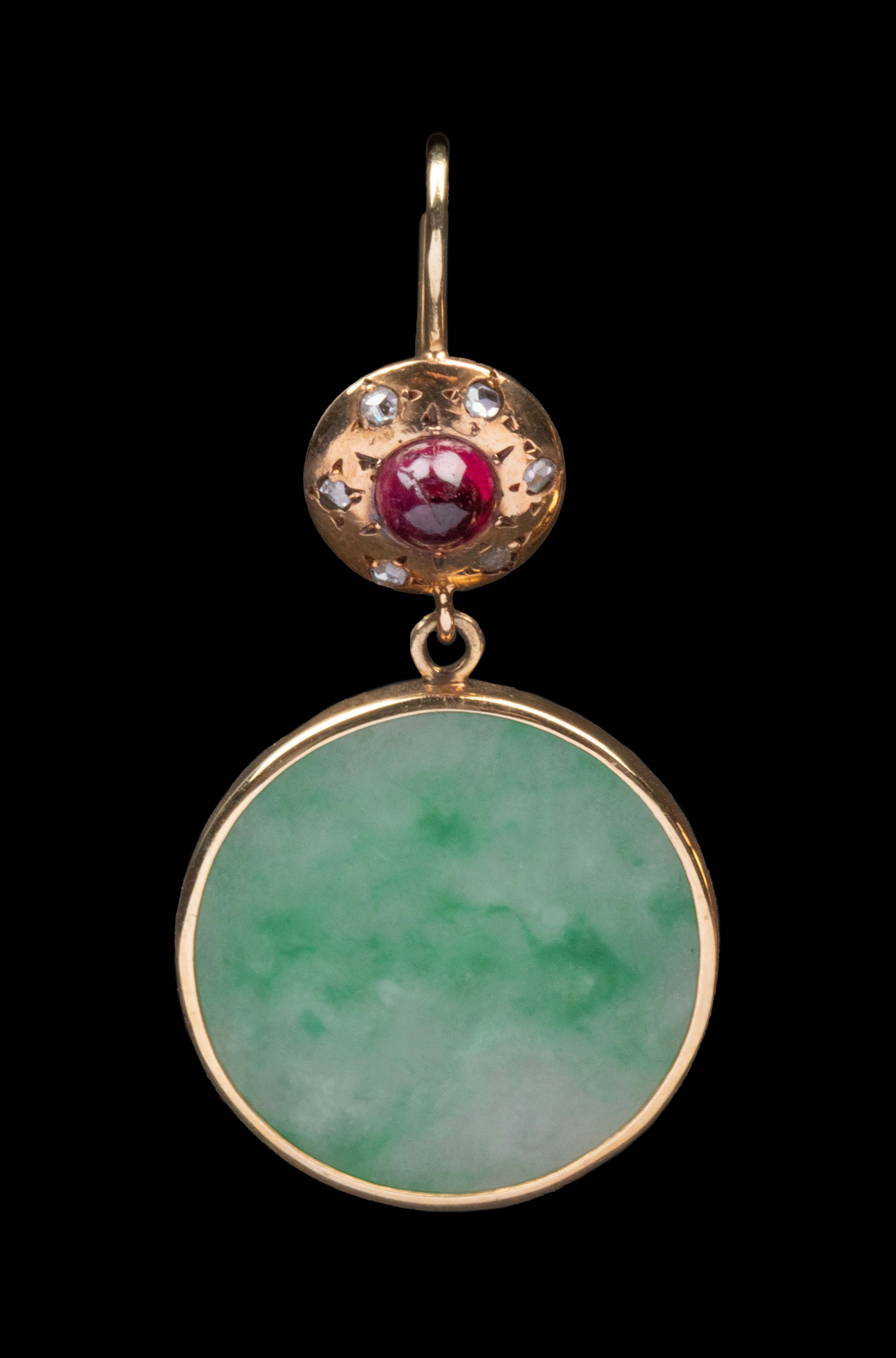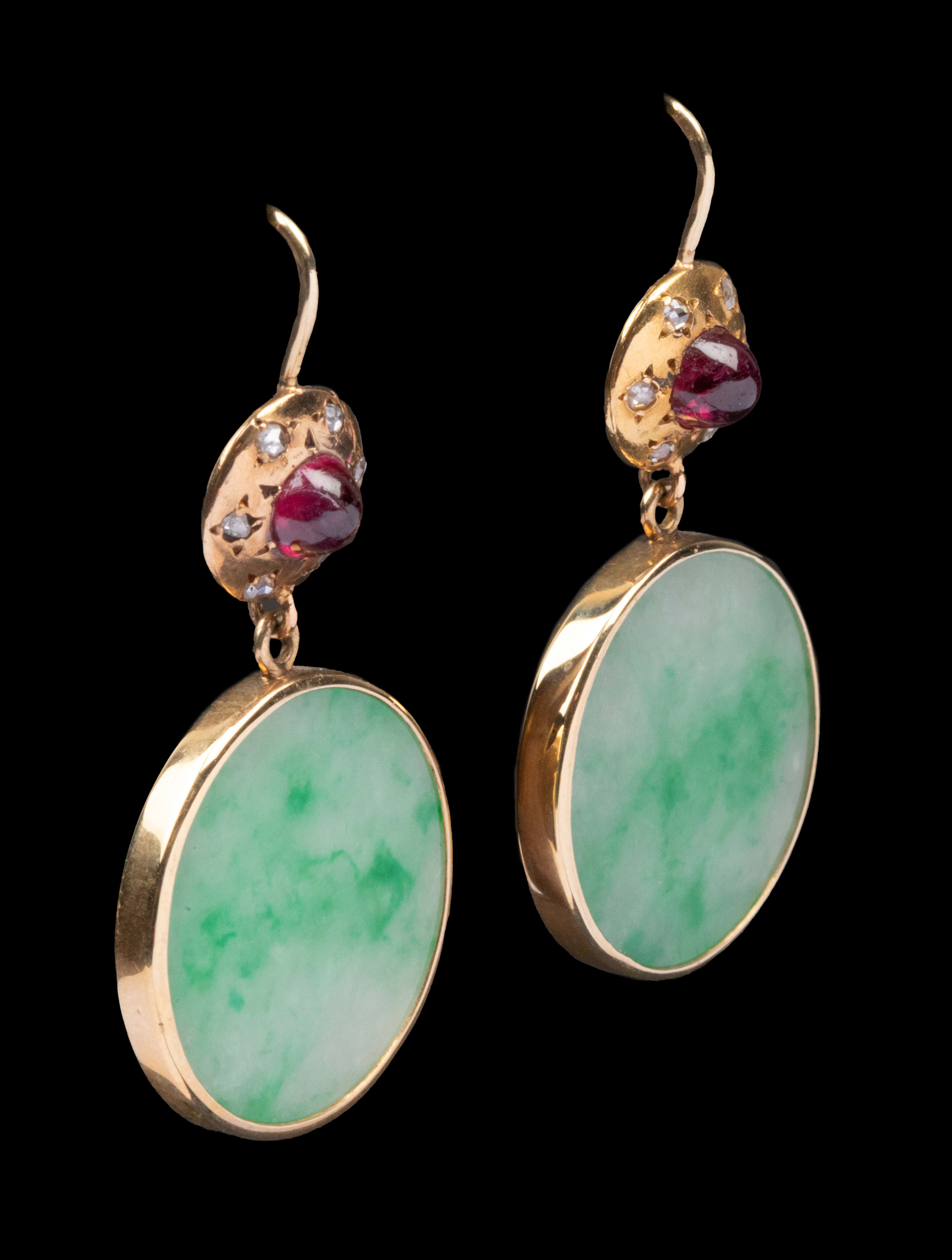 1900年代欧洲出品14K黄金镶嵌钻石红宝石及圆形飘花翡翠耳环一对
