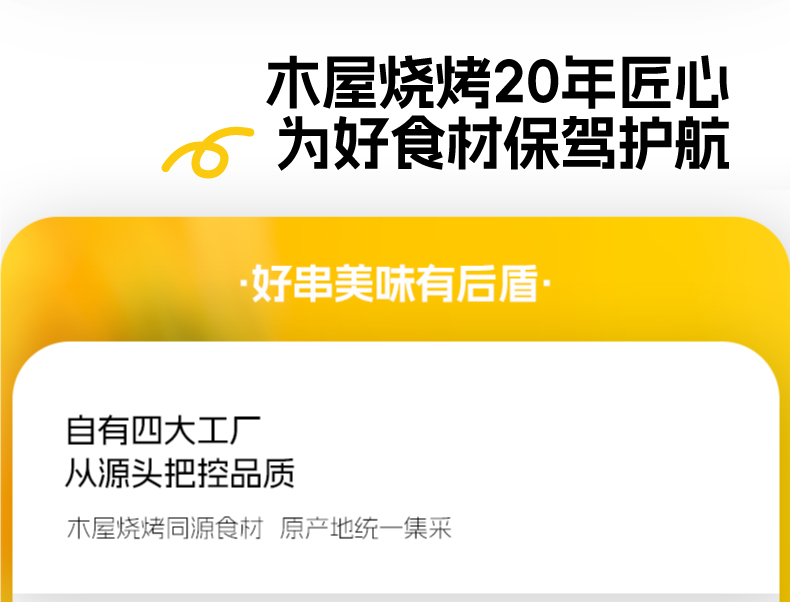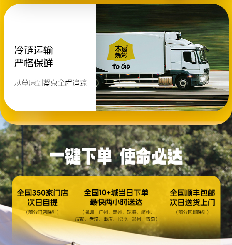木屋烧烤半成品套装,一键下单,使命必达。 -全国300家门店支持次日到店自提 -全国顺丰包邮,当日下单,次日顺丰送货上门(部分区域除外,实际以顺丰时效为准)