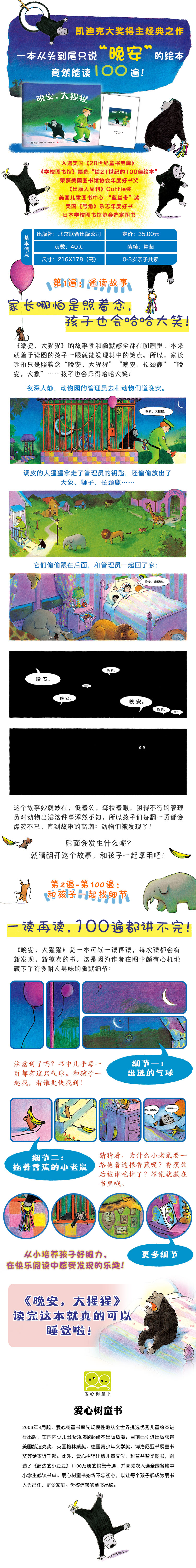 《晚安,大猩猩》是一本文字十分简单,却可以和孩子一起读一百遍都不会无聊的神奇晚安书。 书里文字有多简单呢?全书一共六十五个字,如果照着念,听到的不过是“晚安,大猩猩”“晚安,大象”“晚安,长颈鹿”……可奇妙的是,哪怕家长只是照着念,孩子都会哈哈大笑。 这是因为书中的画面会讲故事。而这个故事,爱调皮捣蛋的孩子们非常熟悉,也非常有默契:夜深了,要睡觉了,动物管理员和动物们一一说晚安,却不料被大猩猩偷走了钥匙,还把其他动物也放出来,大家偷偷跟随者管理员来到他的家里睡觉的故事。 妙就妙在,故事里那个低着头,耷拉着眼,困得不行的管理员对动物出逃这件事浑然不知,所以孩子们每翻一页都会爆笑不已,直到故事的高潮:动物们被发现了! 后面会发生什么呢?故事结尾,大猩猩是在哪里睡觉的呢?就请翻开这个故事,一起享用吧。 这是一本可以一读再读,每次读都会有新发现,新惊喜的书。这是因为作者在图中颇有心机地藏下了许多耐人寻味的幽默细节:比如出逃的气球、拖着香蕉的小老鼠、动物笼子里的摆设,还有管理员的家中照片墙的玄机,也请爸爸妈妈和孩子们一起发现吧!