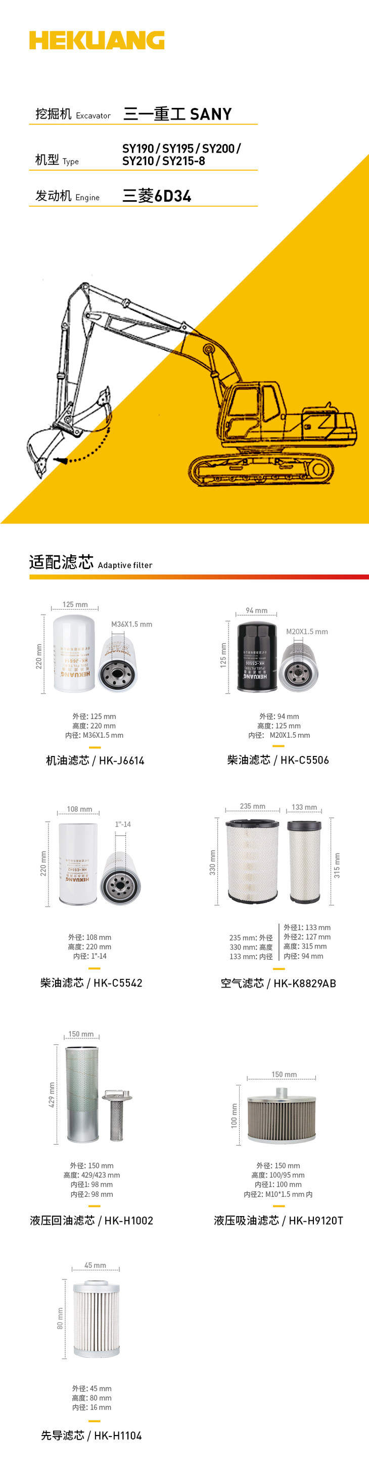 三一重工SY190 SY195 SY200 SY210 SY215-8(三菱6D34发动机)机油滤芯 柴油滤芯 液压油滤芯 先导滤芯