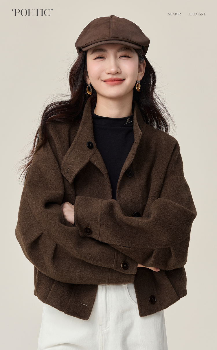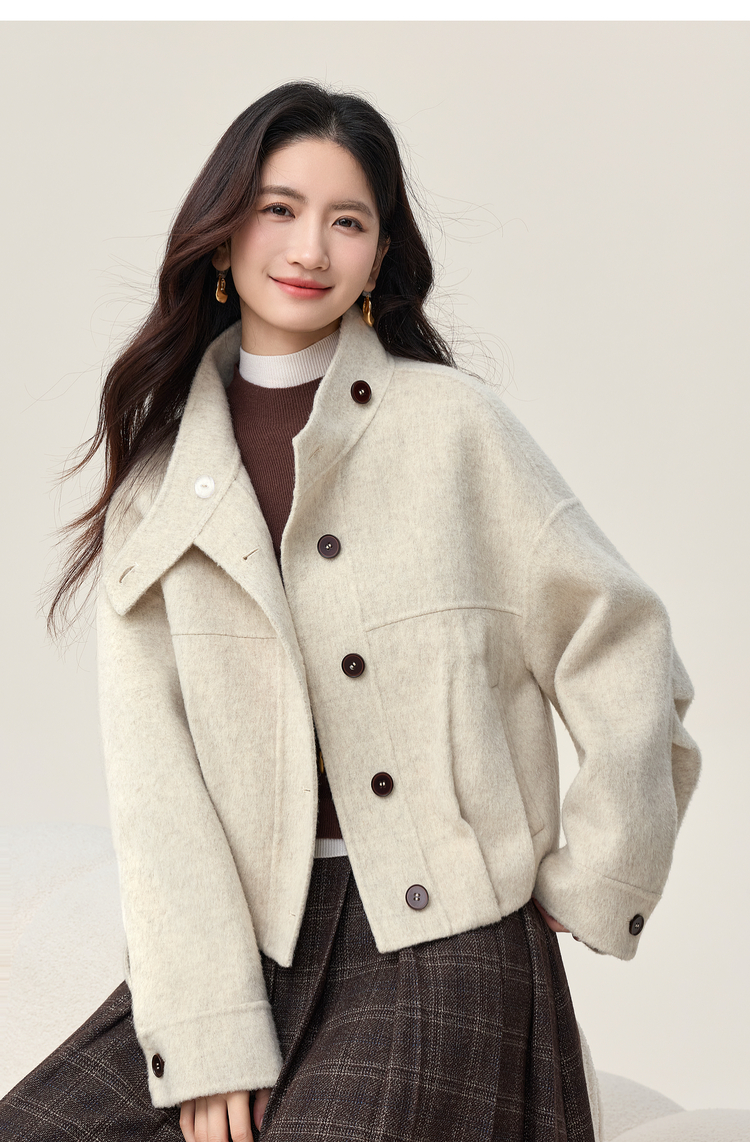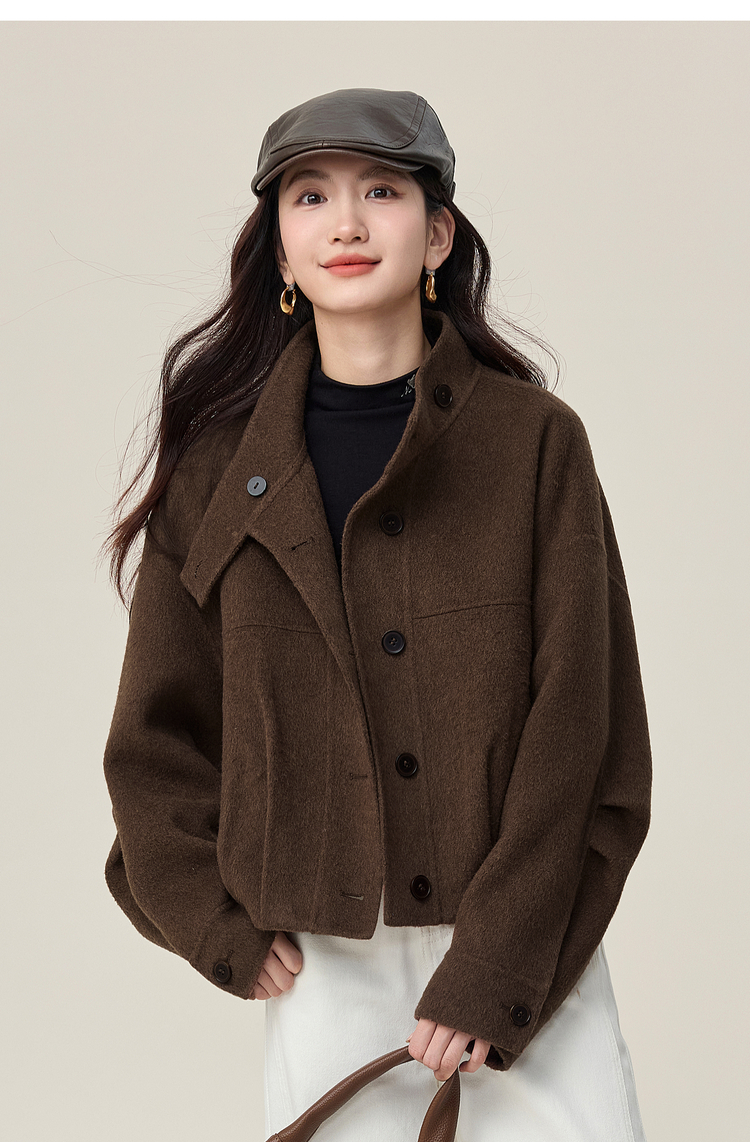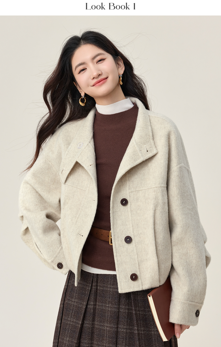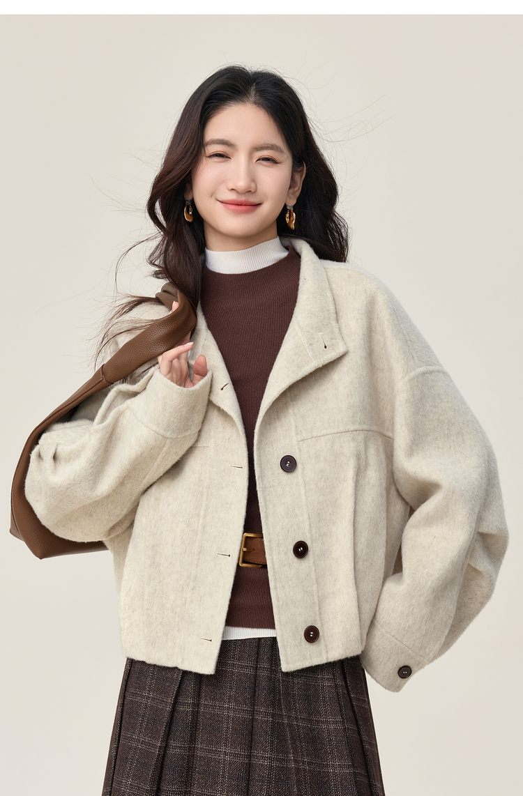 【10/23新品】熙世界巴恩风立领短款毛呢大衣女小个子冬女装休闲宽松纯羊毛外套