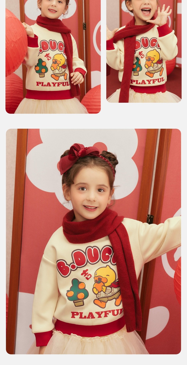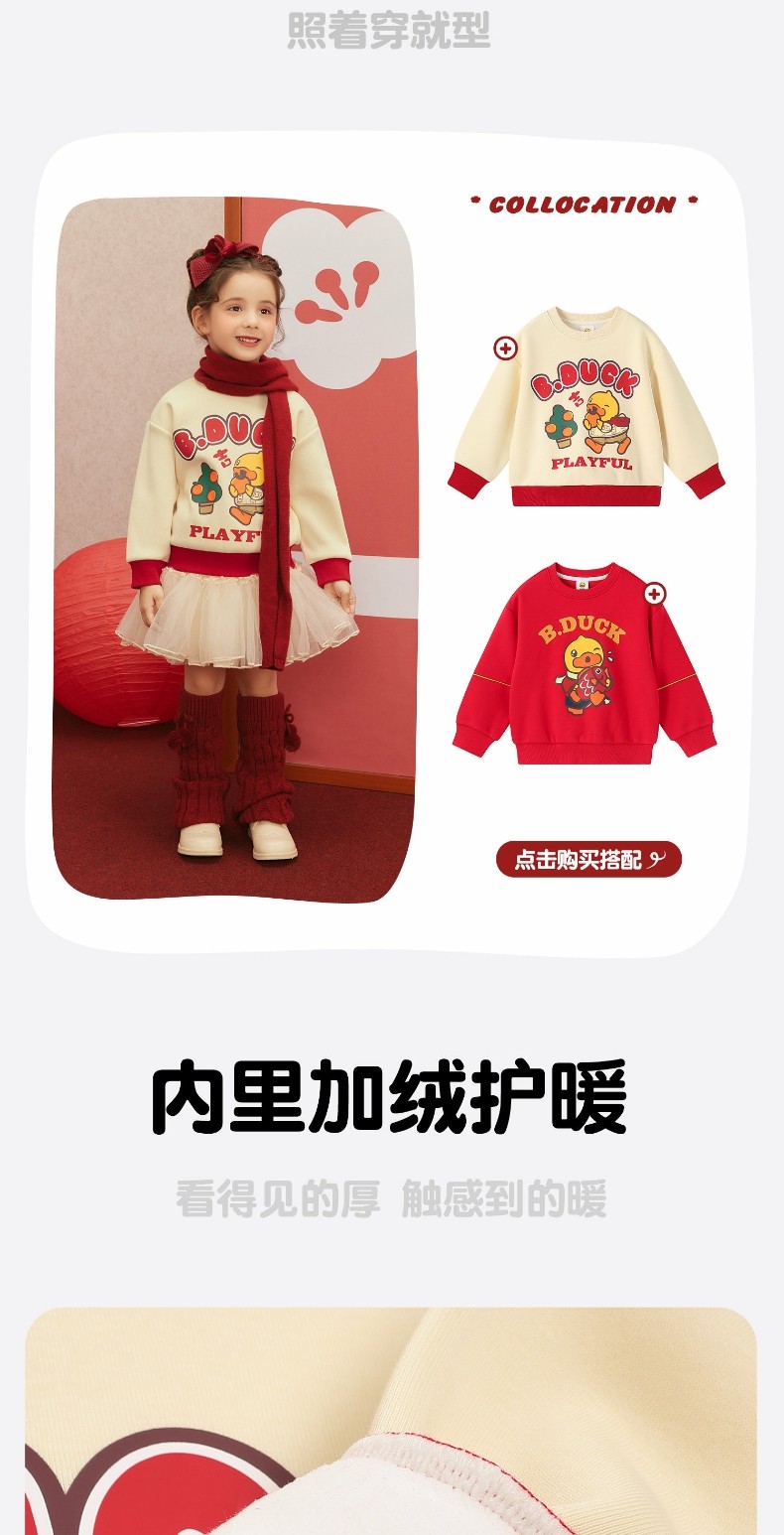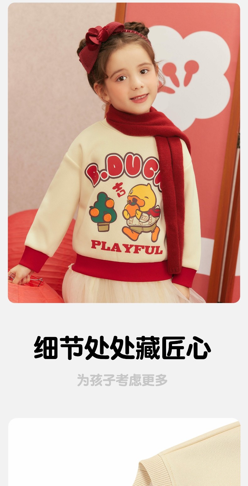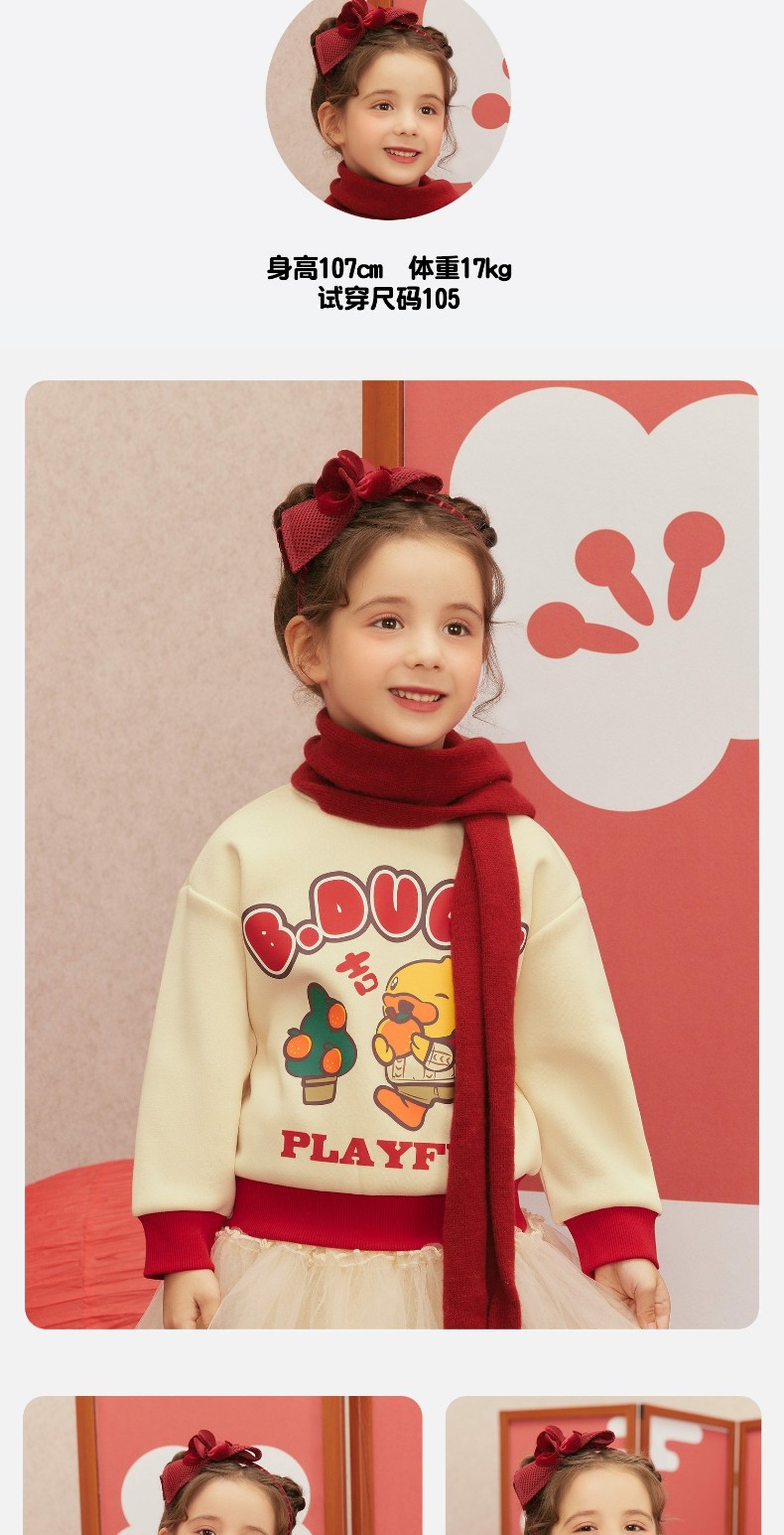 bduck小黄鸭童装冬季女童红色加绒卫衣套头衫新年冬装拜年服保暖上衣105-150 BF5531060
