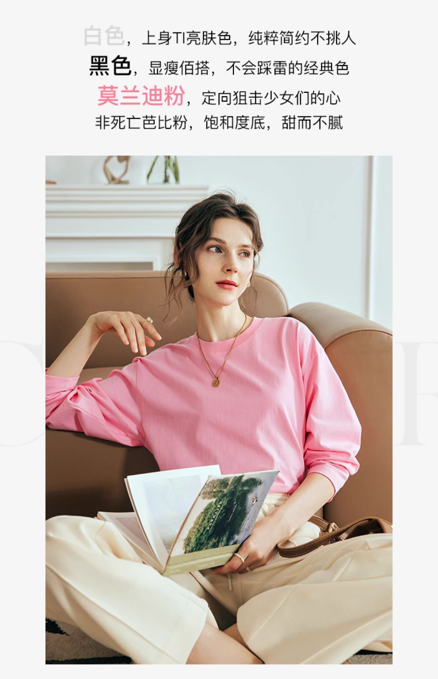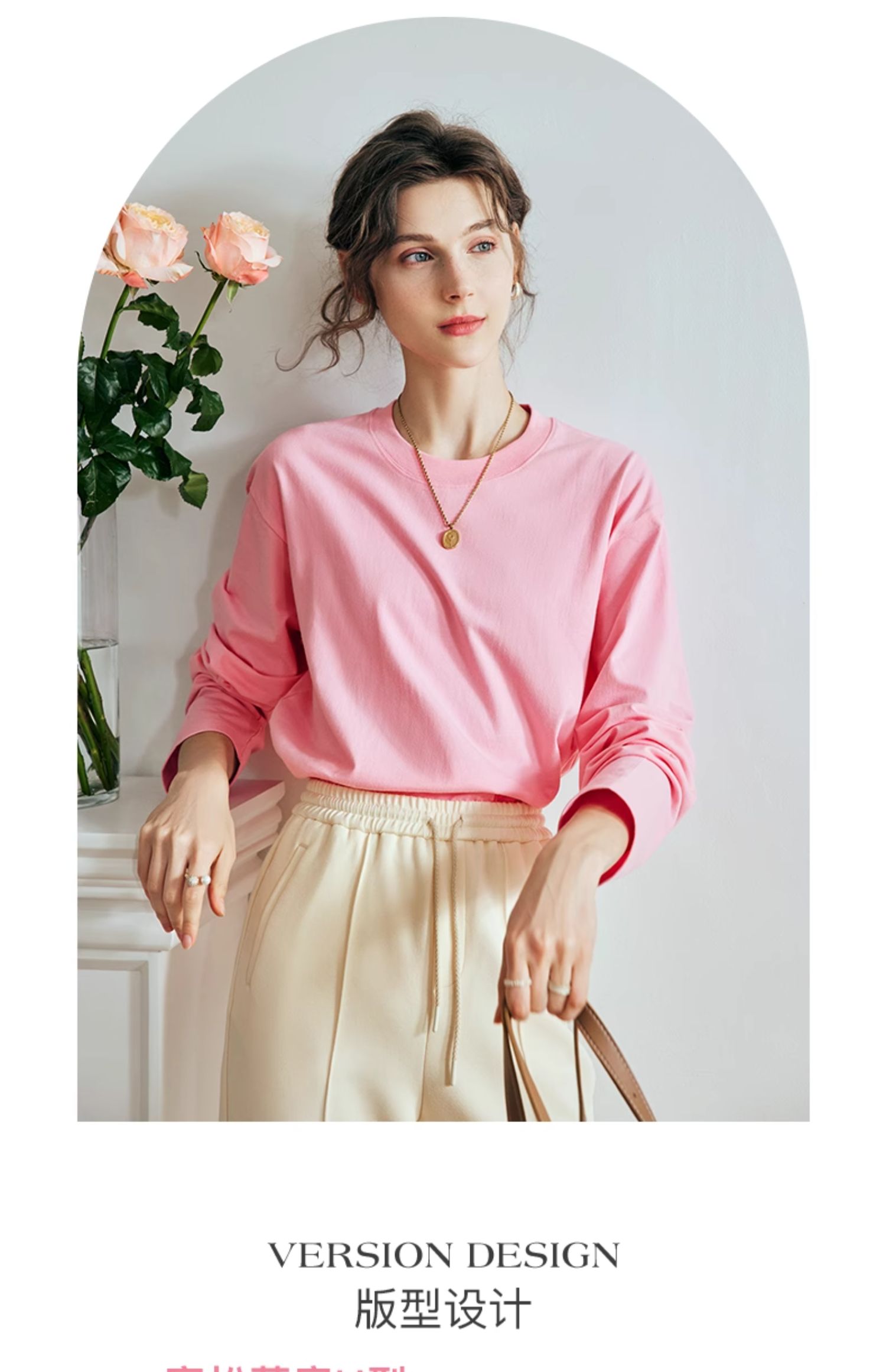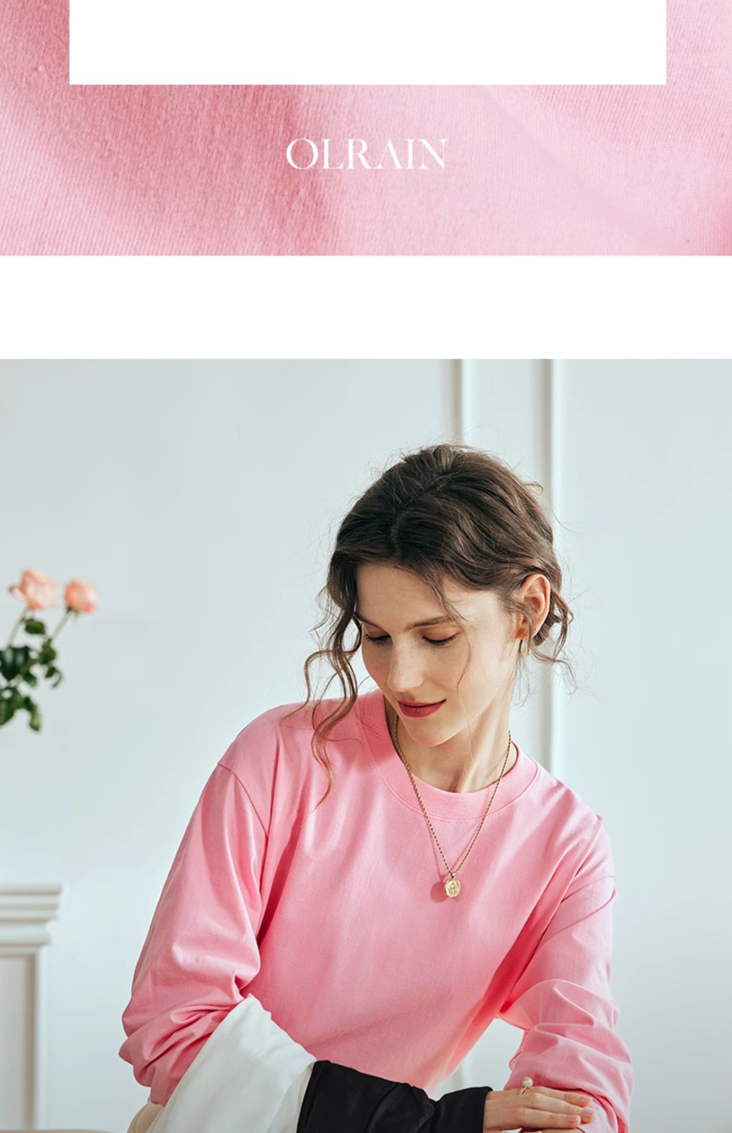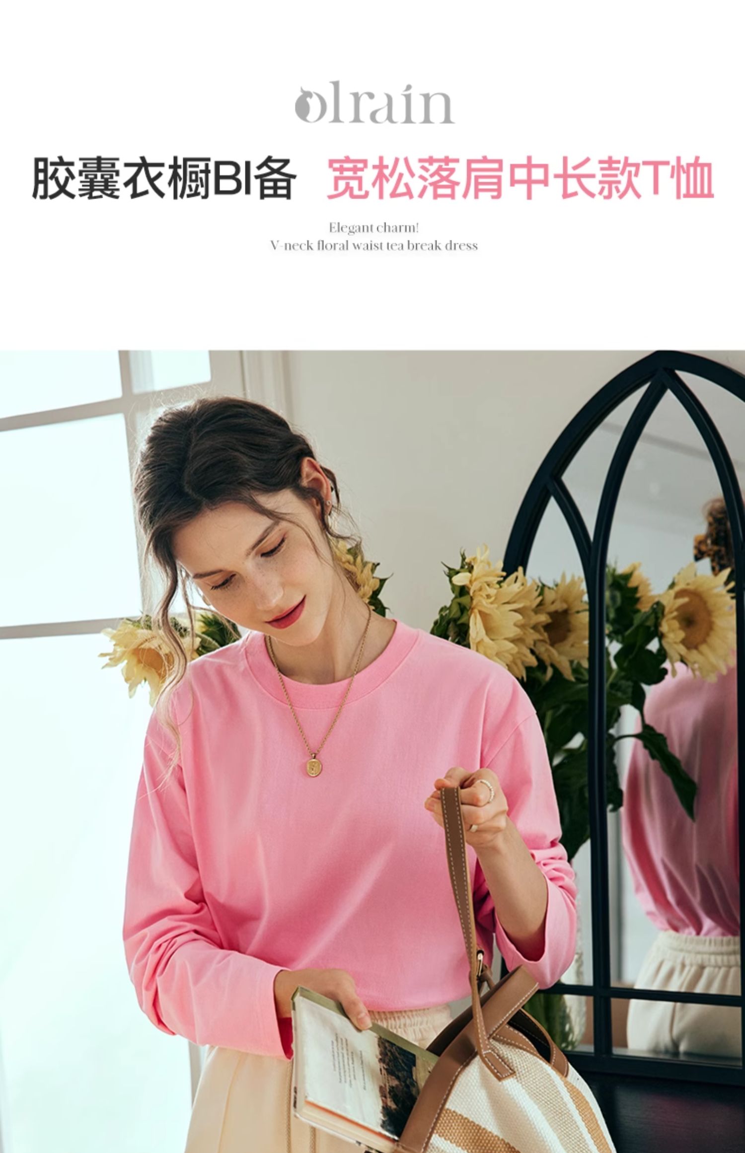 OLrain欧芮儿法式粉色长袖t恤女秋季2024年新款宽松休闲圆领上衣