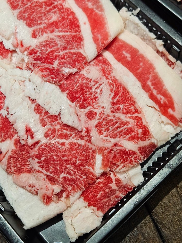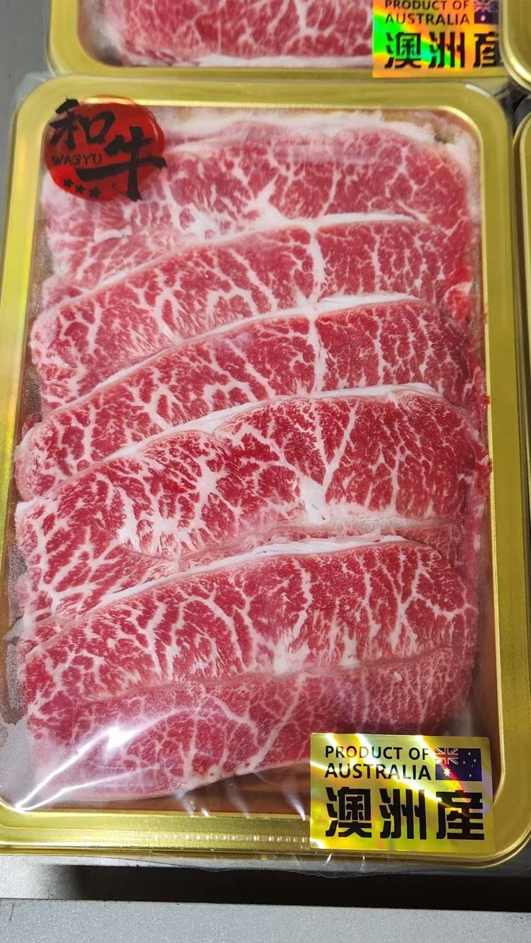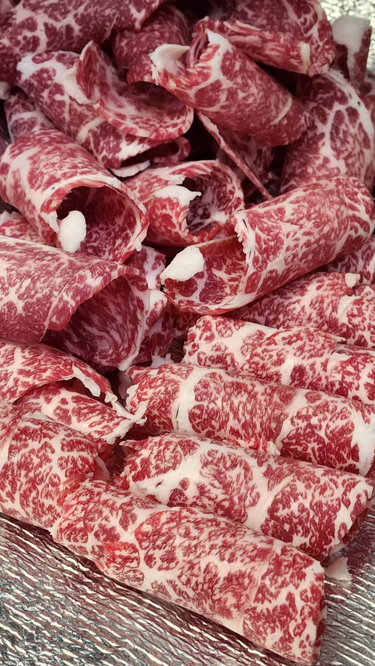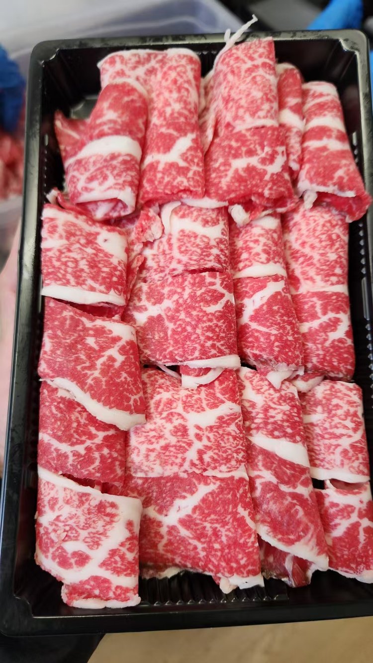 澳洲和牛精修胸腹肉,雪花达到M5级别,口感比肩牛小排,又香又嫩,更有一股清甜的奶香味,和牛性价比部位,肉质嫩、巨香,打造此款肉肉,原切薄片,取名为“霜降肥牛”火锅寿喜锅打边炉烤肉必选