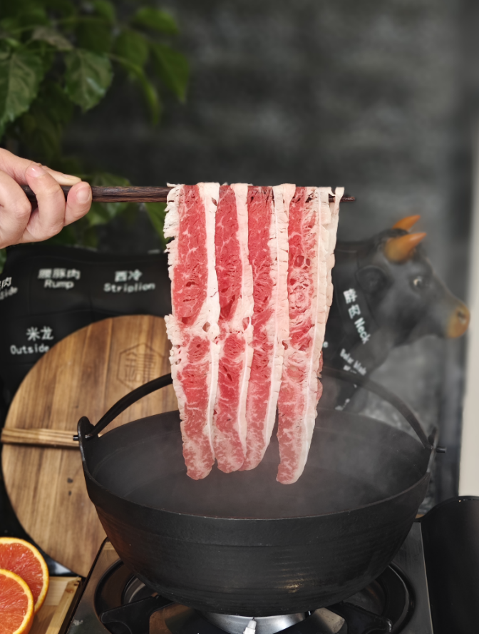 肉中有筋,筋络间又遍布着雪花纹理,没有成片的油脂,光瞅一眼就让人眼馋。有明显奶香,口感是筋脆脆的、肉嫩嫩的,完全不肥腻。适合煎、煮、炒、涮。