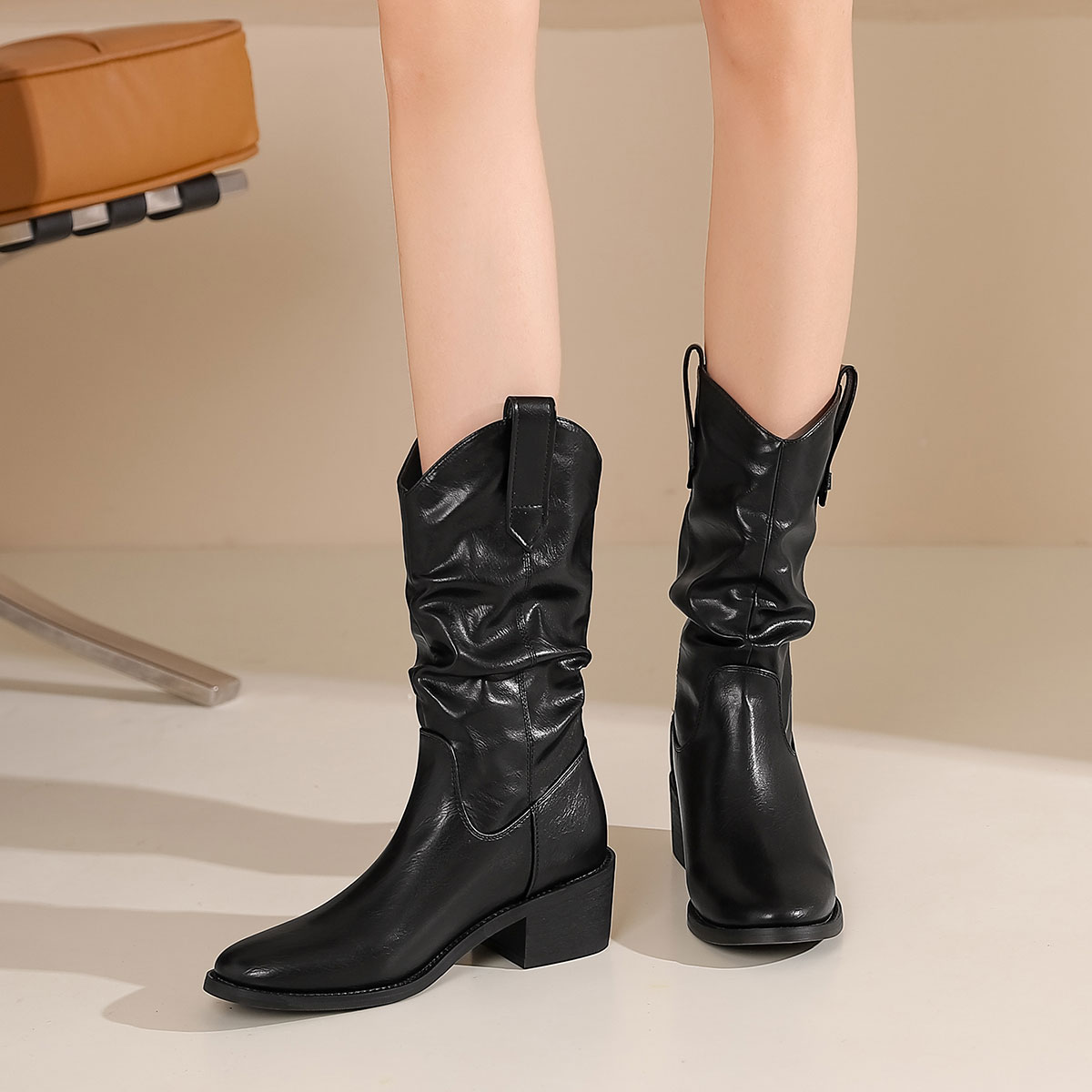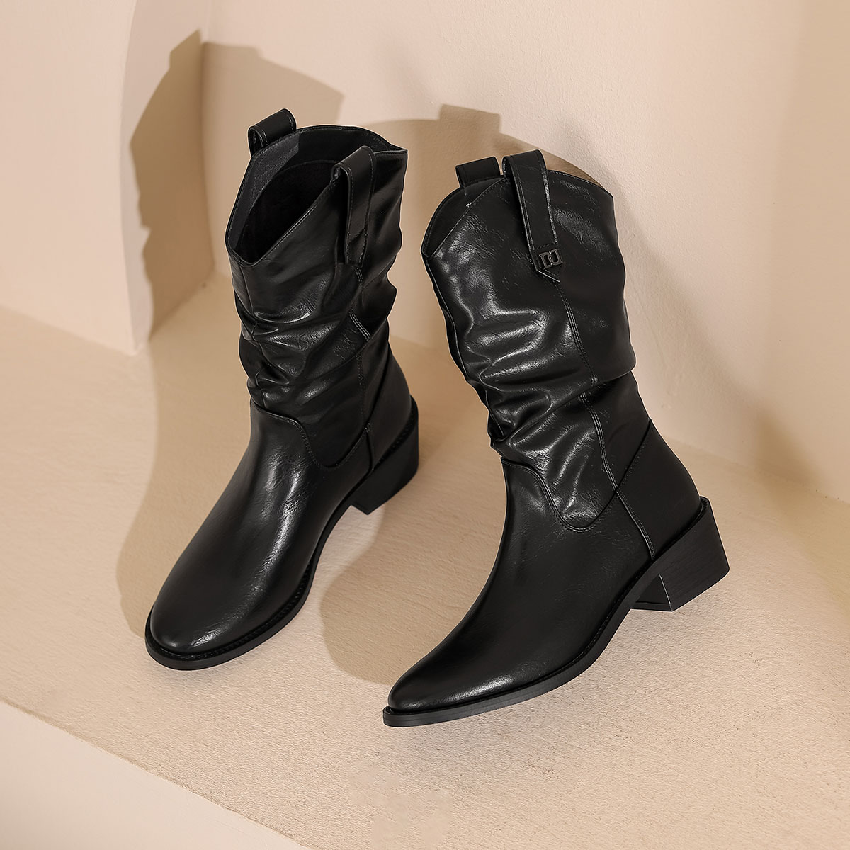 西村名物2024秋冬新款复古英伦风尖头粗跟褶皱美拉德中筒靴女T24DC46871