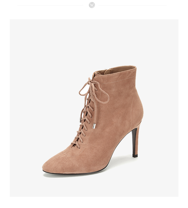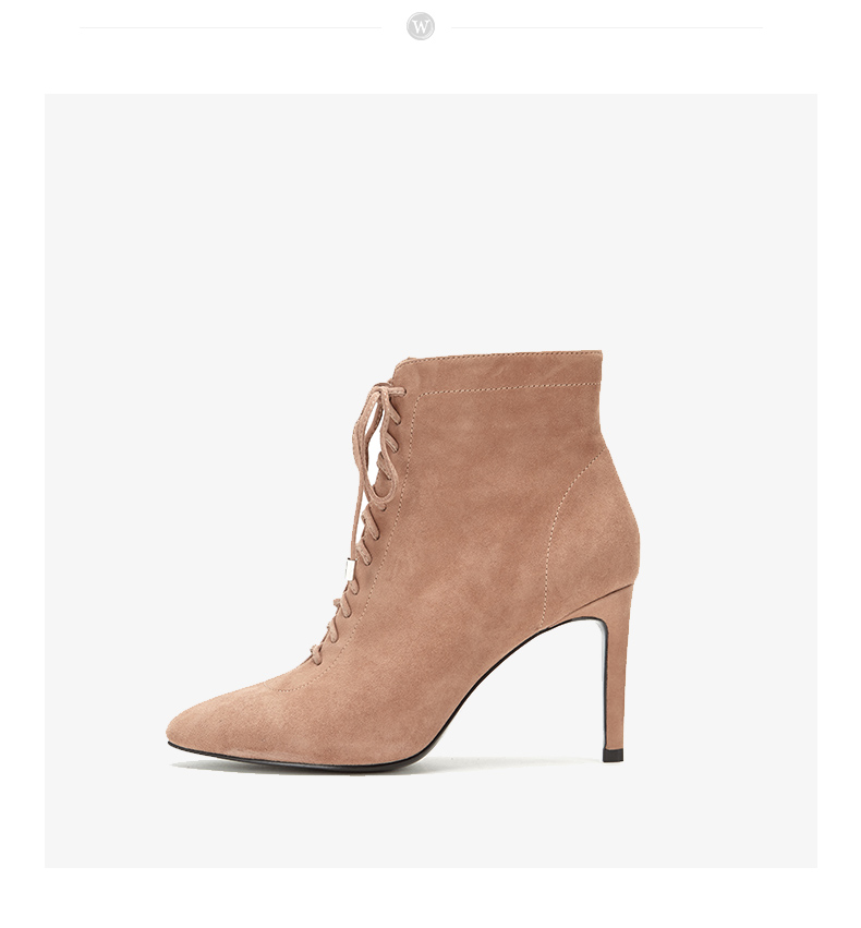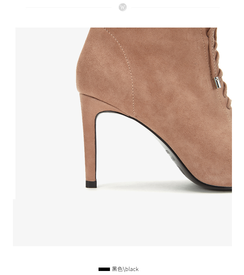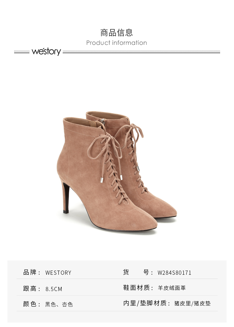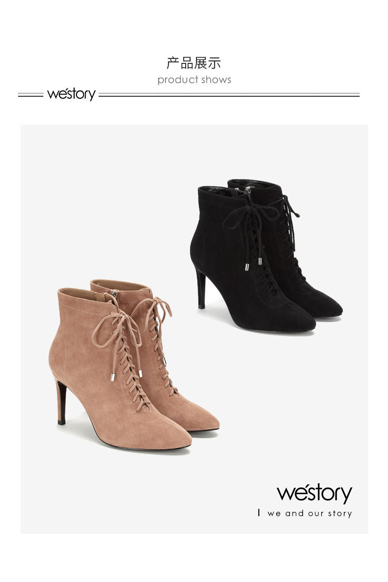 westory商场同款秋冬绒面系带时尚短靴高跟鞋尖头细跟女W284S80171