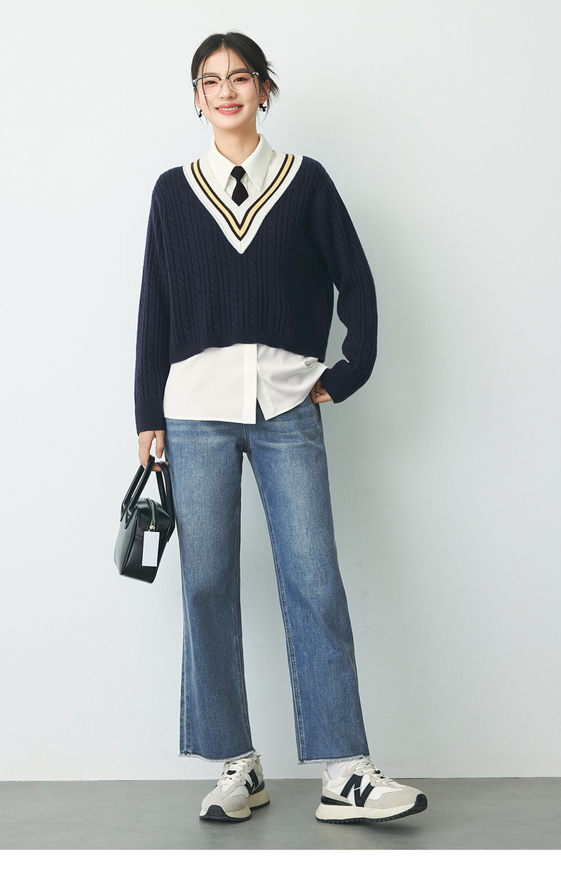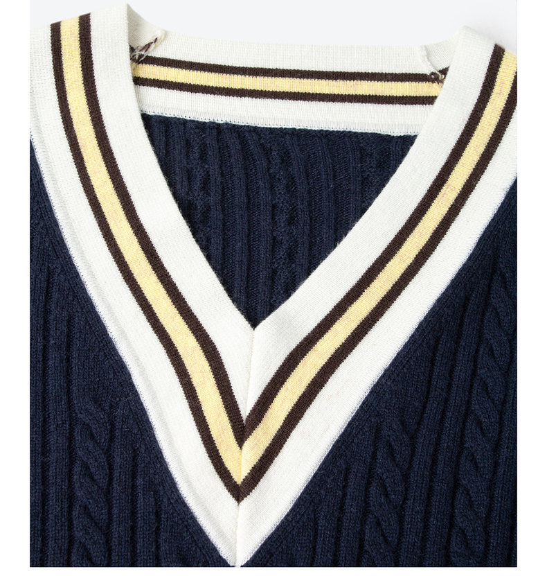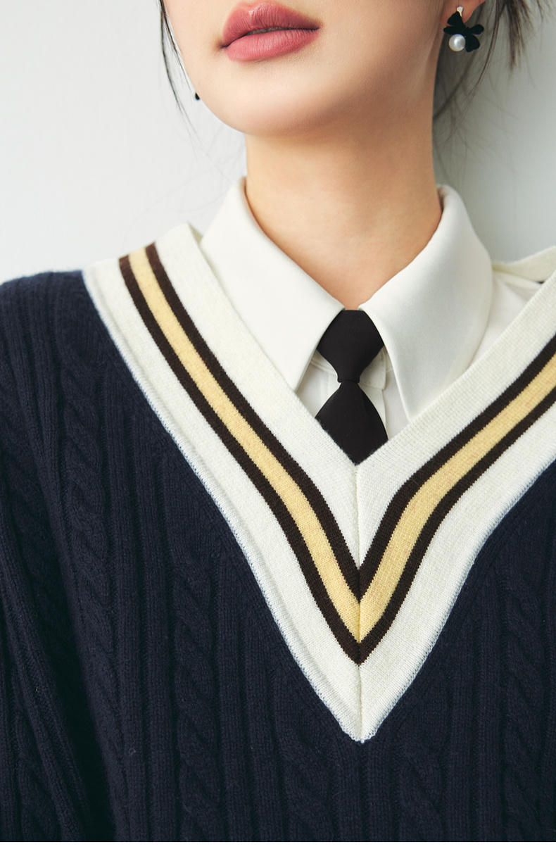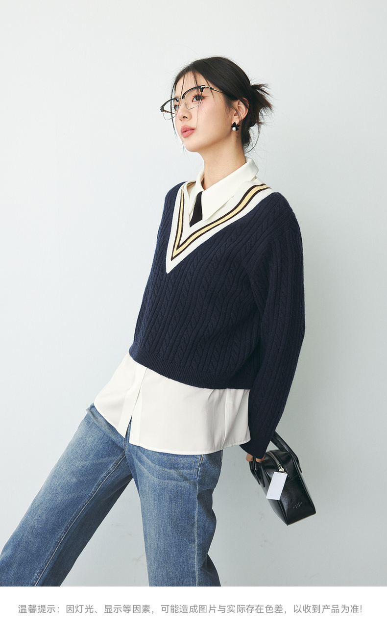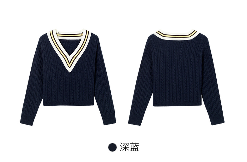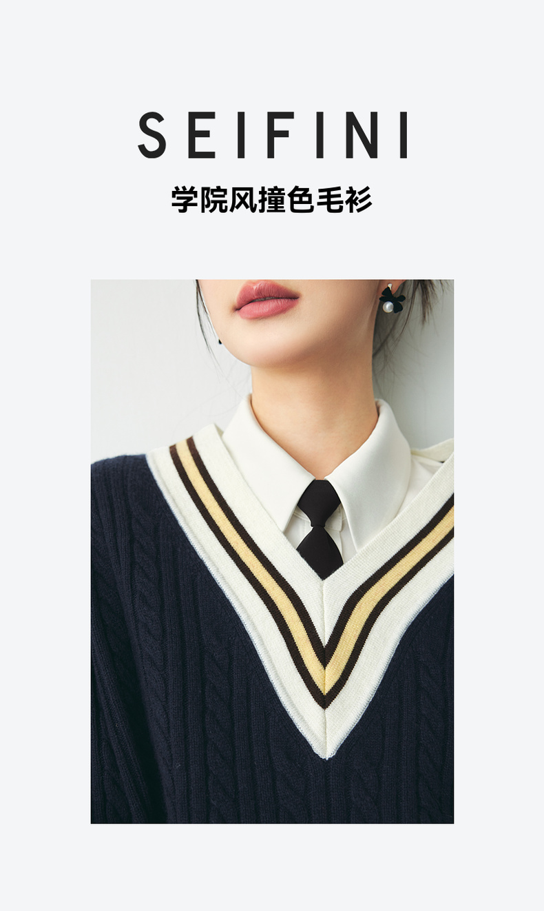 【严选】诗凡黎春大v领学院风撞色领边宽松直筒针织衫SF2330181