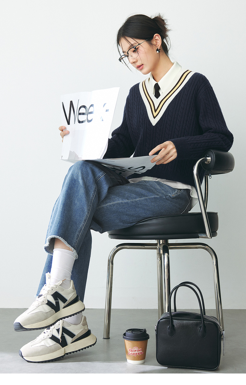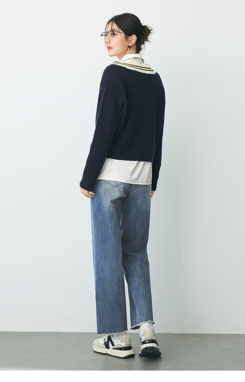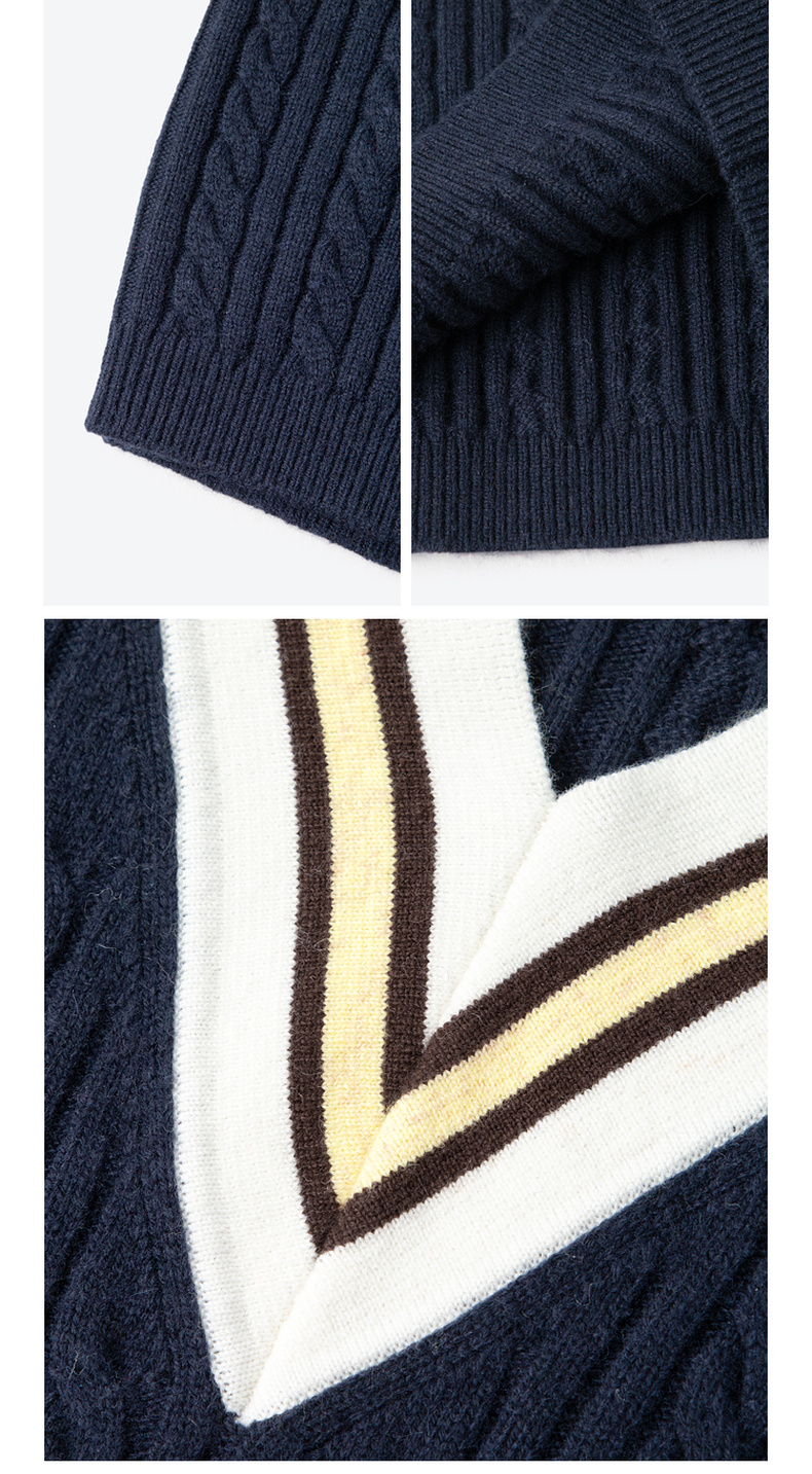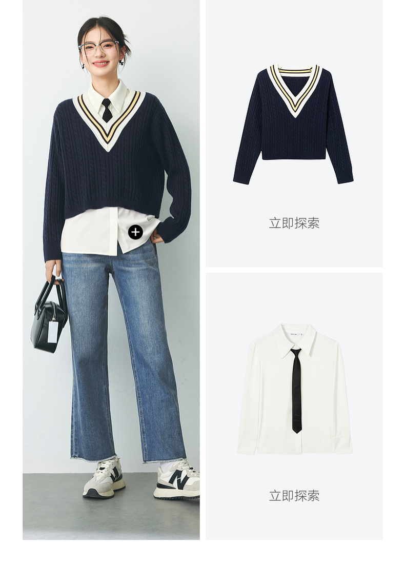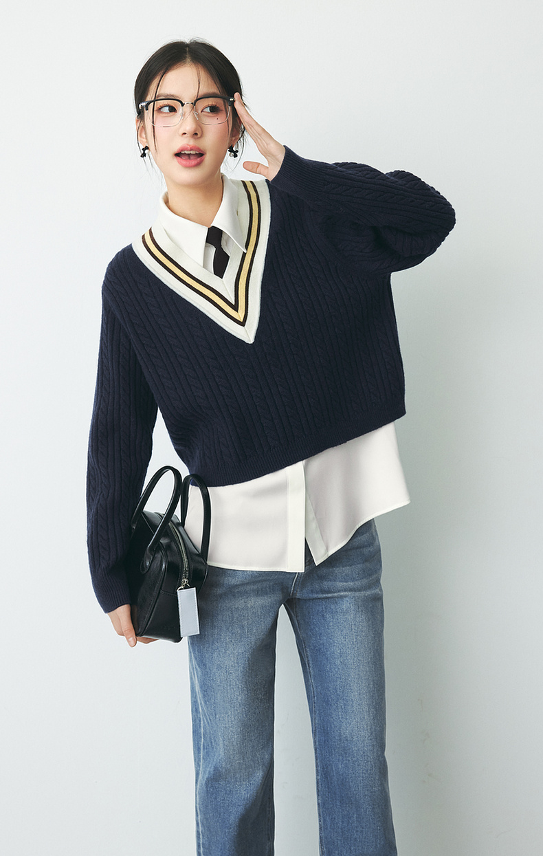 【严选】诗凡黎春大v领学院风撞色领边宽松直筒针织衫SF2330181