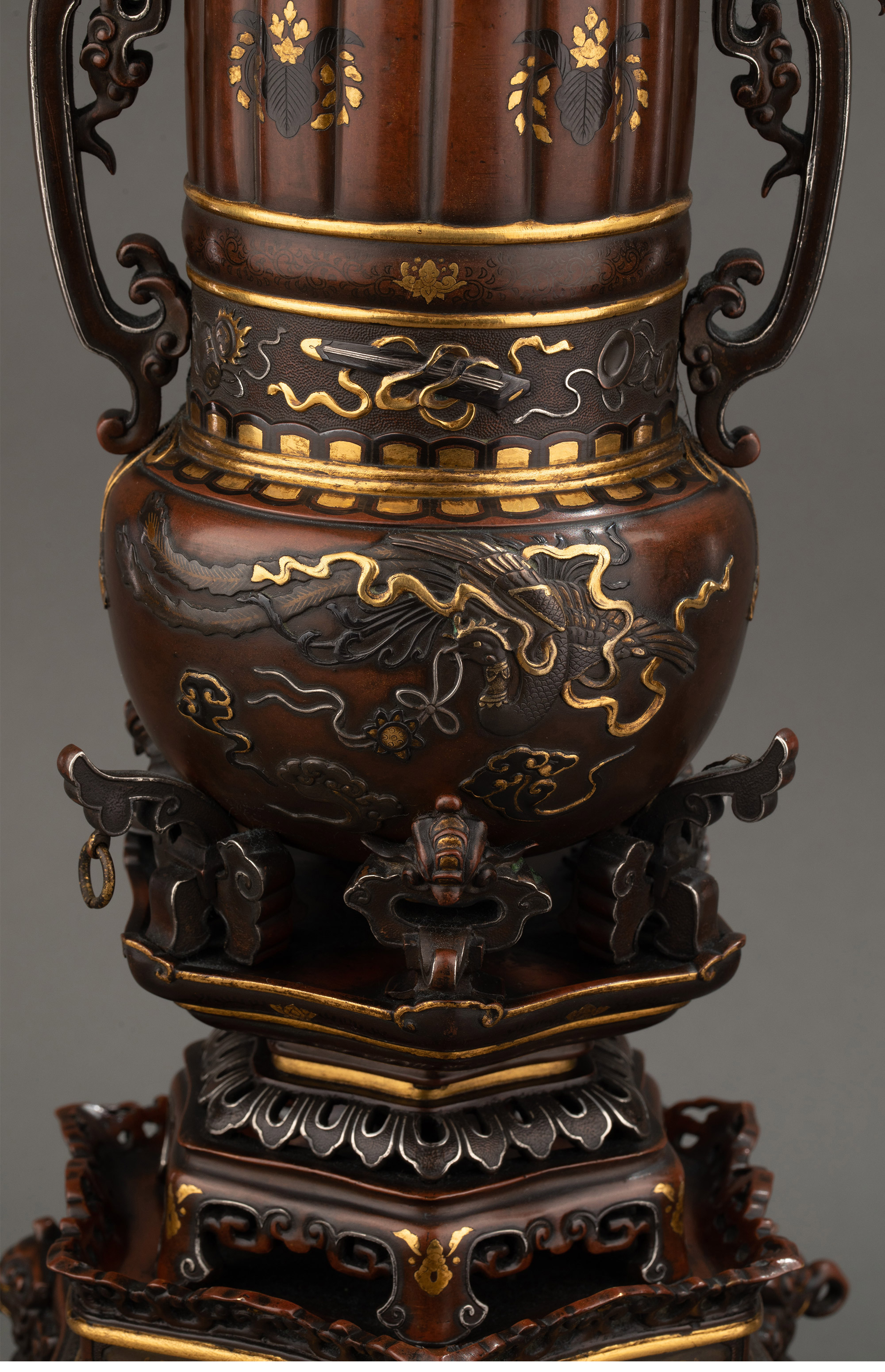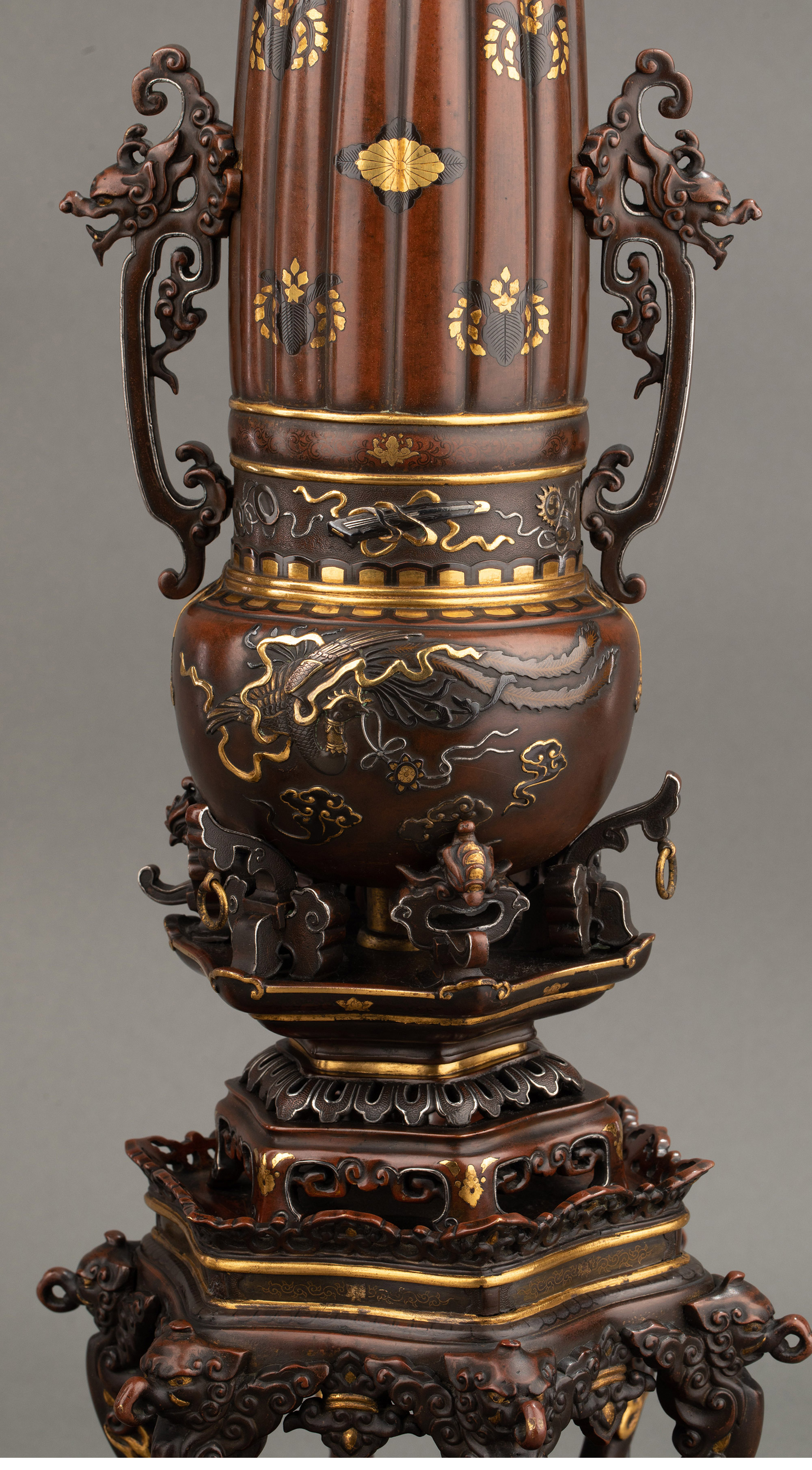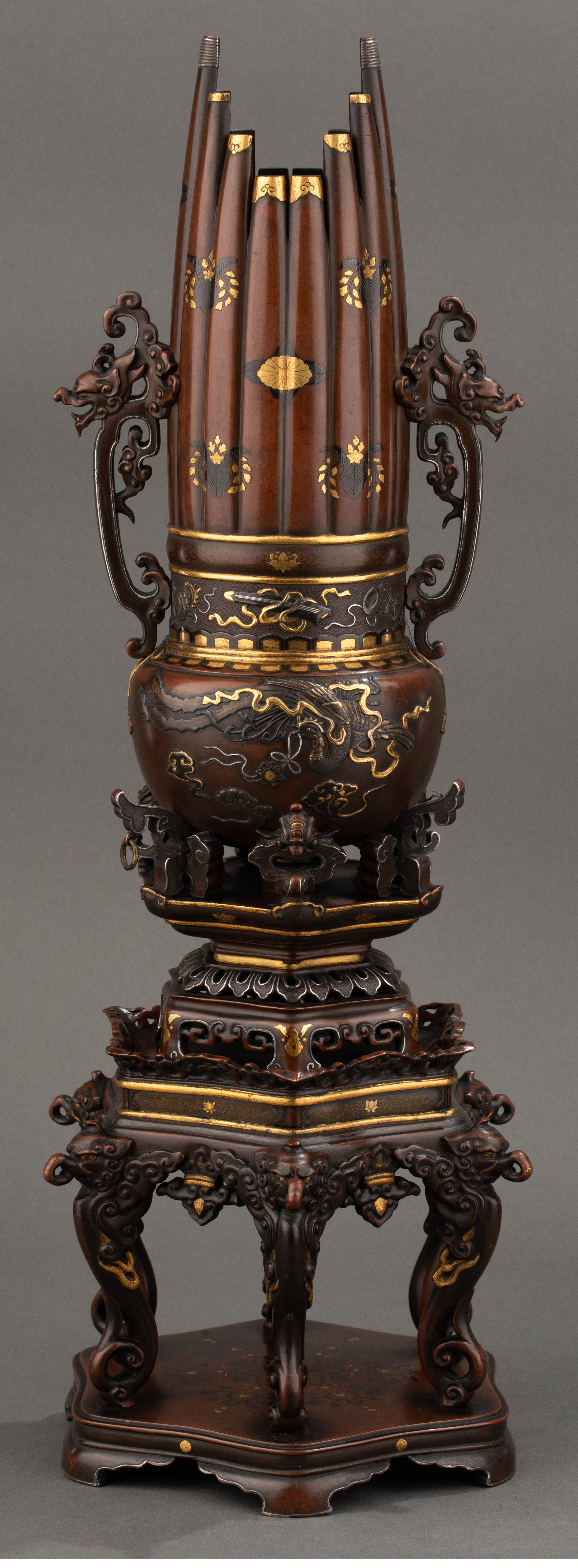 1890年代日本高冈铜器名大橋三右衛門出品「古笙」造型金银象嵌赤铜香炉