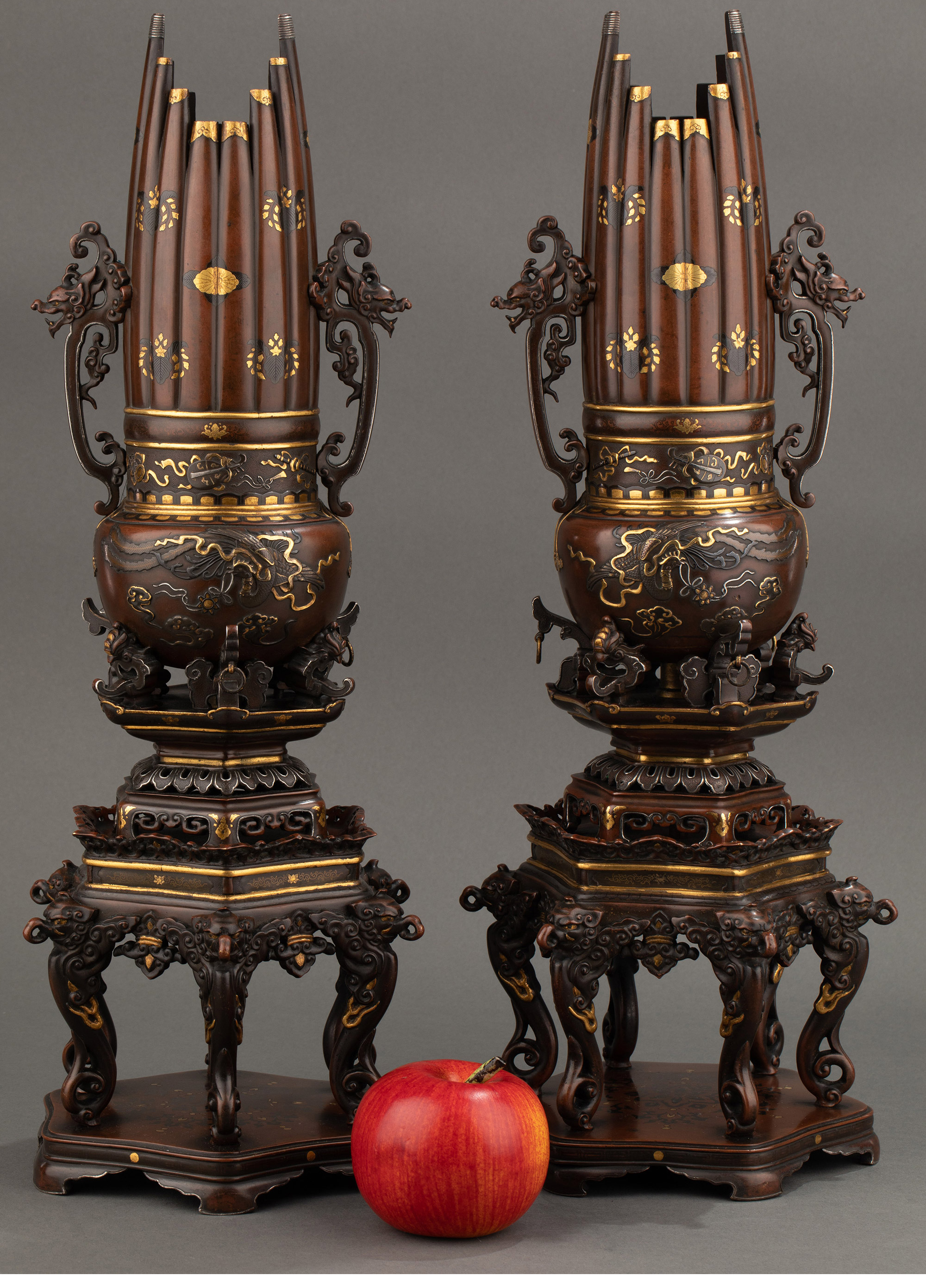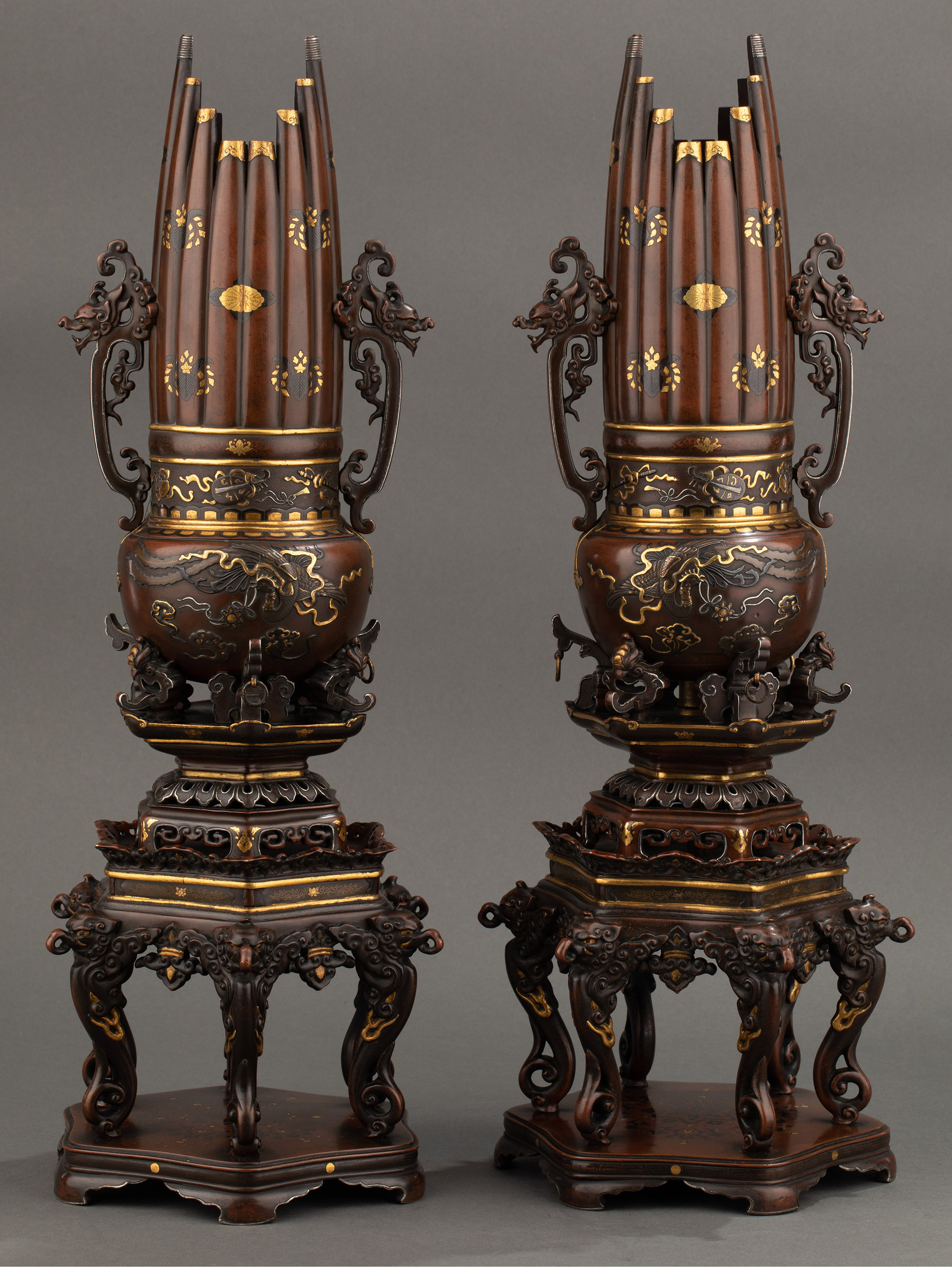 独角鹿西洋古董 1890年代日本高冈铜器名大橋三右衛門出品「古笙」造型金银象嵌赤铜香炉