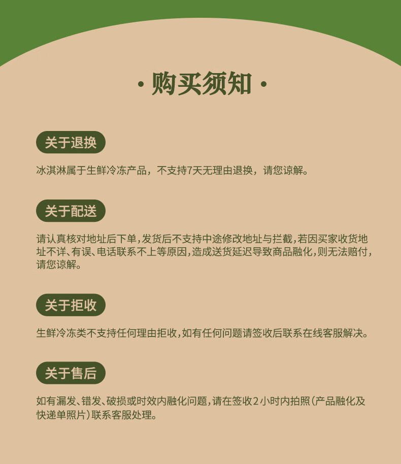 【关于售后赔】发货后如有破损融化,物流签收后24小时内,提供有效凭证即可。 1、 赔付时效说明:正常签收24h内,损坏产品一起拍照发给客服。 2、冰淇淋属于冷冻产品,出库之后无法进行退换货处理,不支持7天无理由退换货。一旦发货,不接受退货、拒收、修改地址。 3、个人保存不当导致质量问题,不是售后理由,不在售后范围。 4、因客户延迟签收、拒收、电话停机、无人接听、收件信息错误、收件地址不详等客户自身原因导致的冰淇淋融化不在赔付范围内。