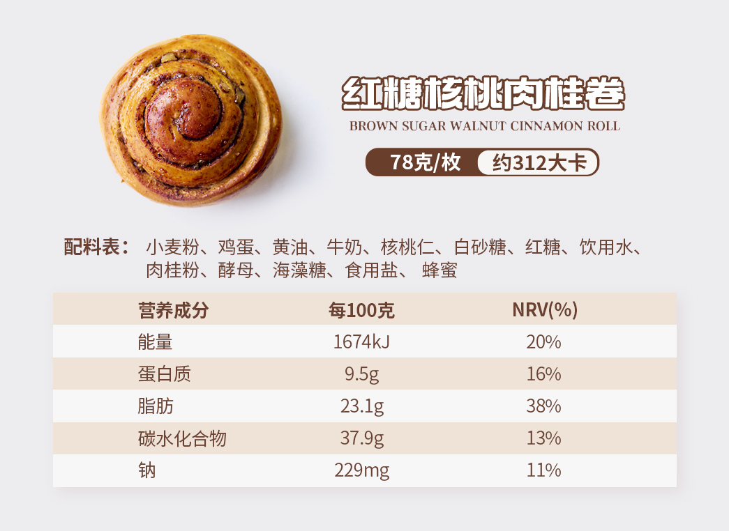【配料表】:小麦粉、鸡蛋、黄油、牛奶、核桃仁、白砂糖、红糖、饮用水、肉桂粉、酵母、海藻糖、食用盐、蜂蜜
