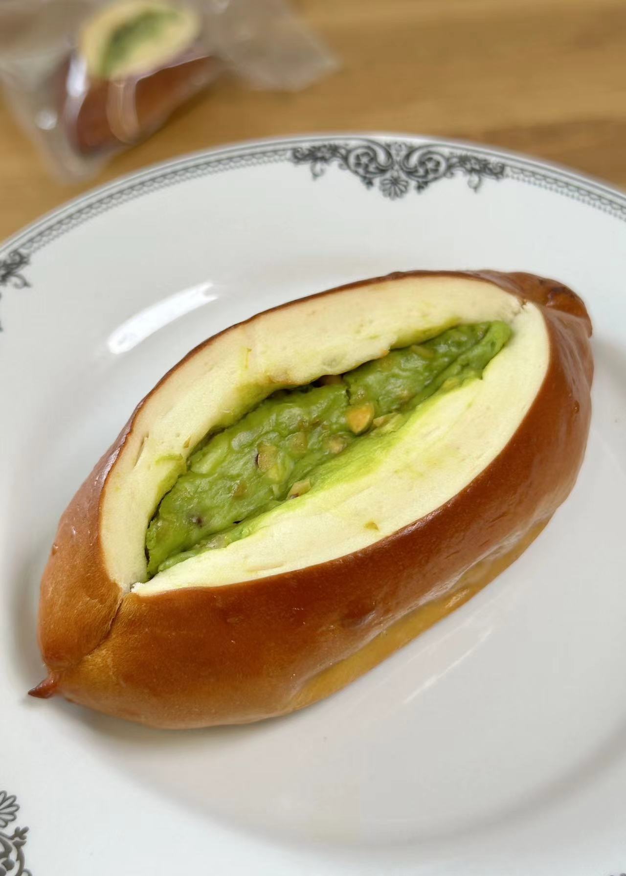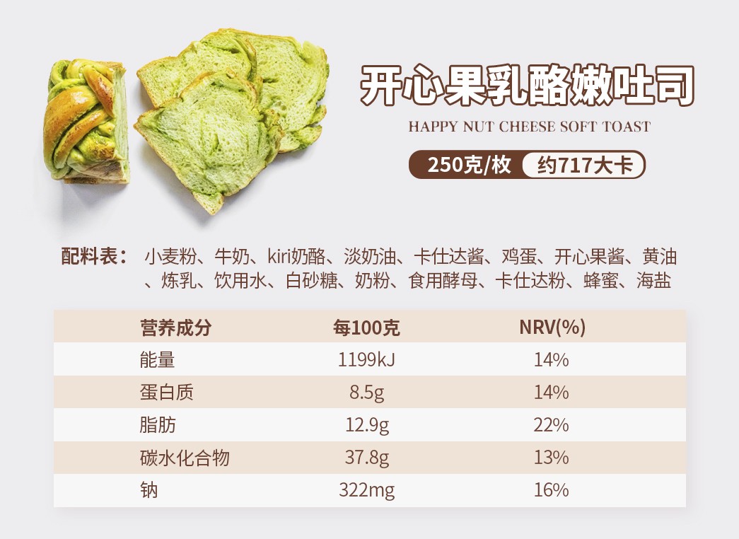 【配料表】:小麦粉、饮用水、奶酪、海藻糖、开心果仁碎、开心果酱、食用盐、酵母、烘焙碱
