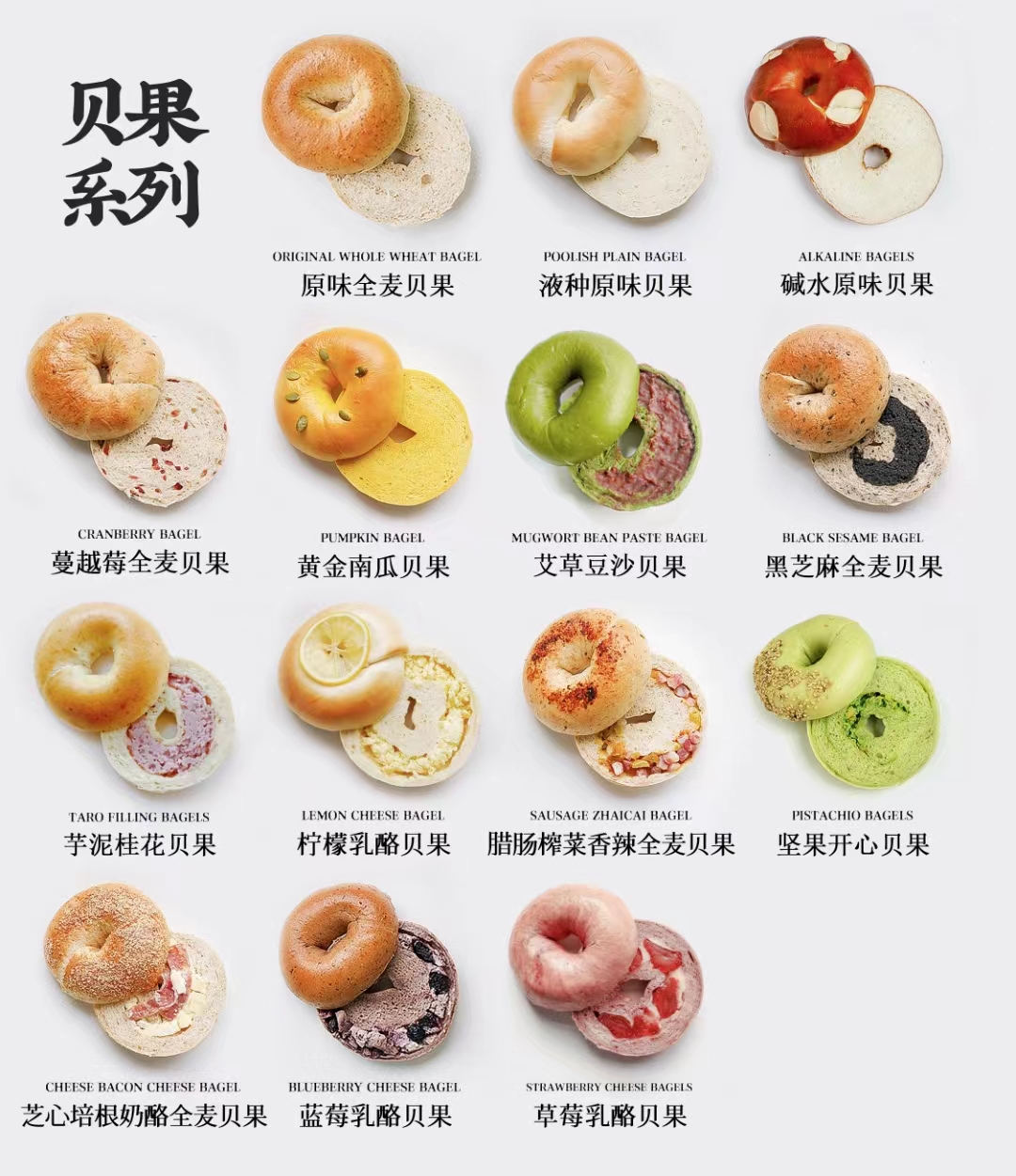 【口味】:全麦原味、液种原味、蔓越莓、南瓜、黑芝麻、蓝莓乳酪、柠檬乳酪、腊肠榨菜、芝心培根、坚果开心贝果、碱水原味贝果、草莓乳酪贝果、芋泥桂花贝果、 香菜沙茶牛肉丸贝果