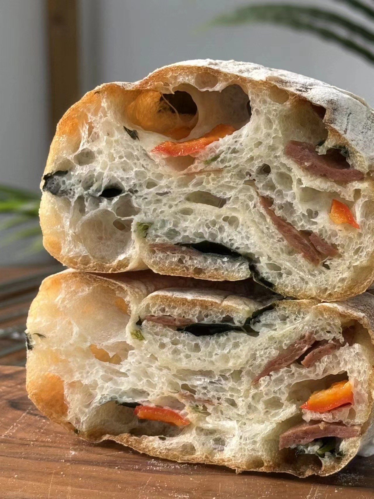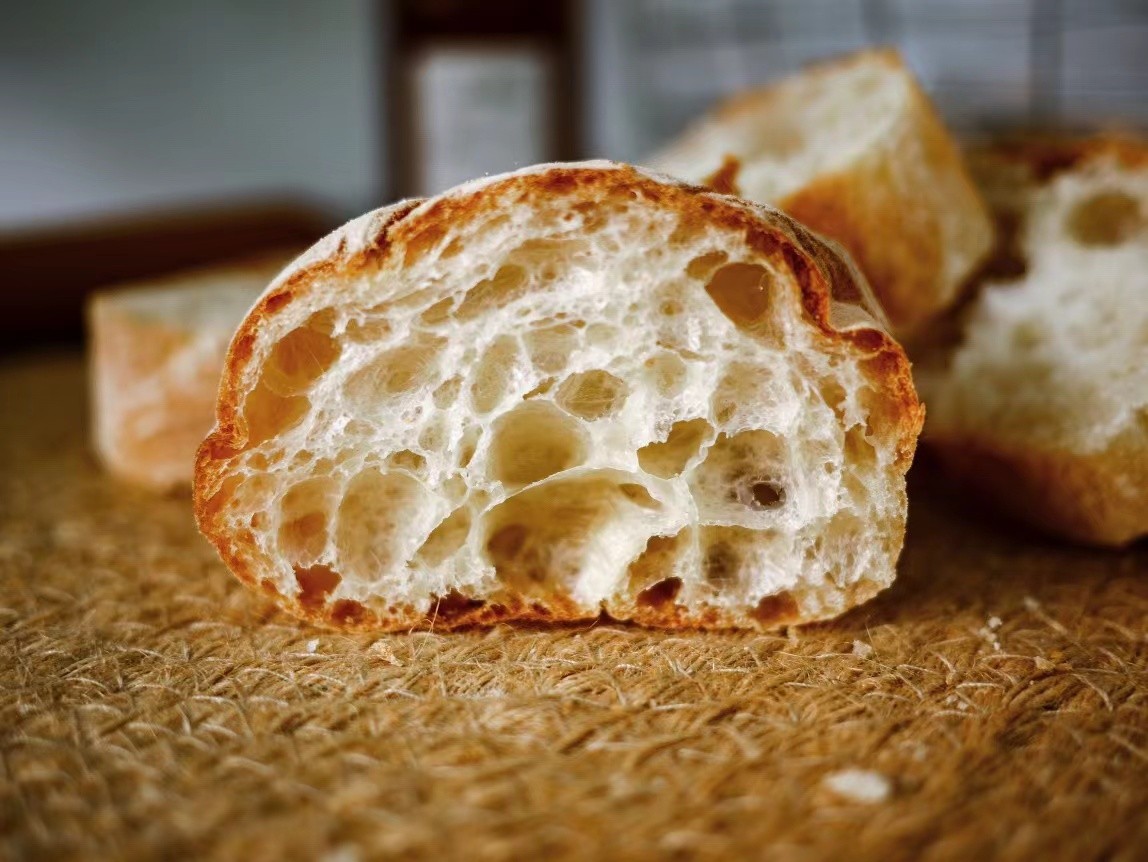 造型长长扁扁,切面充满不规则的气泡,表皮香脆内里柔软,复烤后还能再现香脆的表皮,非常受欢迎