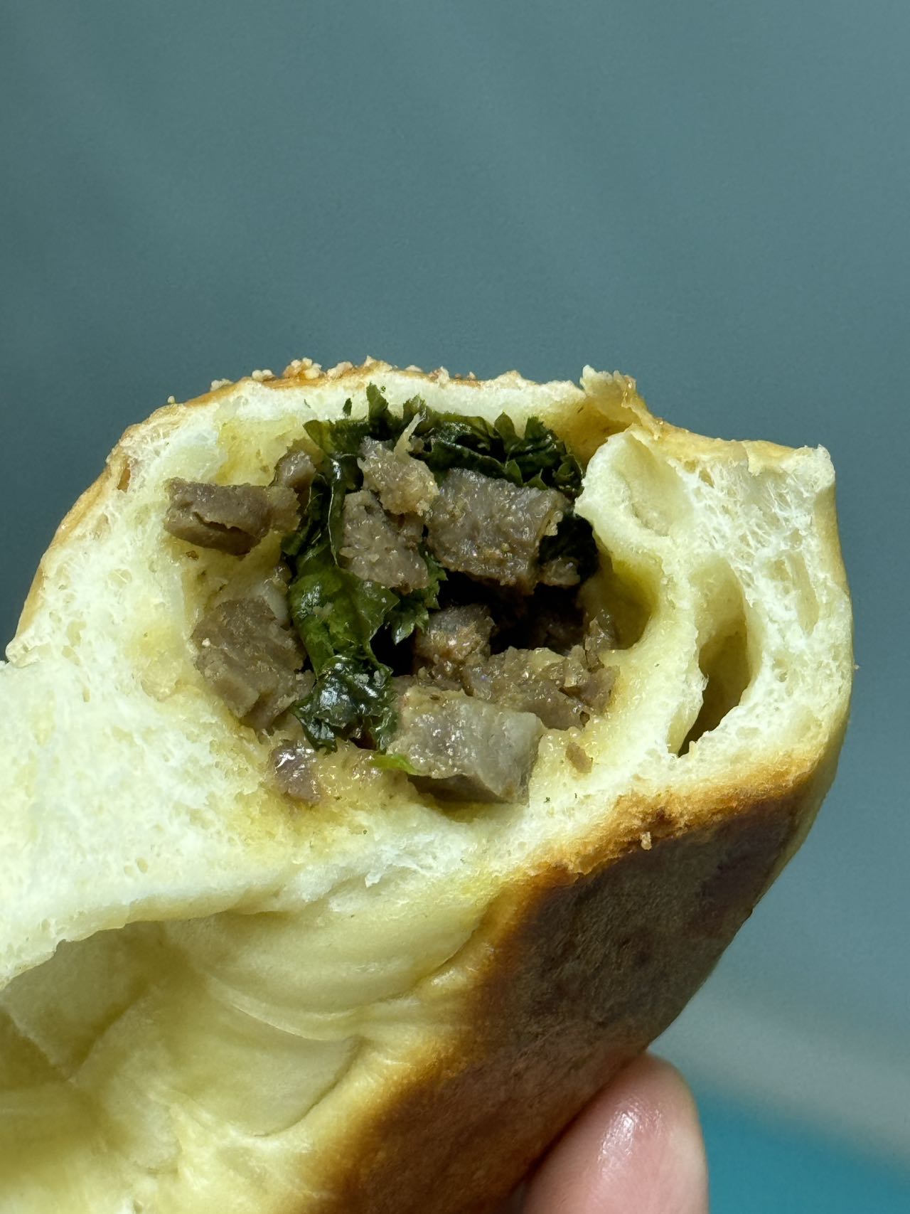 软糯的米面包裹着新疆辣皮子,辣味温和带果香,混着酥脆猪肉松,咸香微辣!真的只是微微辣哦!新疆辣皮子的特点是肉厚吃起来软糯,带回甜,不是刺激性很强的那种辣。偶有红油微微渗出(介意慎拍),但油润不噎,越嚼越上头。