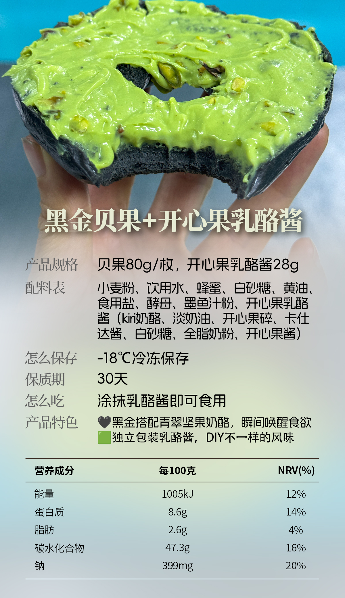 收到可以常温直接吃,或者放冷冻保存,解冻后涂抹乳酪酱,直接吃。(若将黑金贝果趁热切开,让微融的奶酪裹住坚果碎,冷馅与热面包交融出类似熔岩流心的诱惑感,坚果香随温度升腾,穿透麦香直抵鼻腔。)无添加,吃不完放需放零下18度冷冻保存