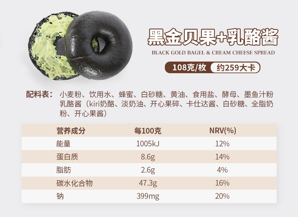 黑芝麻贝果配料:小麦粉、全麦粉、饮用水、黑芝麻、脱脂奶粉、黄油、奶酪、纯牛奶、炼乳、赤藓糖醇、酵母、食用盐。