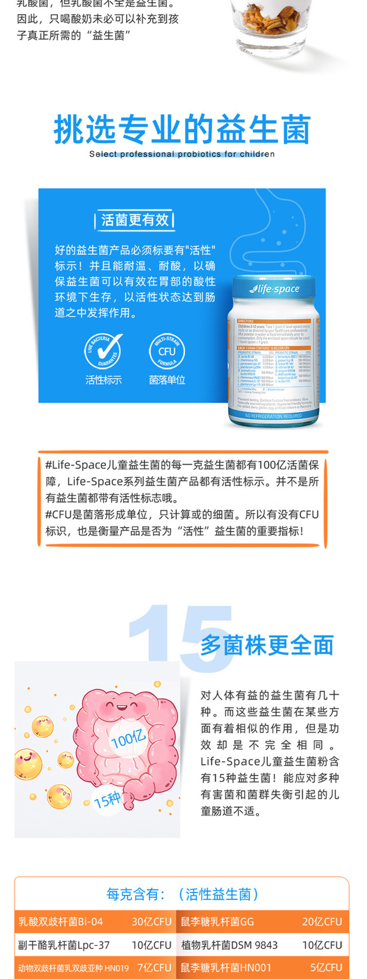 活菌数达百亿,菌株选对了,保证菌株的高活性也很重要,LifeSpace儿童益生菌粉里除了有15种菌株外,活菌数高达100亿CFU/g,同时还添加针对性菌株,缓解儿童感冒及营养不良的问题,含益生元可促进有益菌生长,无添加麸质或防腐剂,除感冒、急性肠胃炎、挑食营养不良外,便秘or腹泻以及爱吃零食的宝宝也可以安排。