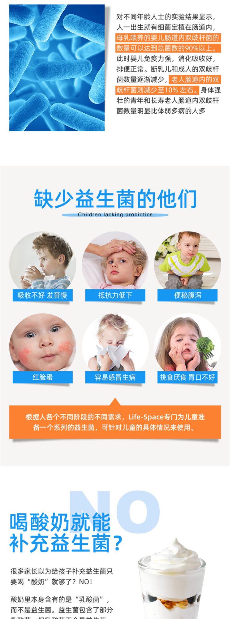 3-12岁的孩子经常接触外界,容易受外界病菌的影响,加上现在又各种yq病毒,从而导致肠道菌群失衡,抵抗力下降,容易感染病毒拉肚子,严重时还会引起胃肠炎,还有一些潜藏在食物里的“隐性污染-食品添加剂,抗生素等”不易察觉,以上这些情况,儿科医生以及育儿专家们都会建议用益生菌来调理肠胃,益生菌不单单可以可以调节宝宝肠胃,还可以提高自身的抵抗力哦!