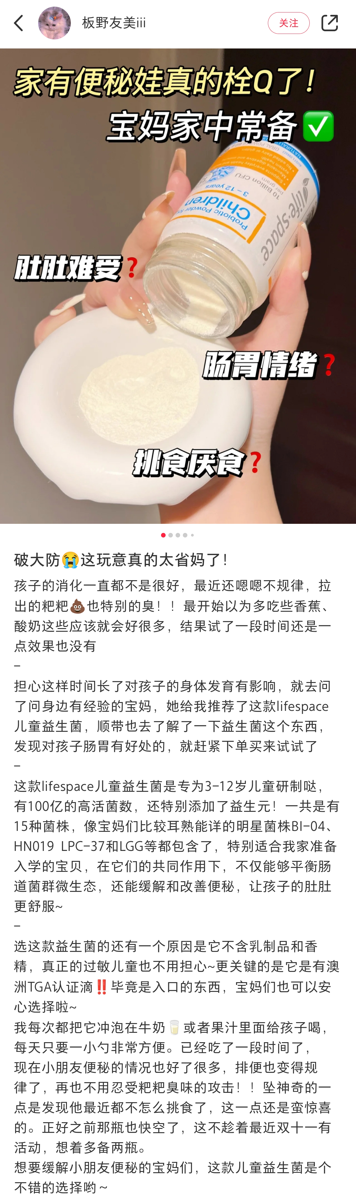 今天给大家推荐一款在母婴圈里口碑很好的益生菌—《Life Space儿童益生菌粉》澳洲销量领先的专业益生菌品牌,肠道健康小卫士是它没错!它家的益生菌这么受到妈妈们的信赖,靠的是其实打实的品质哦。