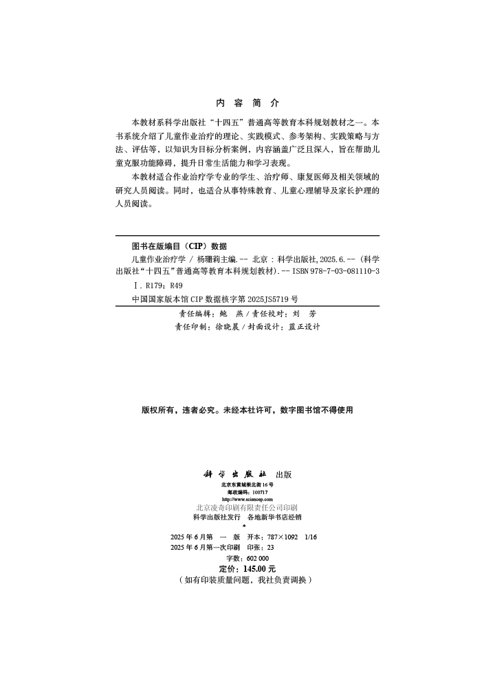 儿童作业治疗学 杨珊莉 主编 系统介绍了儿童作业治疗的理论 实践模式 参考架构 实践策略与方法 评估等 9787030811103科学出版社