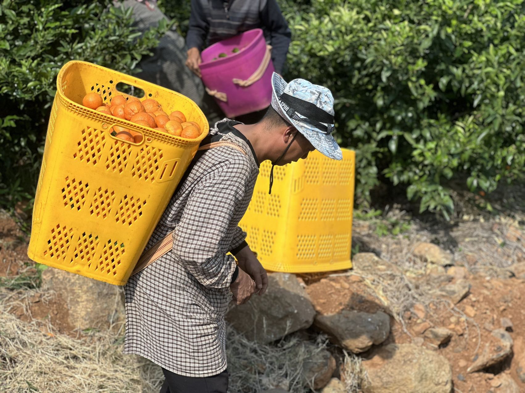 果农用背篓丈量着崎岖的山路
