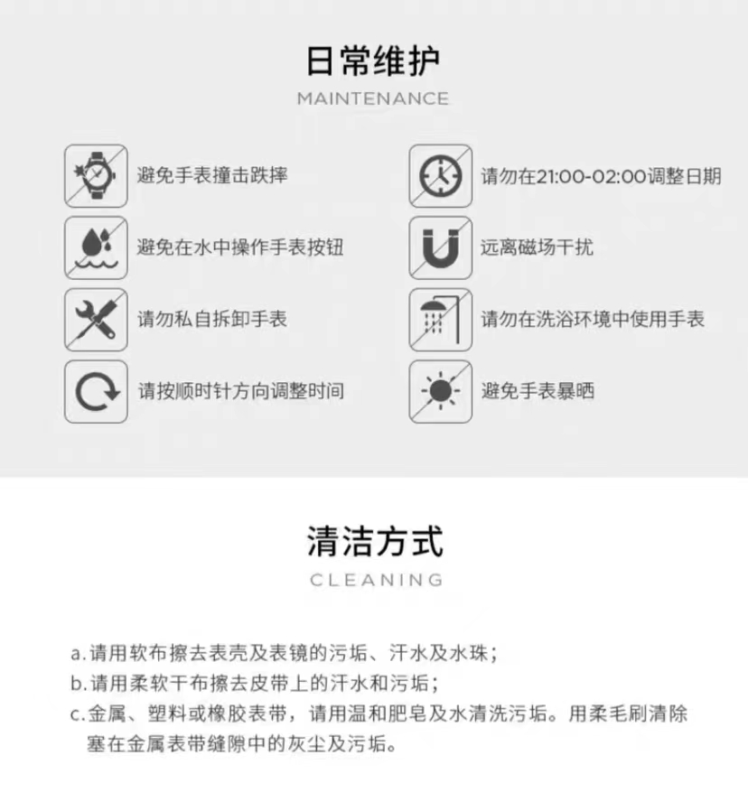手表提供自购买之日起机芯质保1年服务,掉钻可以免费维修1年。质保不含:表壳,表面,表带(表链)的材料 或工艺缺陷人为导致缺乏养护,事故或正常磨损而导致的损坏,由水引起的损坏。