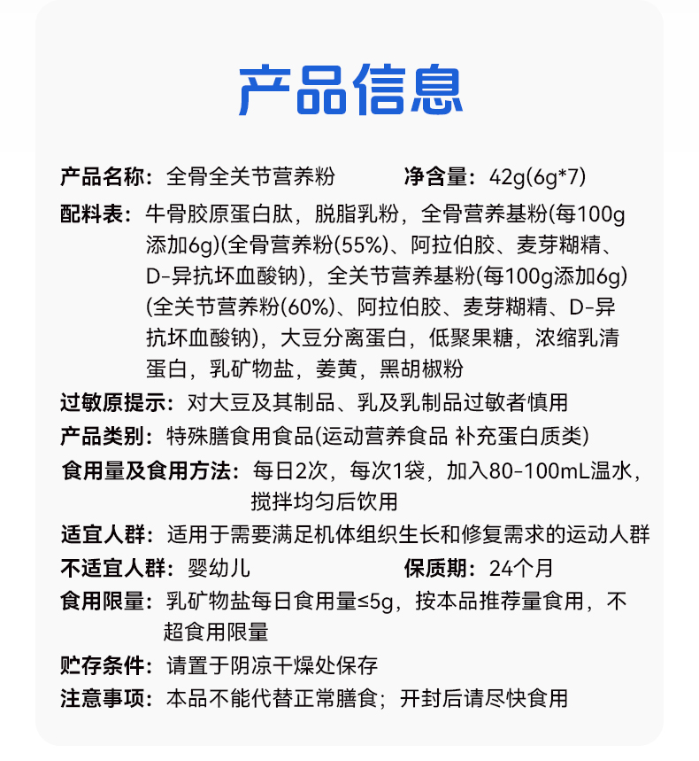 | 【品名】聚禄堂全骨全关节营养粉 【规格】42g/盒(6g*7) 【保质期】24个月 【储存方法】请置于阴凉干燥处,避免阳光直射 【产地】山东东营 【发货地】山东济南 【发货快递】三通一达 【不发货区域】新疆,西藏,港澳台地区不发 【补邮费地区】海南+10元 【发货时效】48小时,节假日顺延 |