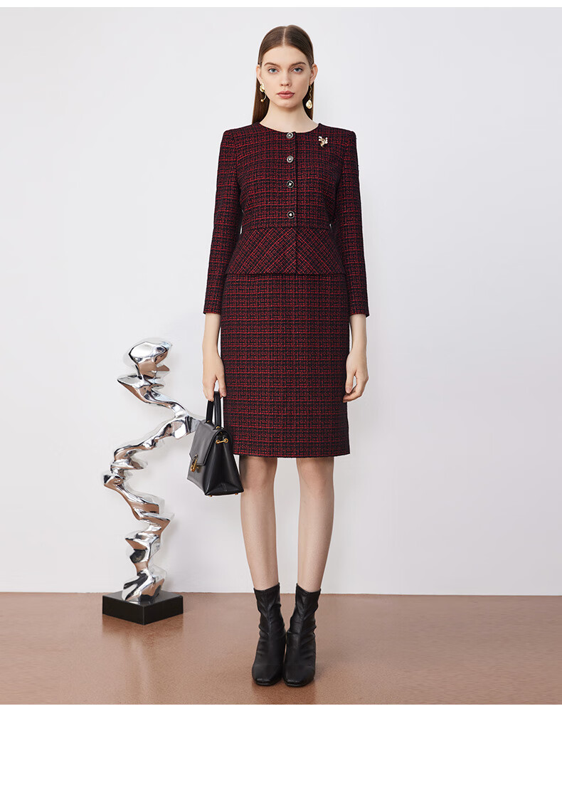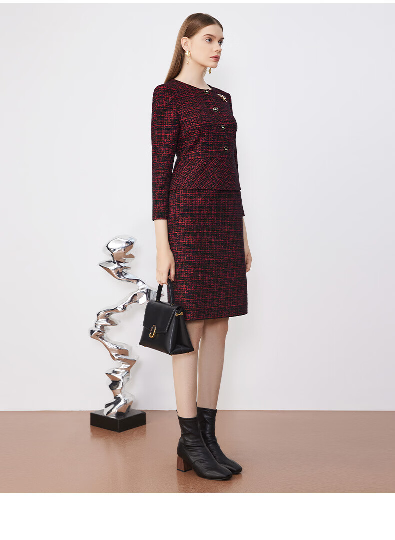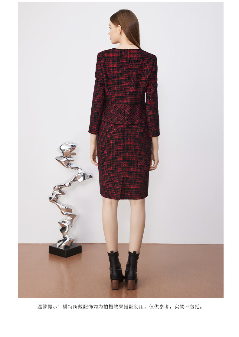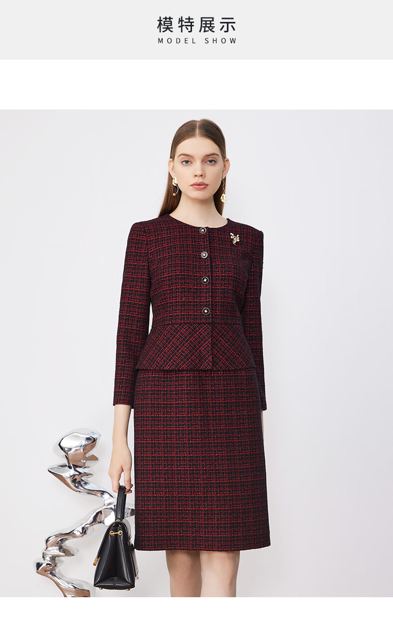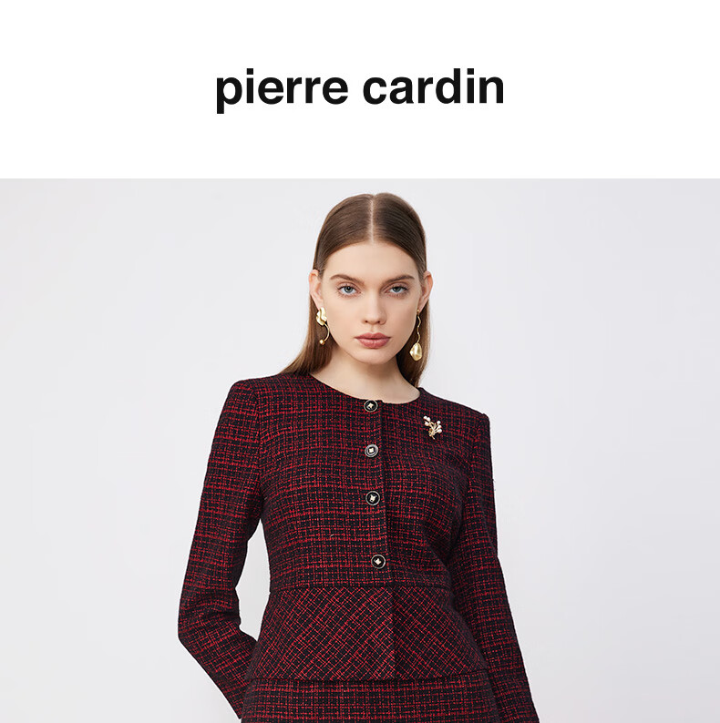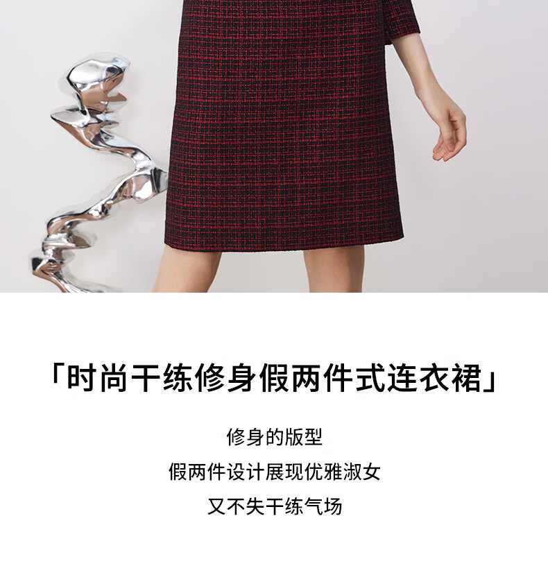 皮尔卡丹女装连衣裙冬季新款红色小香风拼接假两件裙P3446E3947R3
