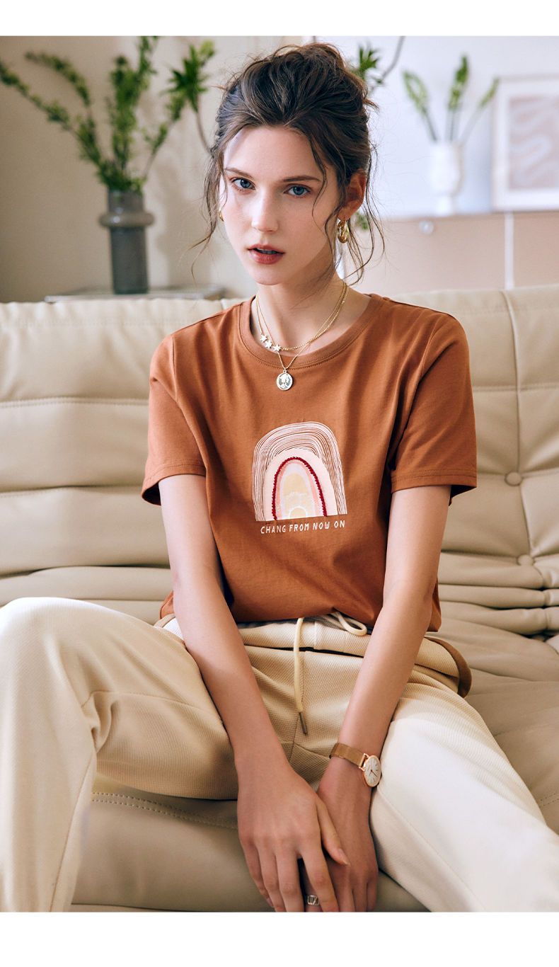 OLrain欧芮儿法式米白色短袖T恤女春季2023新款宽松印花休闲上衣