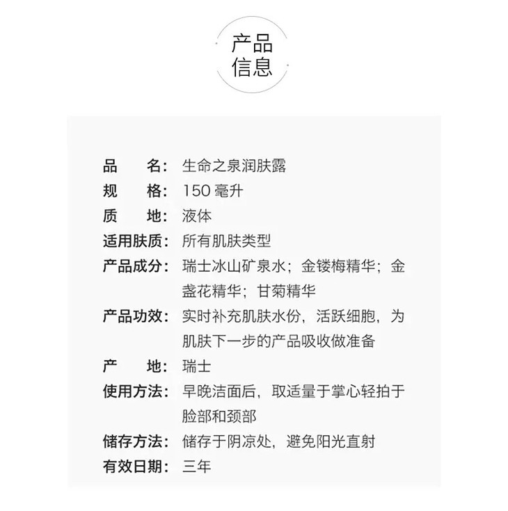 3、功效:法尔曼生命之泉,鼎鼎大名的产品,爽肤水NO.1 ,活跃细胞促进细胞再生、角质不再薄的像张纸。稳定肌肤非常明显、小痘痘第二天就下去了,非常好吸收!拍在脸上超级清爽!94%来自冰山矿泉水,绝对天然不含酒精~收缩毛孔、去红血丝、吸收好,墙裂推荐回购率100%大干皮的话推荐反复上3次拍3次!