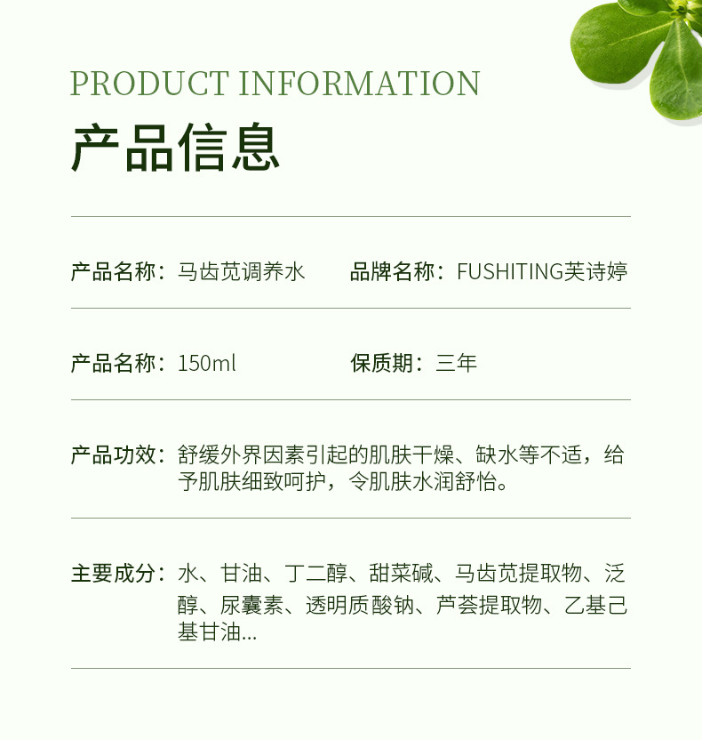 「拍1发3!19.9到手3瓶」芙诗婷马齿苋调养水 补水喷雾保湿控油爽肤水舒缓敏感肌军训学生女彩妆 商品图4