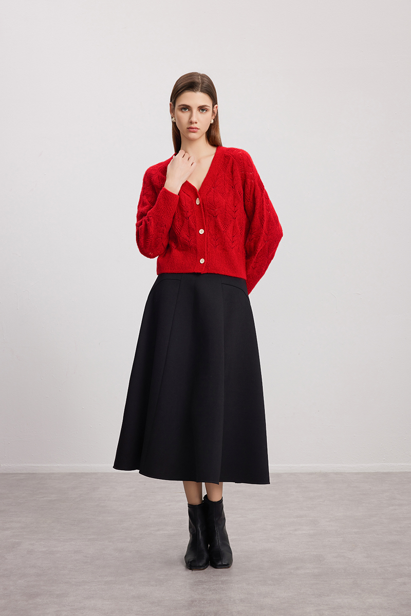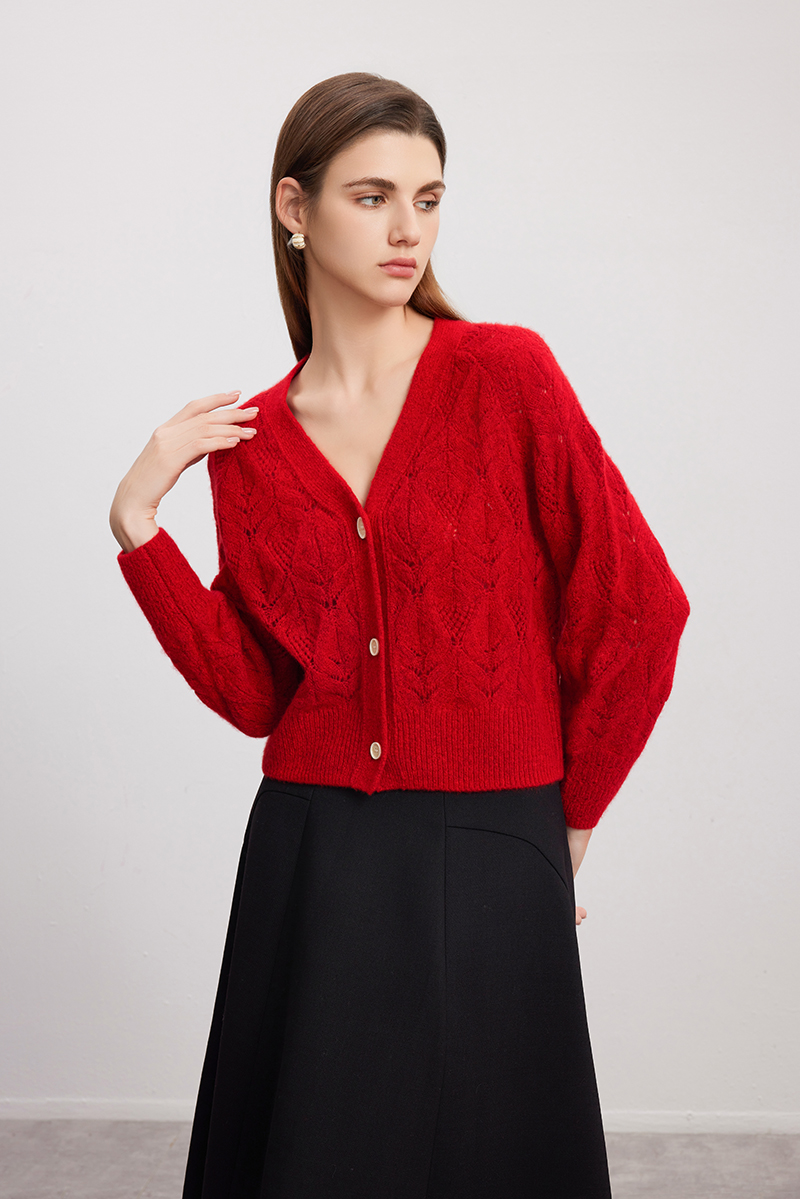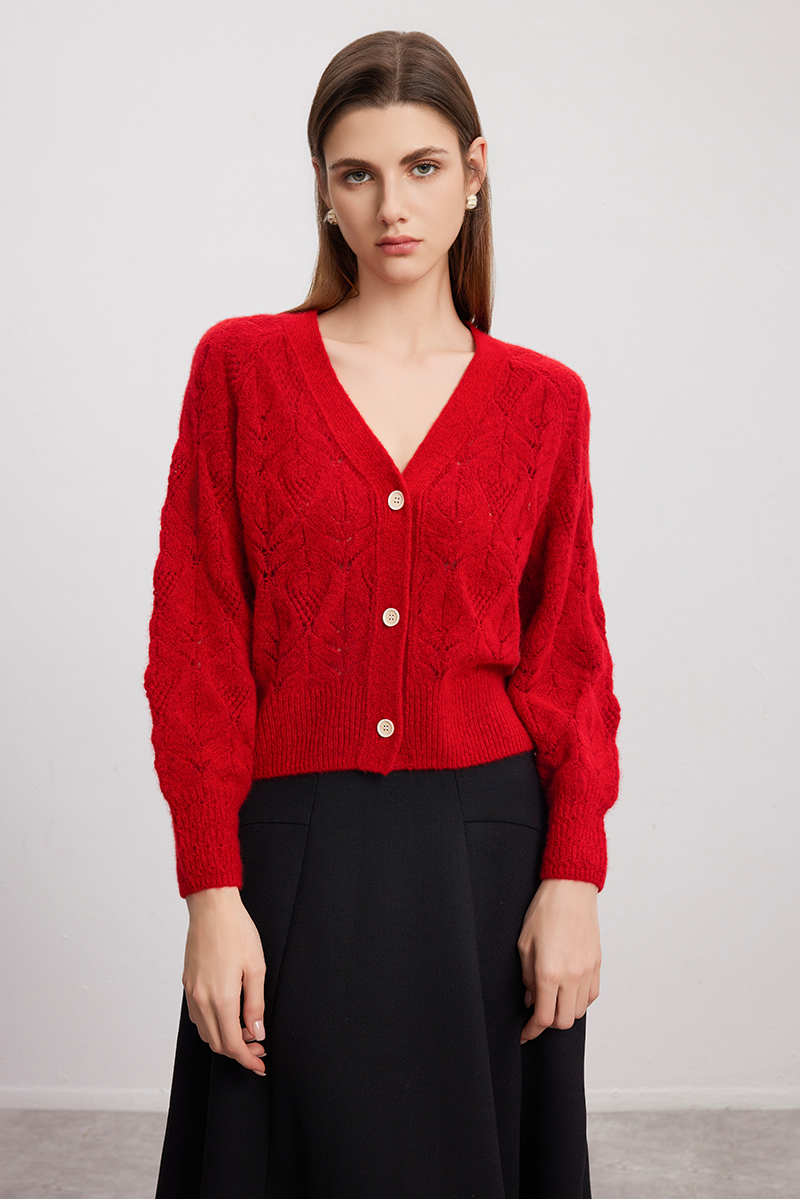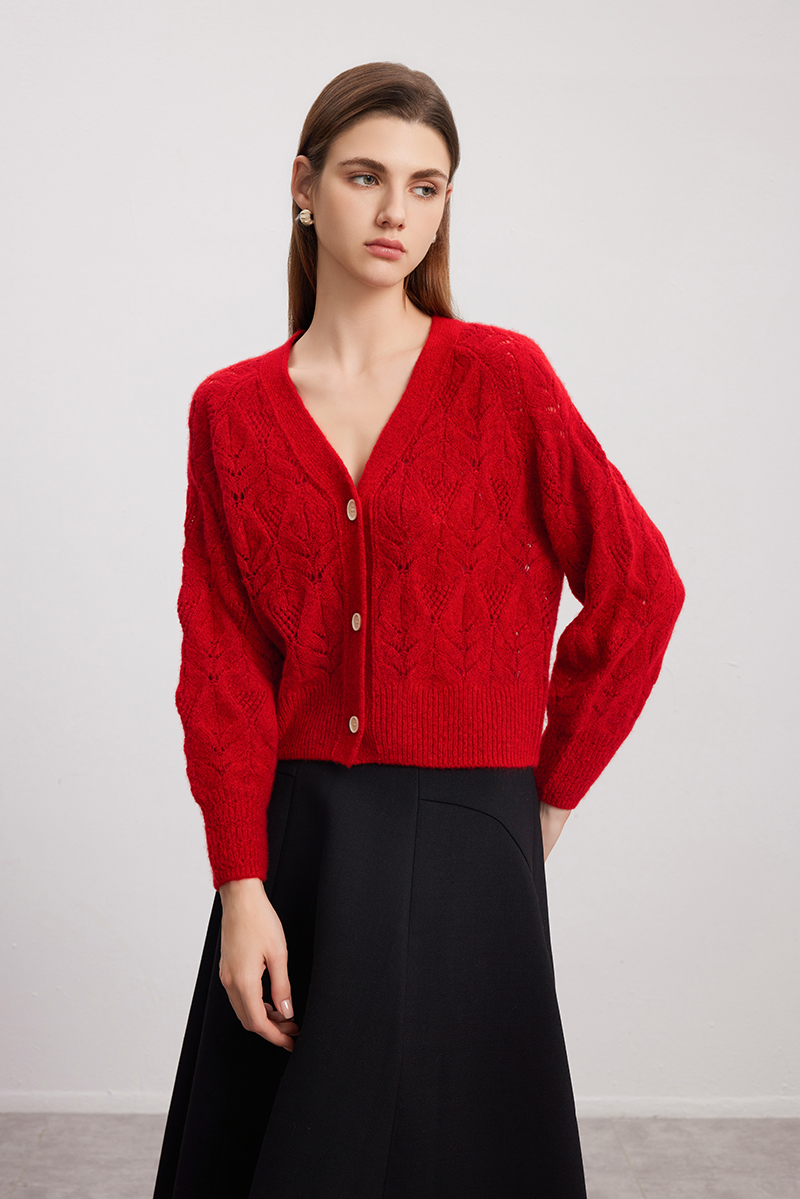 【羊绒+桑蚕丝针织开衫】羊绒世家秋冬新品V领针织开衫时尚镂空针织小外套