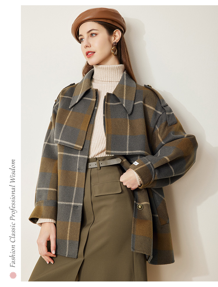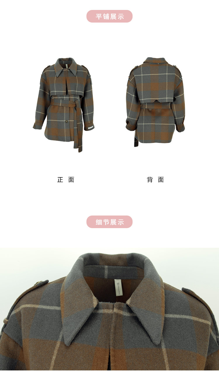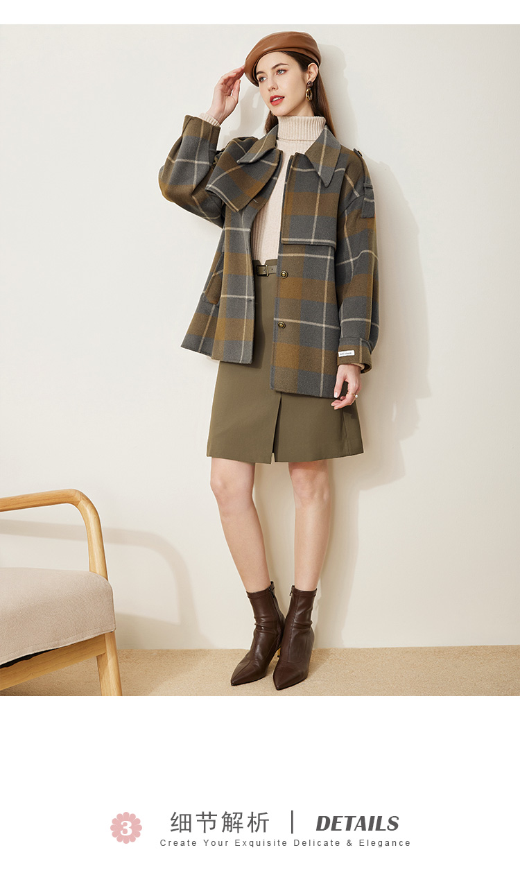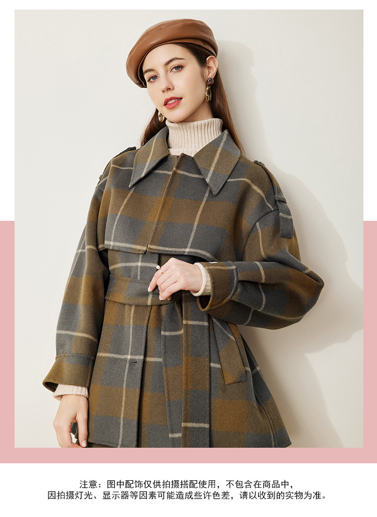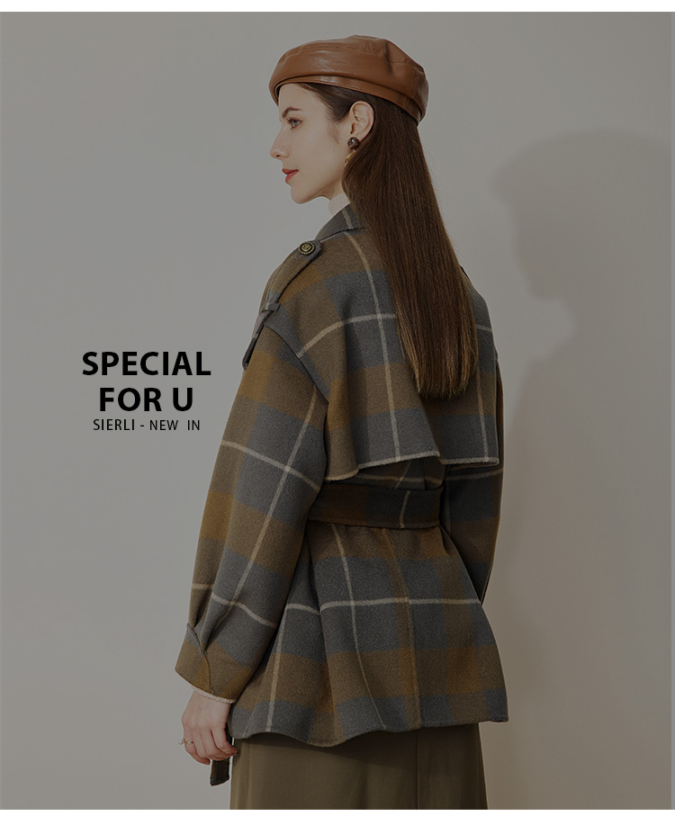 LH9H4斯尔丽2021新款秋冬瑟俪双面呢格子假两件式肩章羊毛大衣女