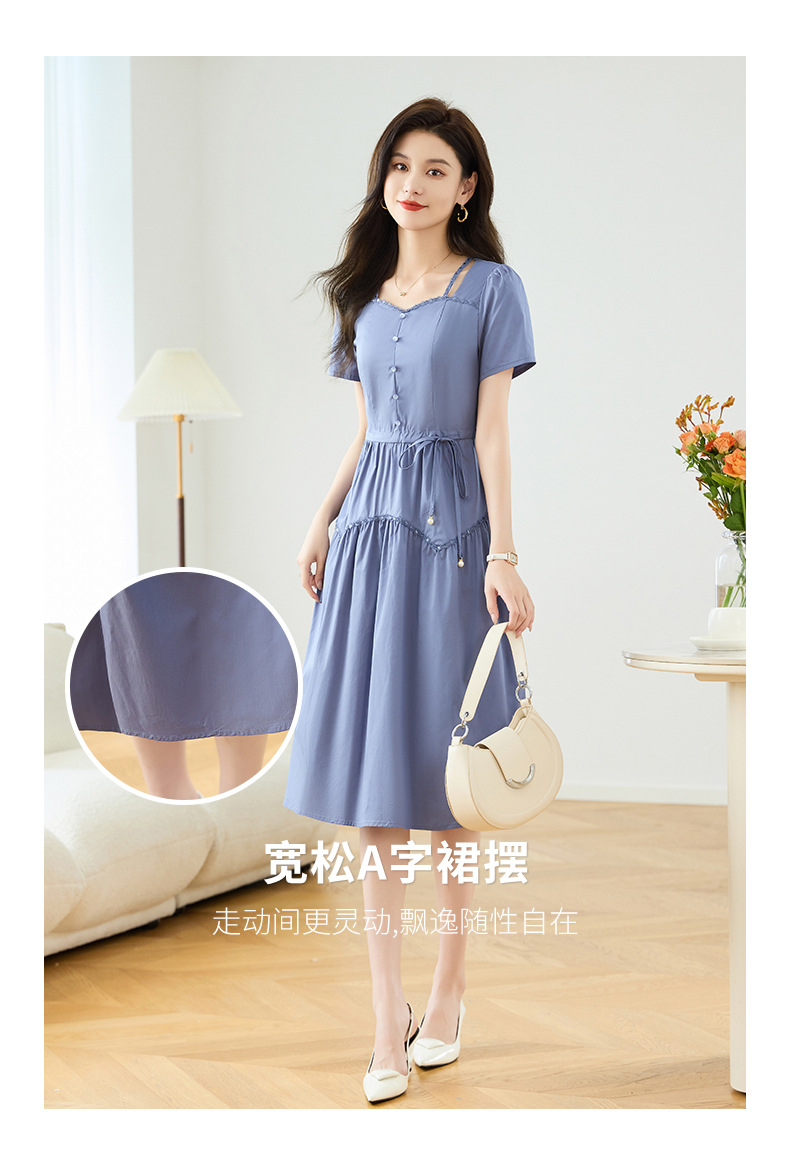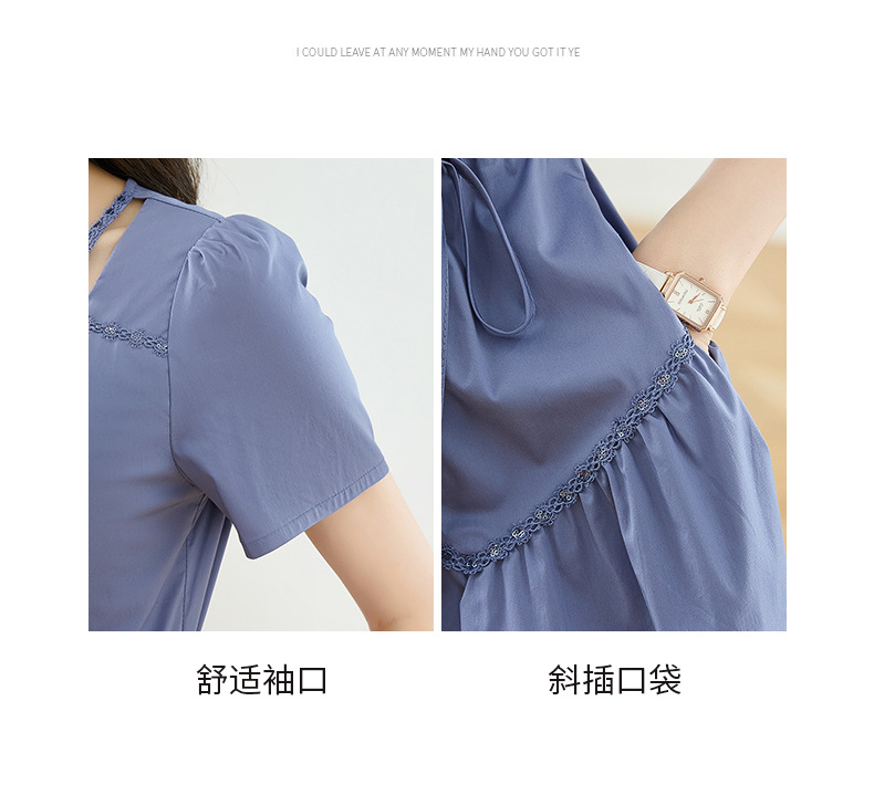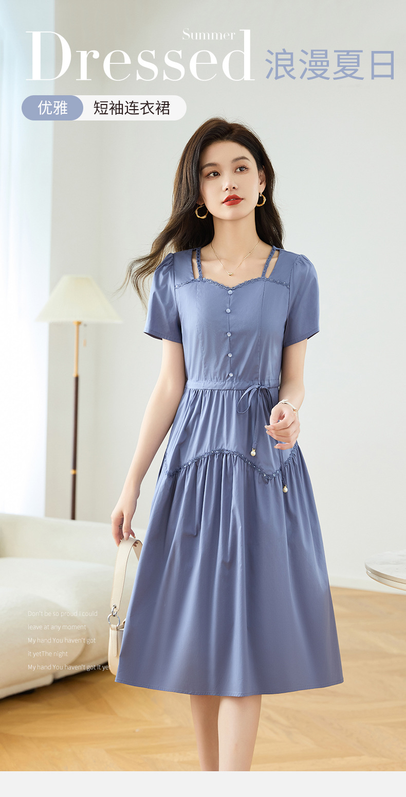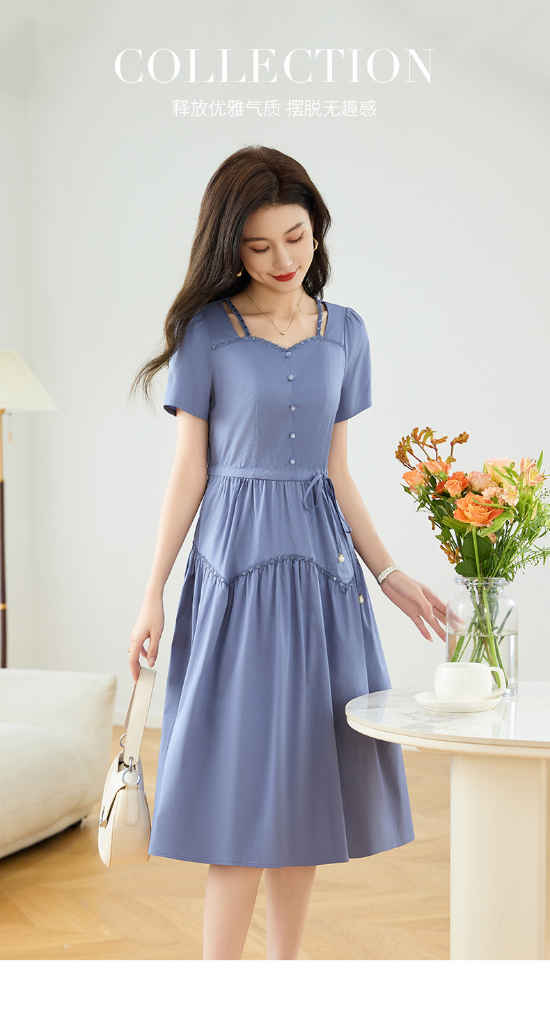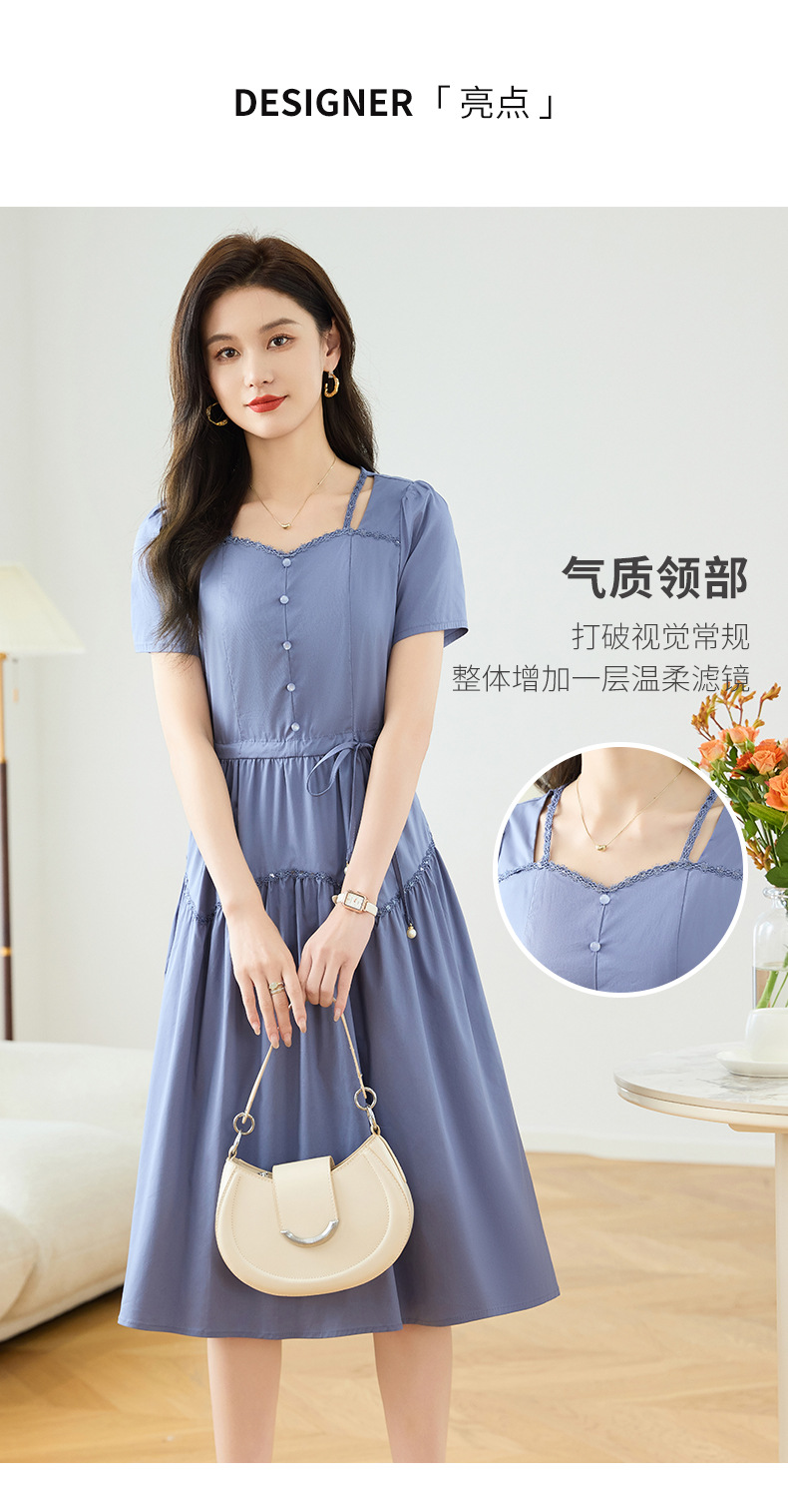 设计感花边拼结短袖裙,系带收腰中长裙QYM-TB-FD1681-Y