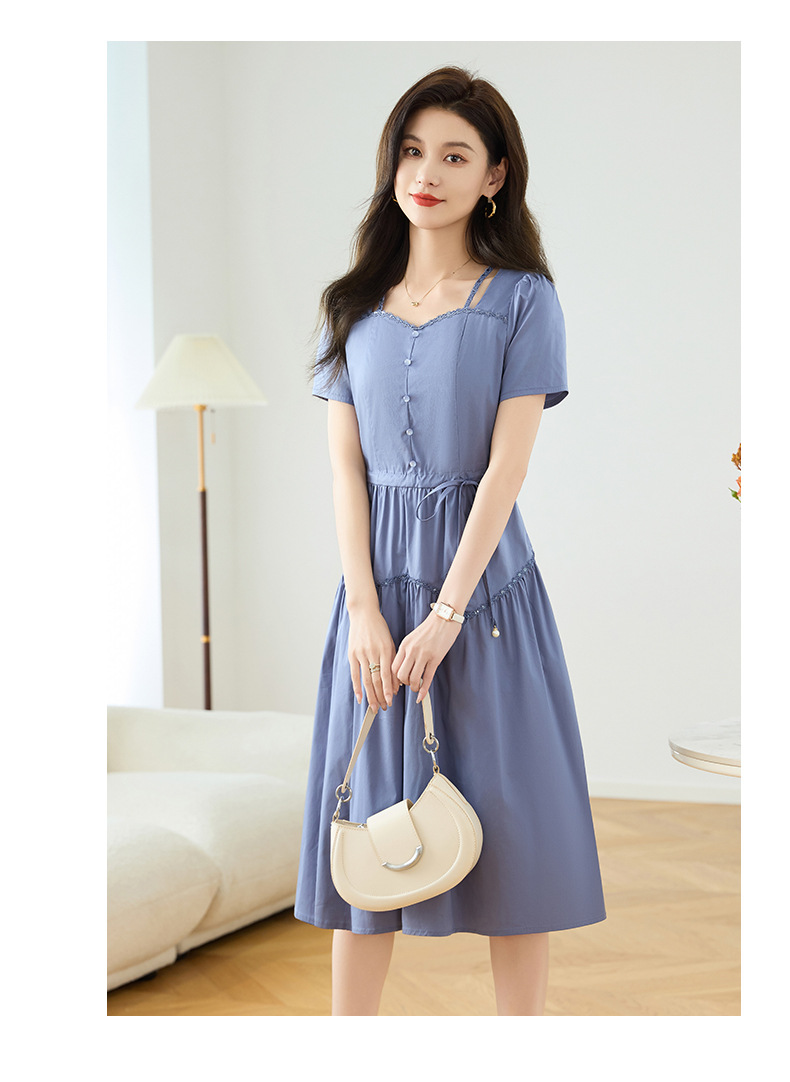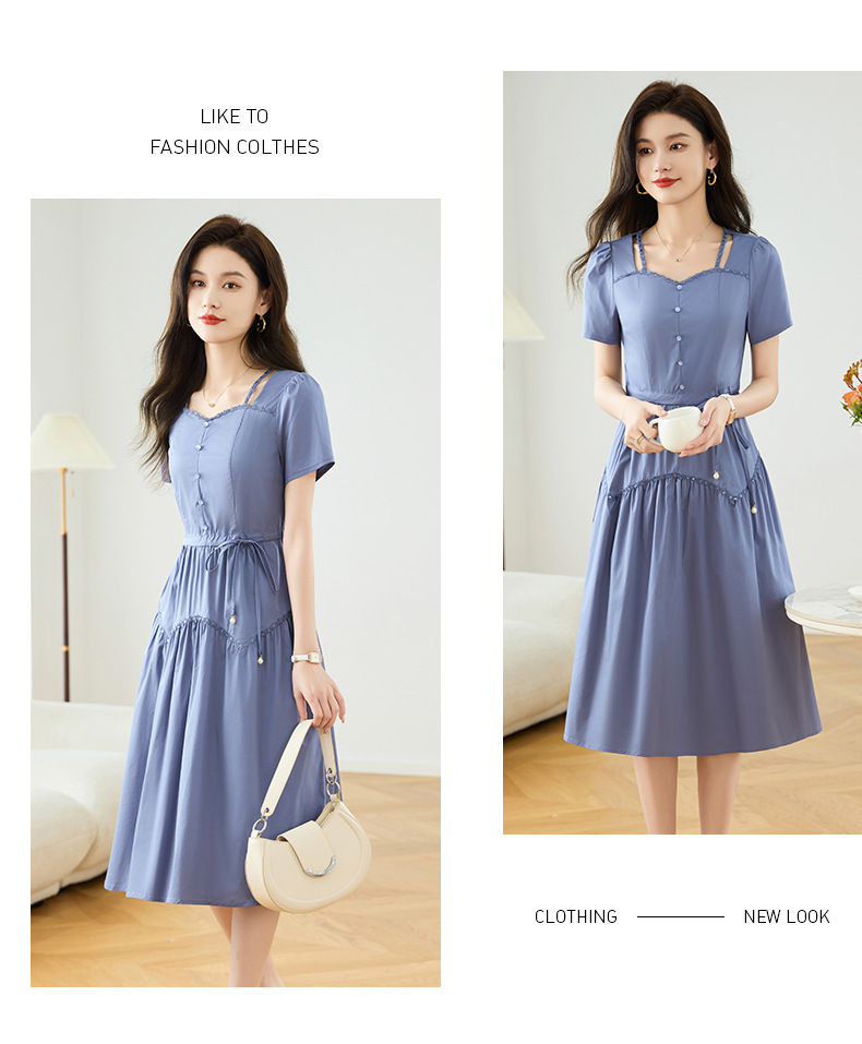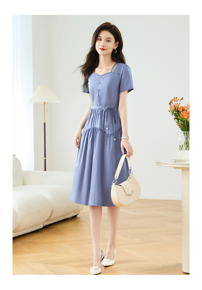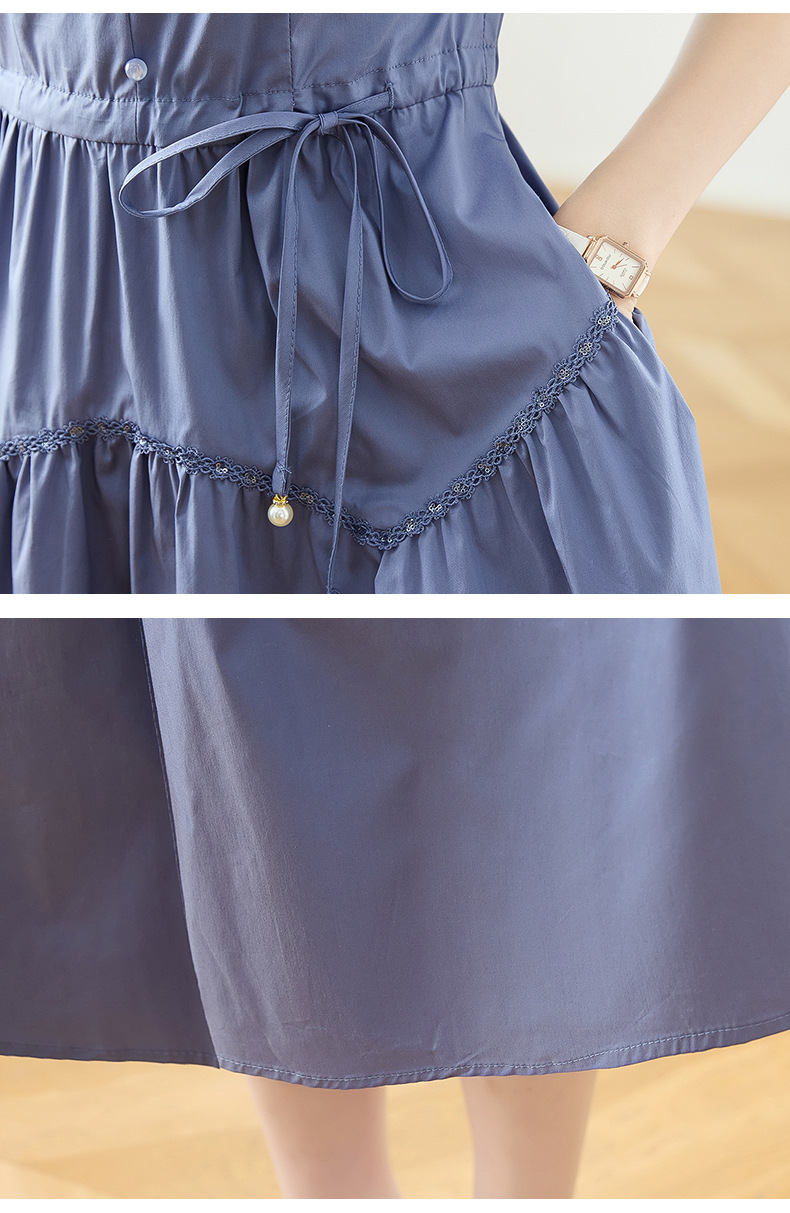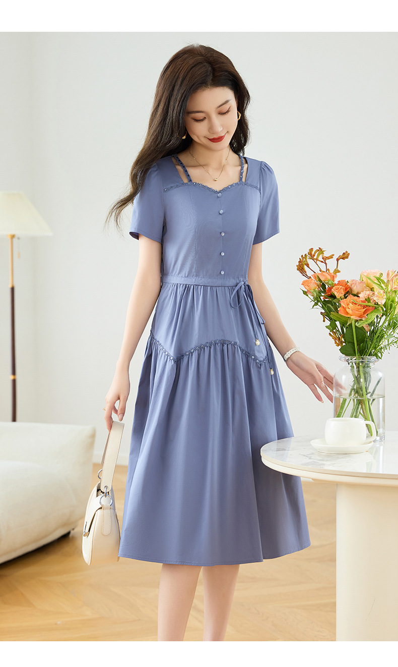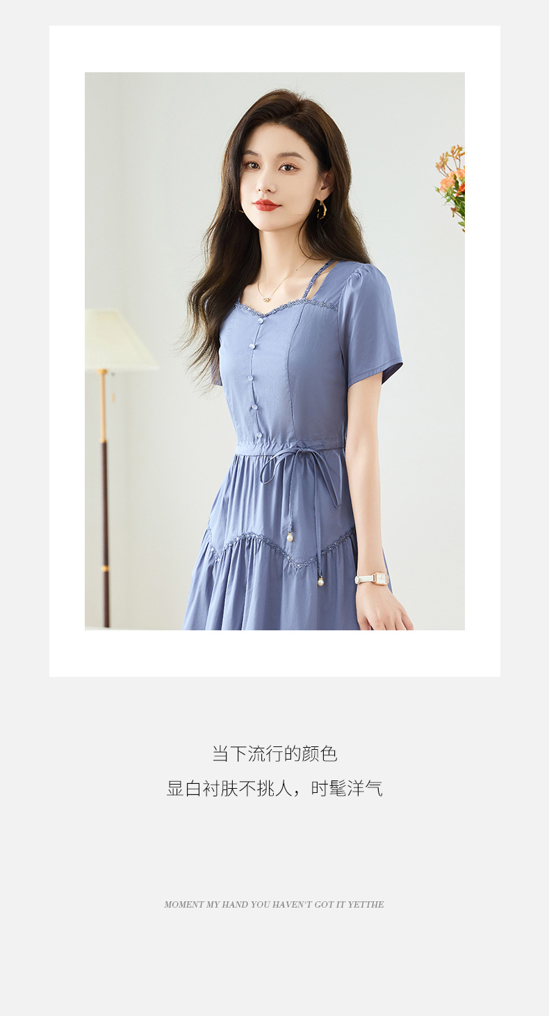 设计感花边拼结短袖裙,系带收腰中长裙QYM-TB-FD1681-Y