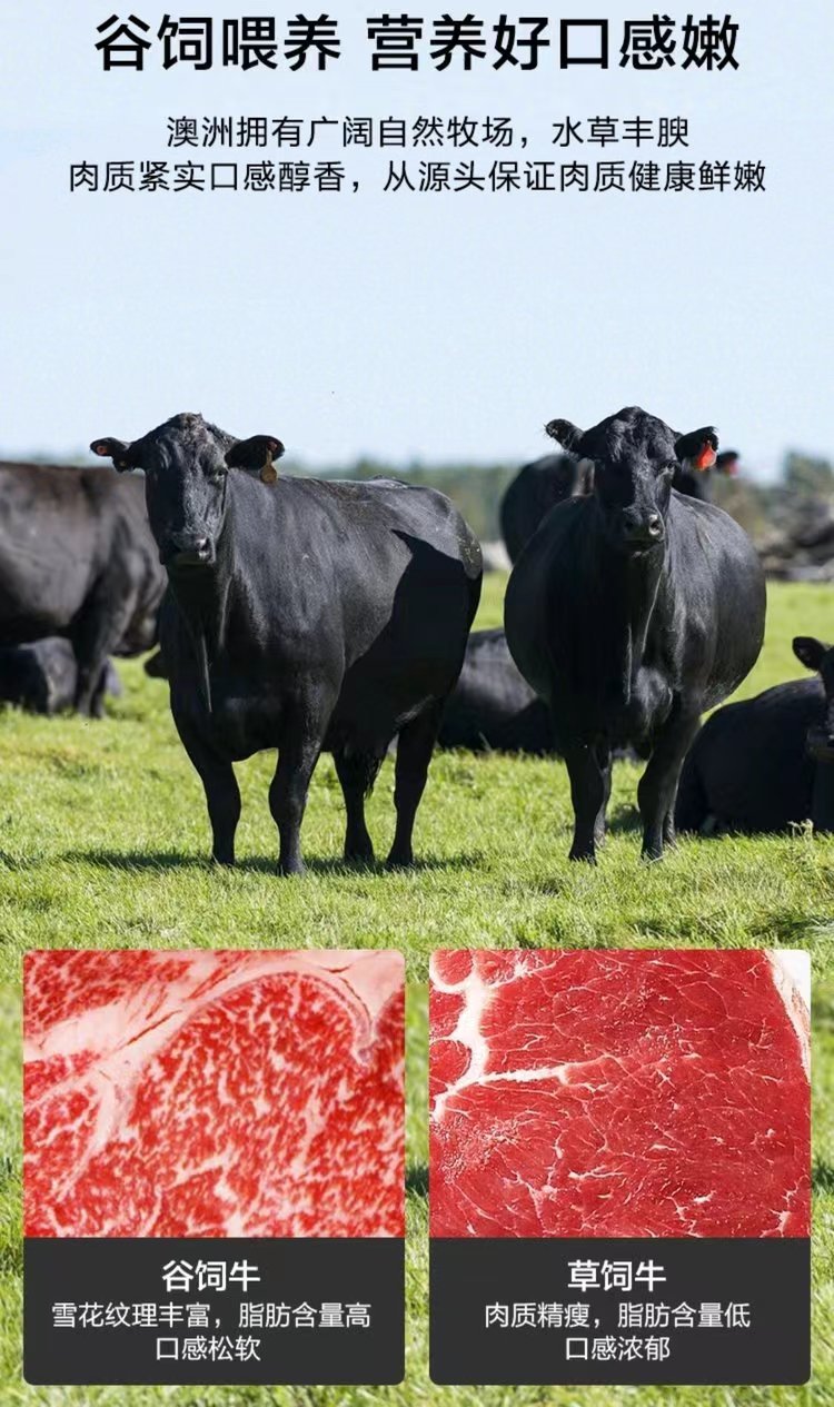 澳洲天然放牧+集中谷饲精心圈养,育肥期纯谷物饲喂。