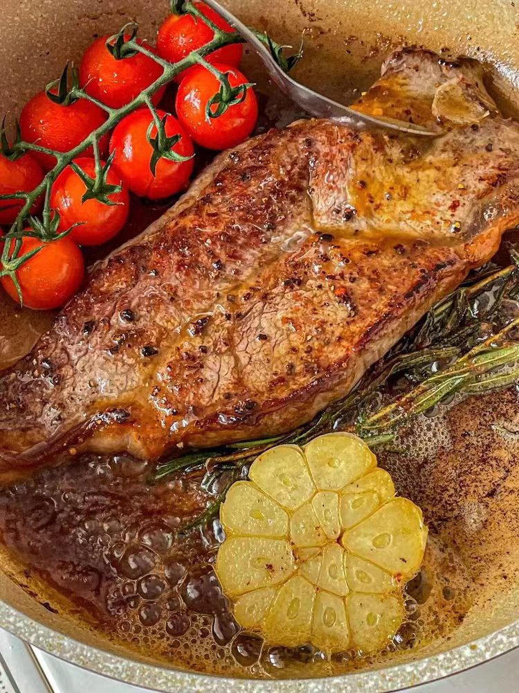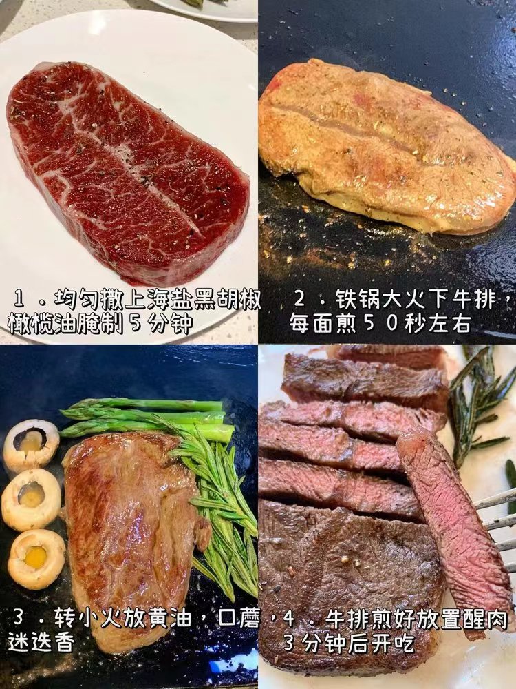下面给大家安利一个怎么都不翻车的牛排做法:1.牛排拆开不要水洗,直接解冻2.解冻后吸干水分,加海盐黑胡椒橄榄油腌制5分钟3.开大火,每面煎50秒左右。4.转小火放入黄油,口蘑,迷迭香一两分钟就能出锅。5.牛排煎好放置醒肉3分钟