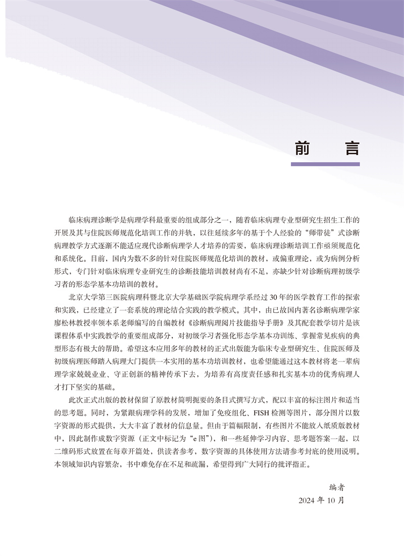 临床病理诊断学是病理学科最重要的组成部分之一,本书及其配套教学切片是该课程体系中实践教学的重要组成部分,是专为临床专业型研究生、住院医师以及初级病理医师踏入病理大门而编写的一本实用的基本功培训教材,对初级学习者强化病理形态学基本功训练、掌握常见疾病的典型形态有极大的帮助,为培养有高度责任感和扎实基本功的优秀病理人才打下坚实的基础。本书以简明扼要的条目式撰写方式,配以丰富的标注图片和适当的思考题,同时增加了免疫组化、FISH检测等图片,部分图片以数字资源的形式提供,信息量丰富。