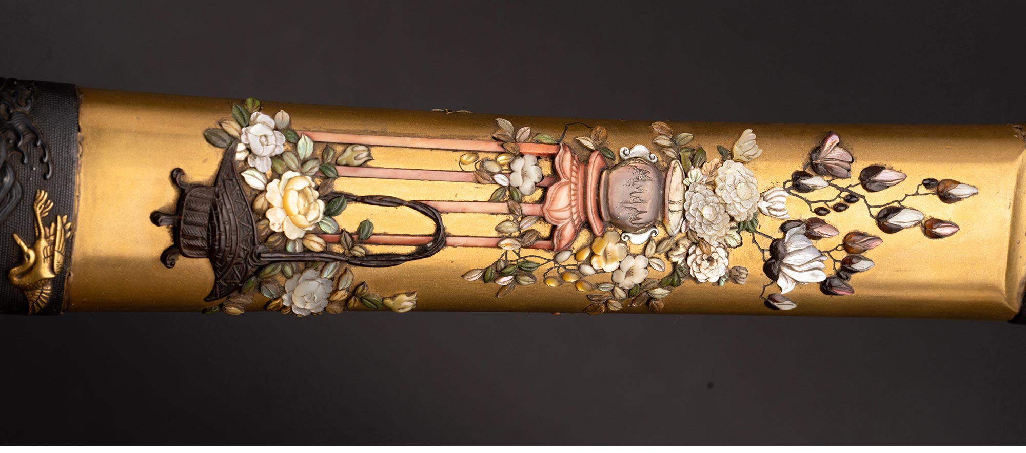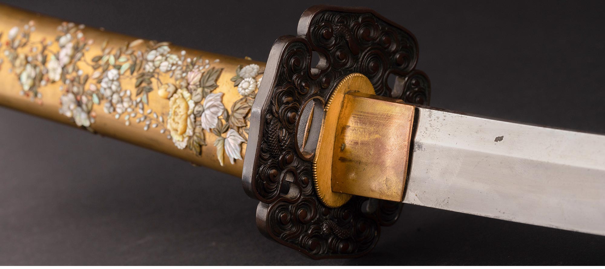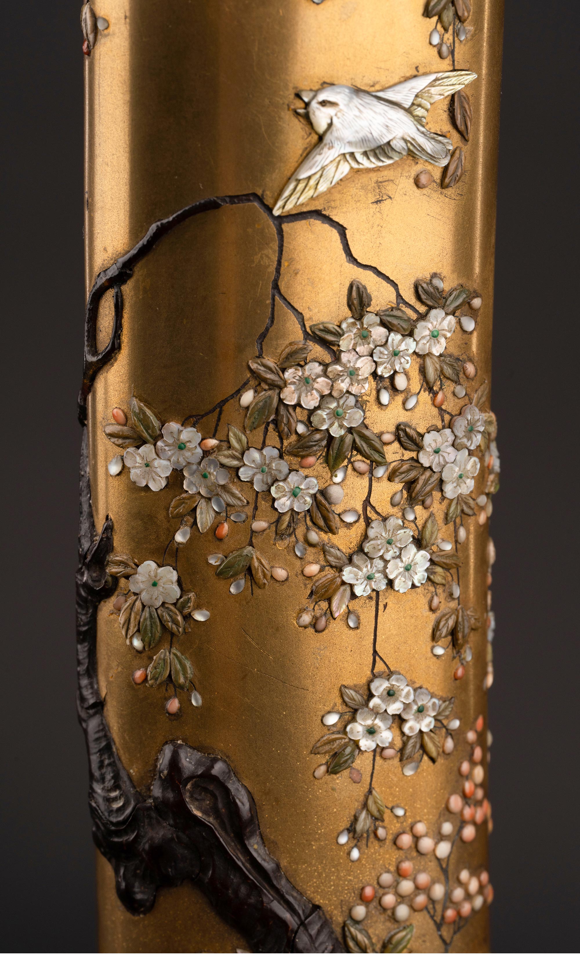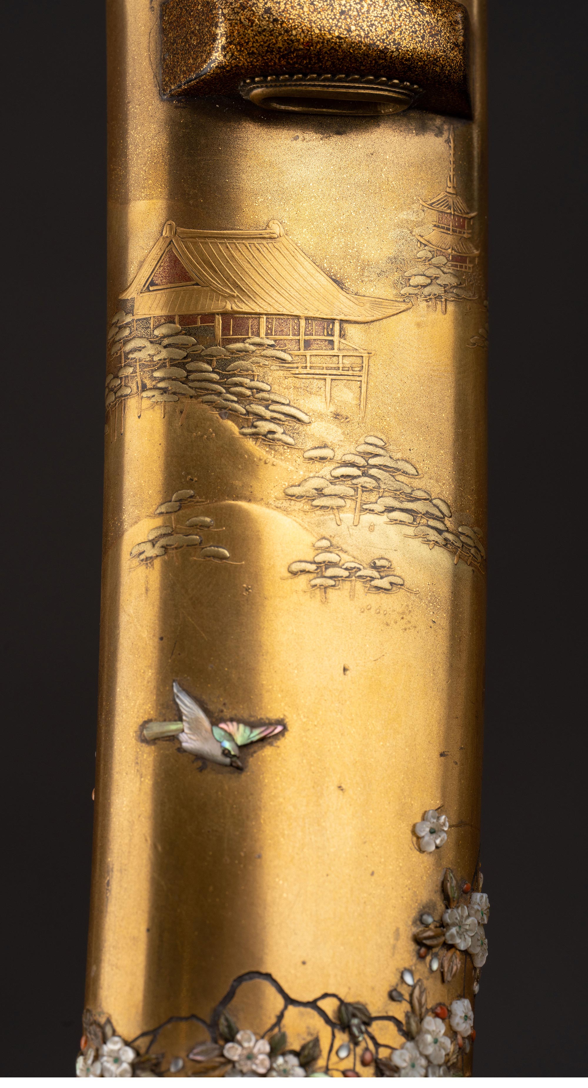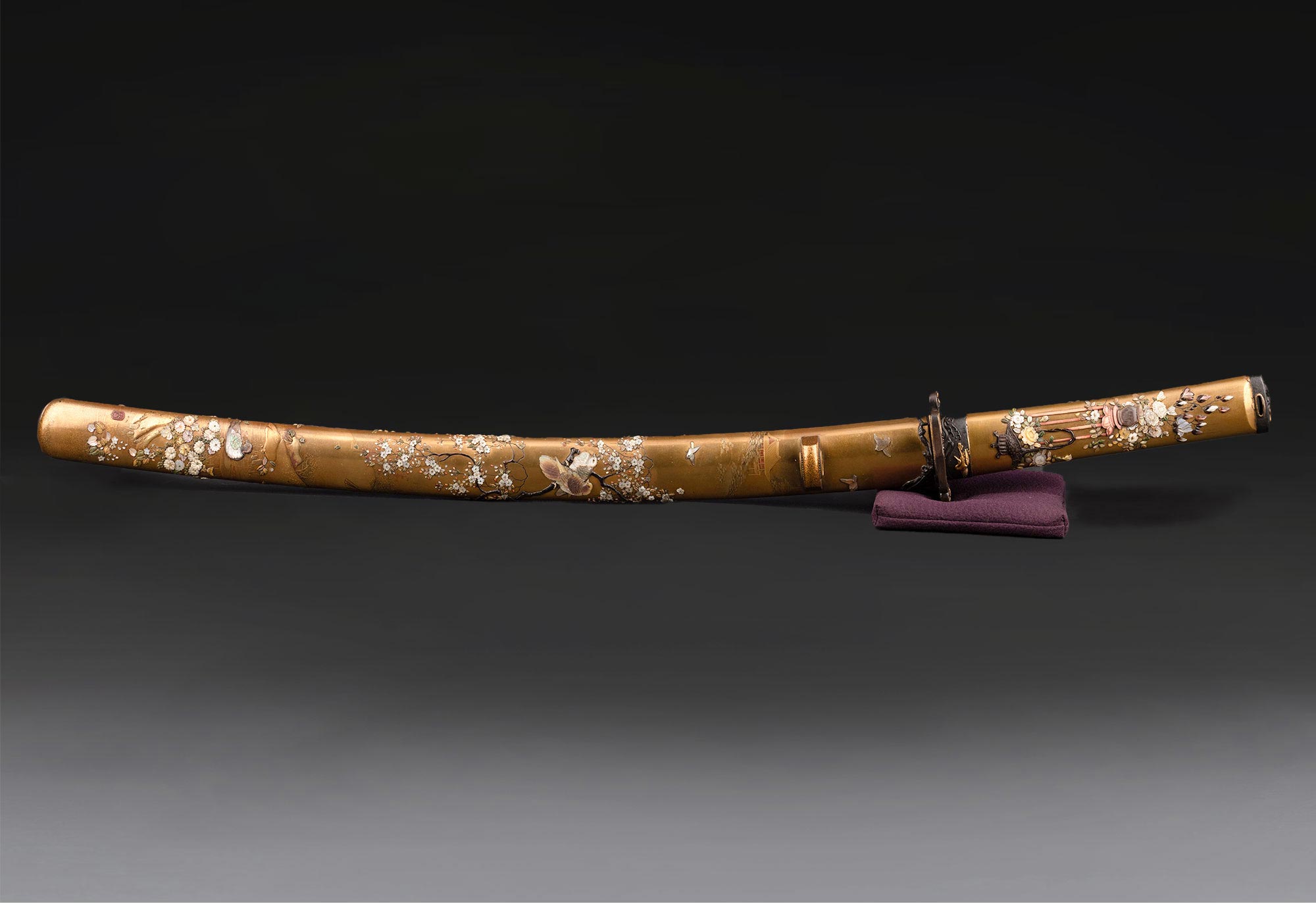 19世纪晚期日本明治时期出品传统花鸟图景主题芝山镶嵌装饰金漆莳绘太刀 配小柄【未开刃】