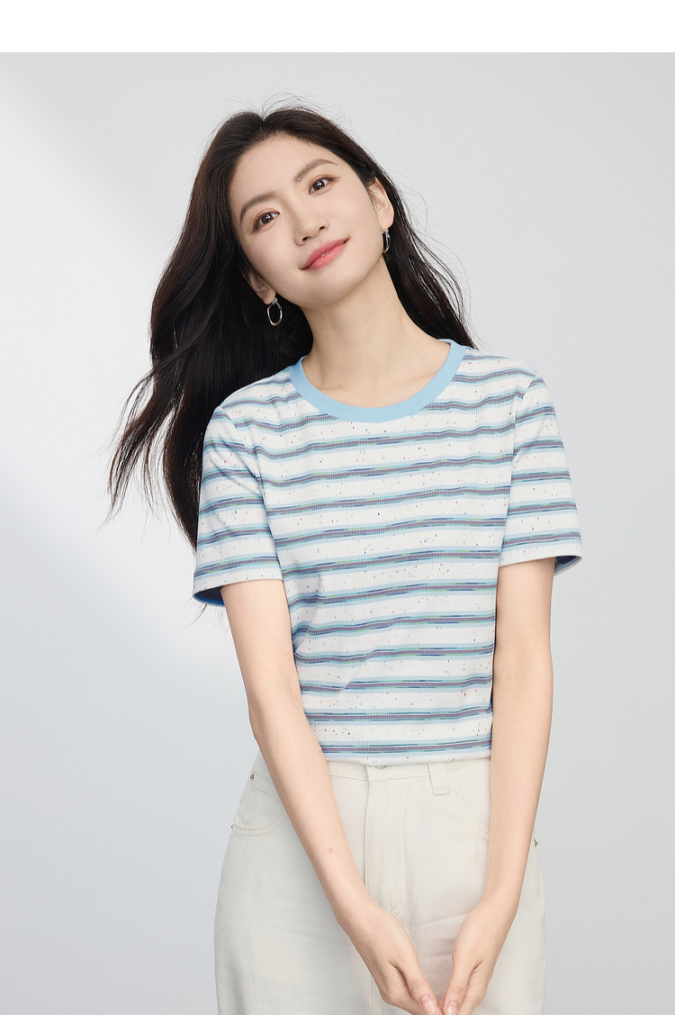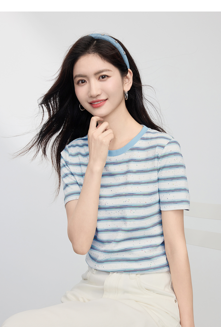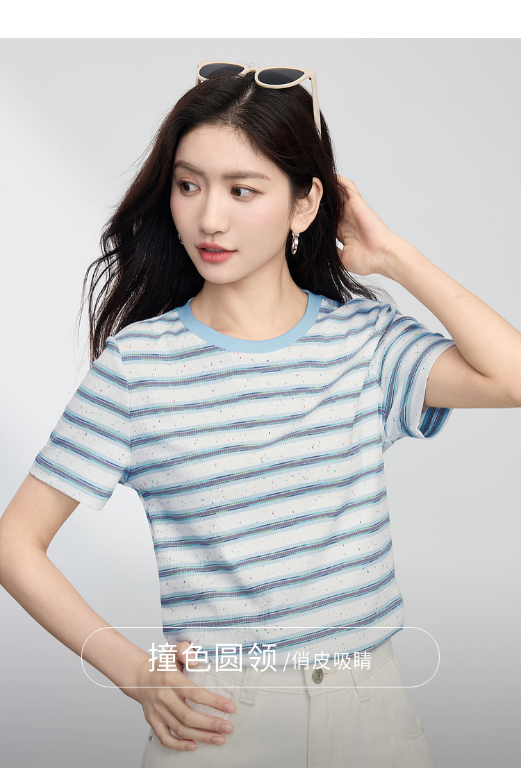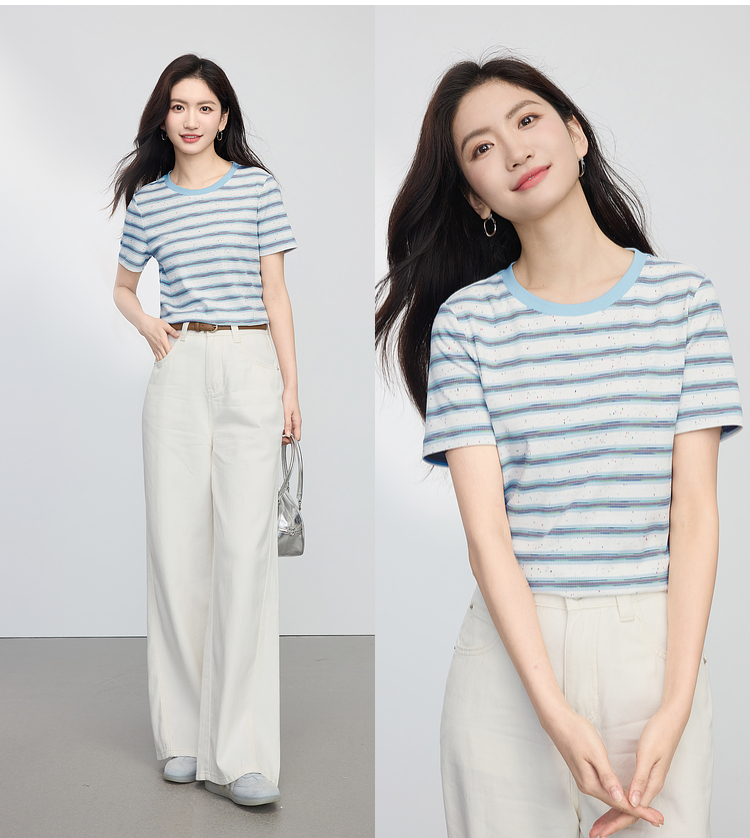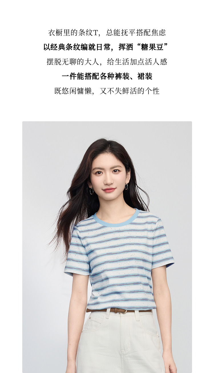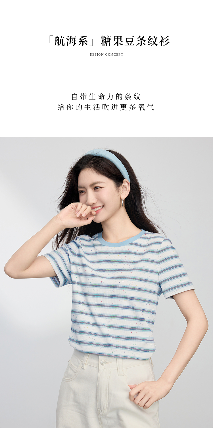 【周末秒杀】熙世界航海系蓝色条纹T恤女夏2025新款宽松百搭圆领短袖正肩上衣