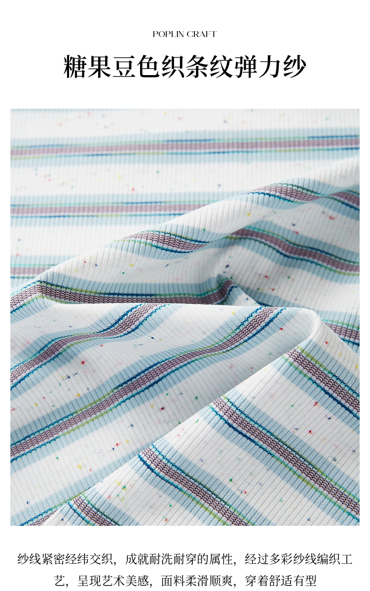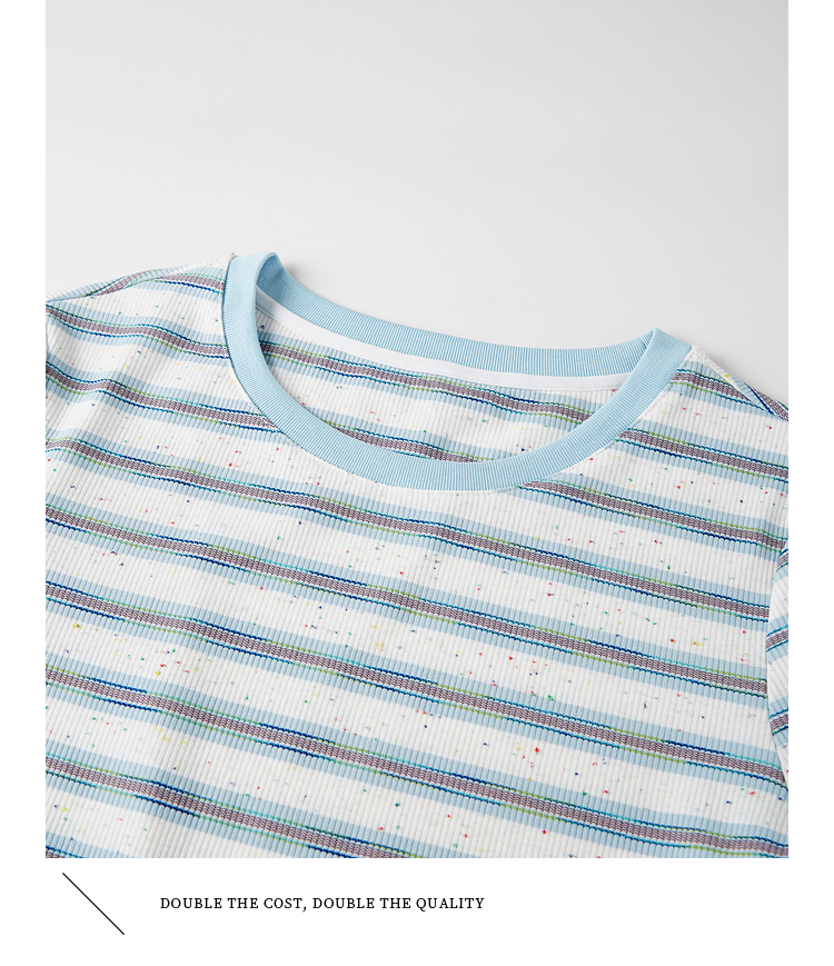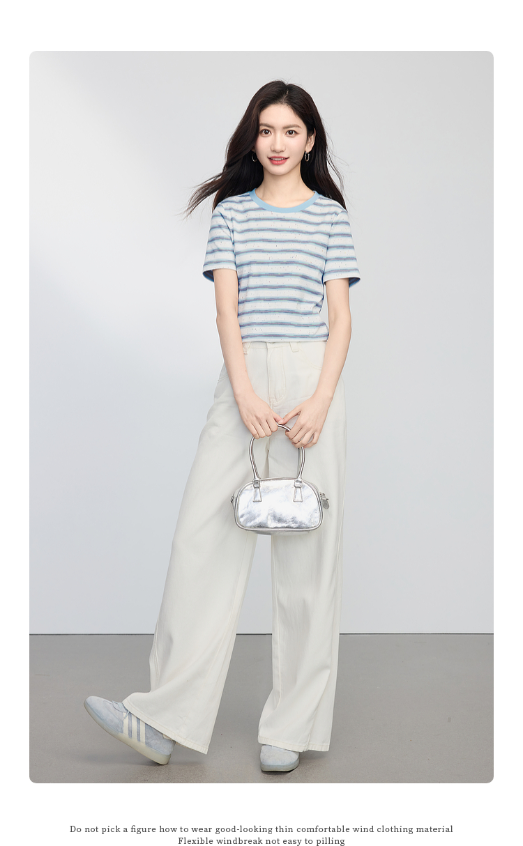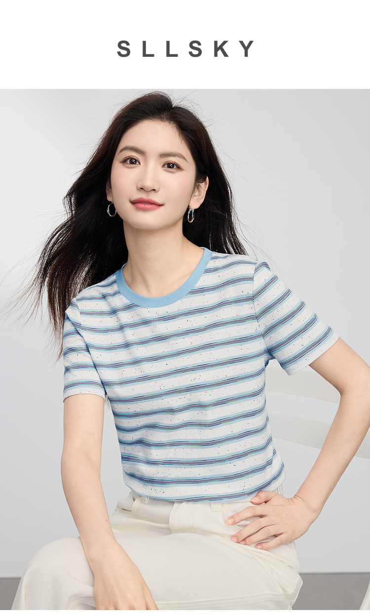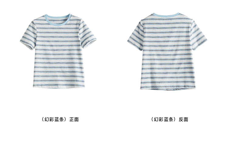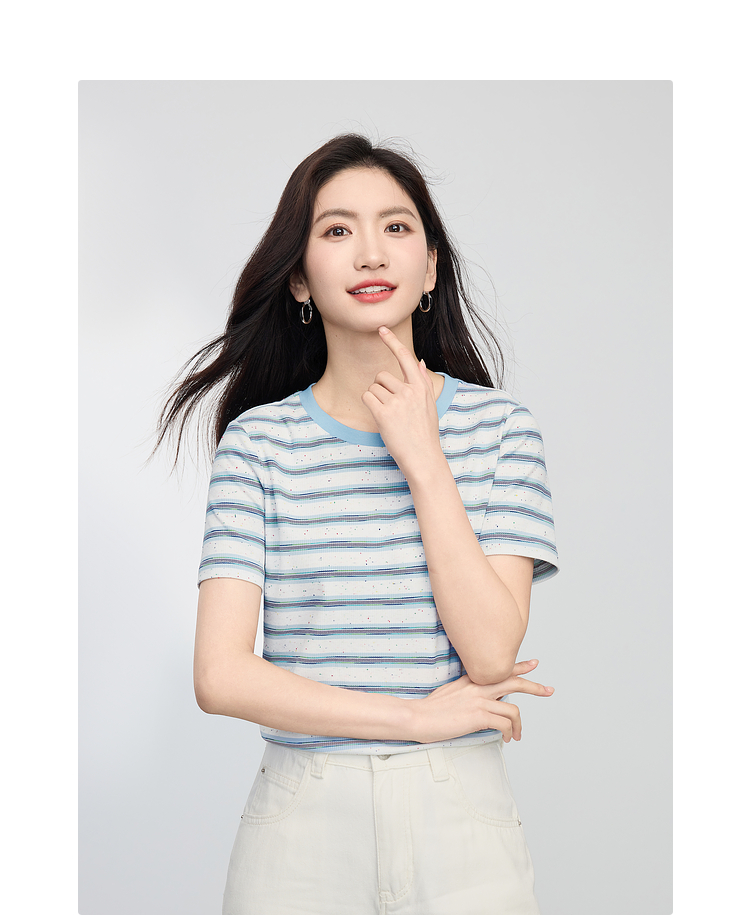 【周末秒杀】熙世界航海系蓝色条纹T恤女夏2025新款宽松百搭圆领短袖正肩上衣