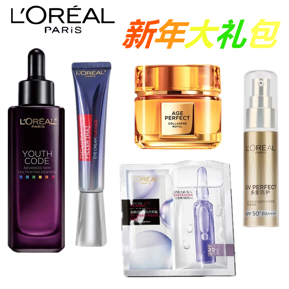 【赠欧莱雅小金管防晒30ml】欧莱雅 护肤大礼包(欧莱雅小黑瓶精华75ml+紫熨斗眼霜30ml+小蜜罐面霜60ml+安瓶面膜10片)