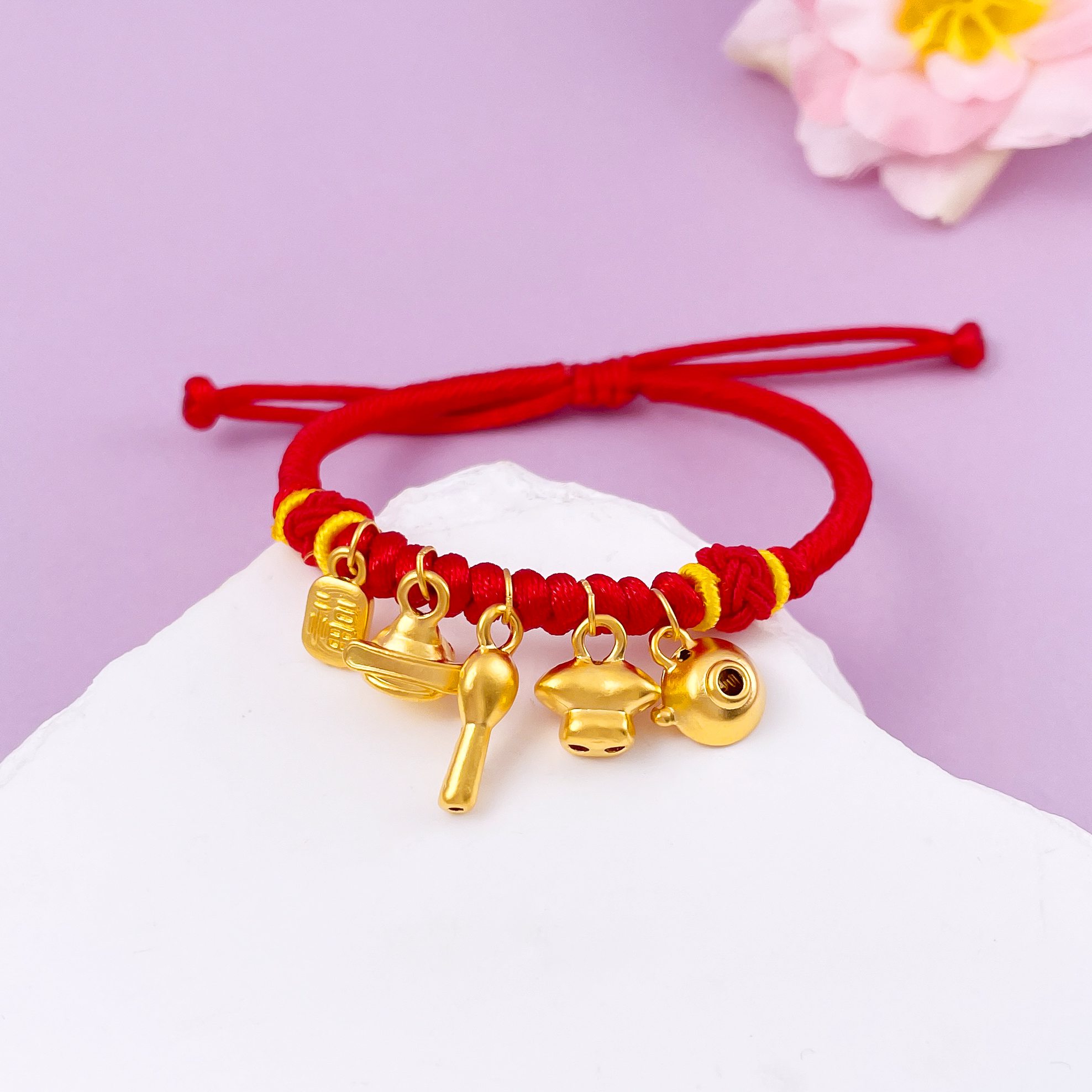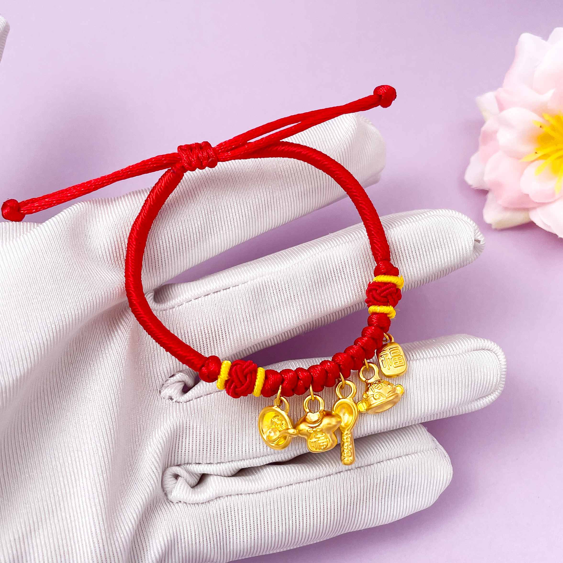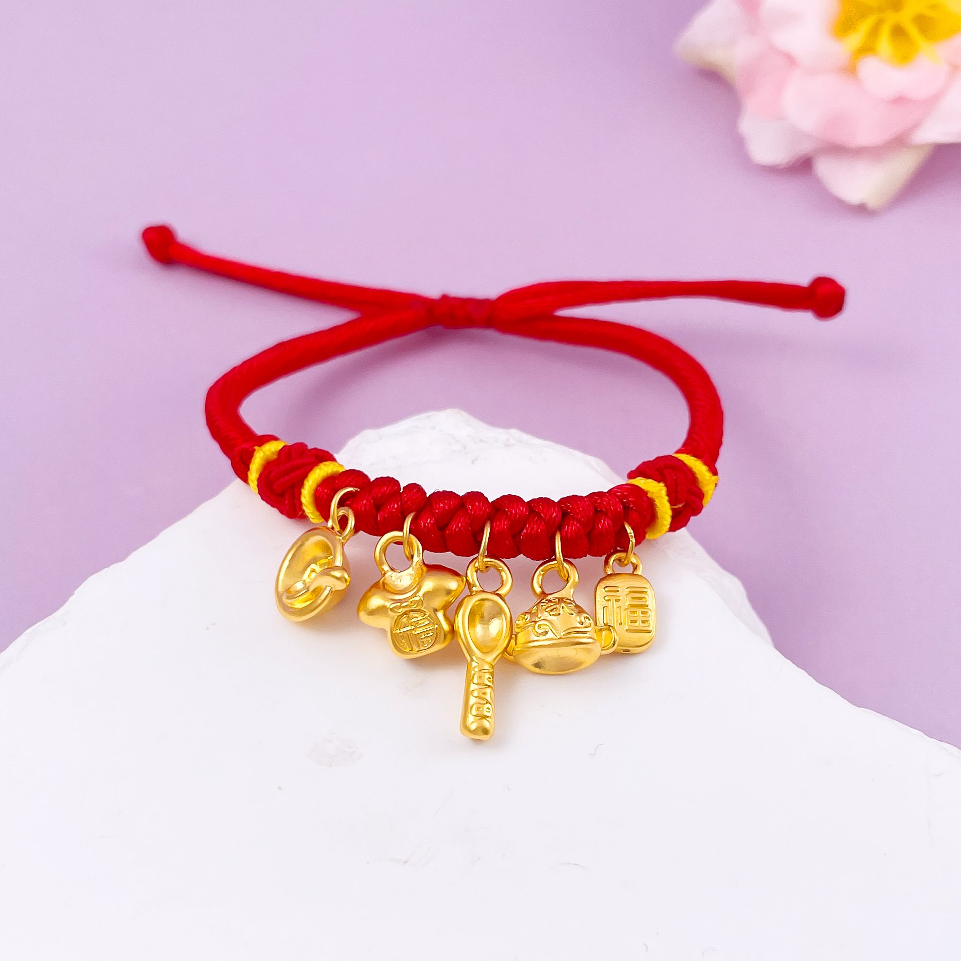 【限时7.5折】【定价黄金】足金 #儿童/宝宝 无氰5D可调节空心锦衣玉食吊饰编织红绳编绳手串(AA5DSC00003)预售产品下单后不退款不退货不换货不补差价