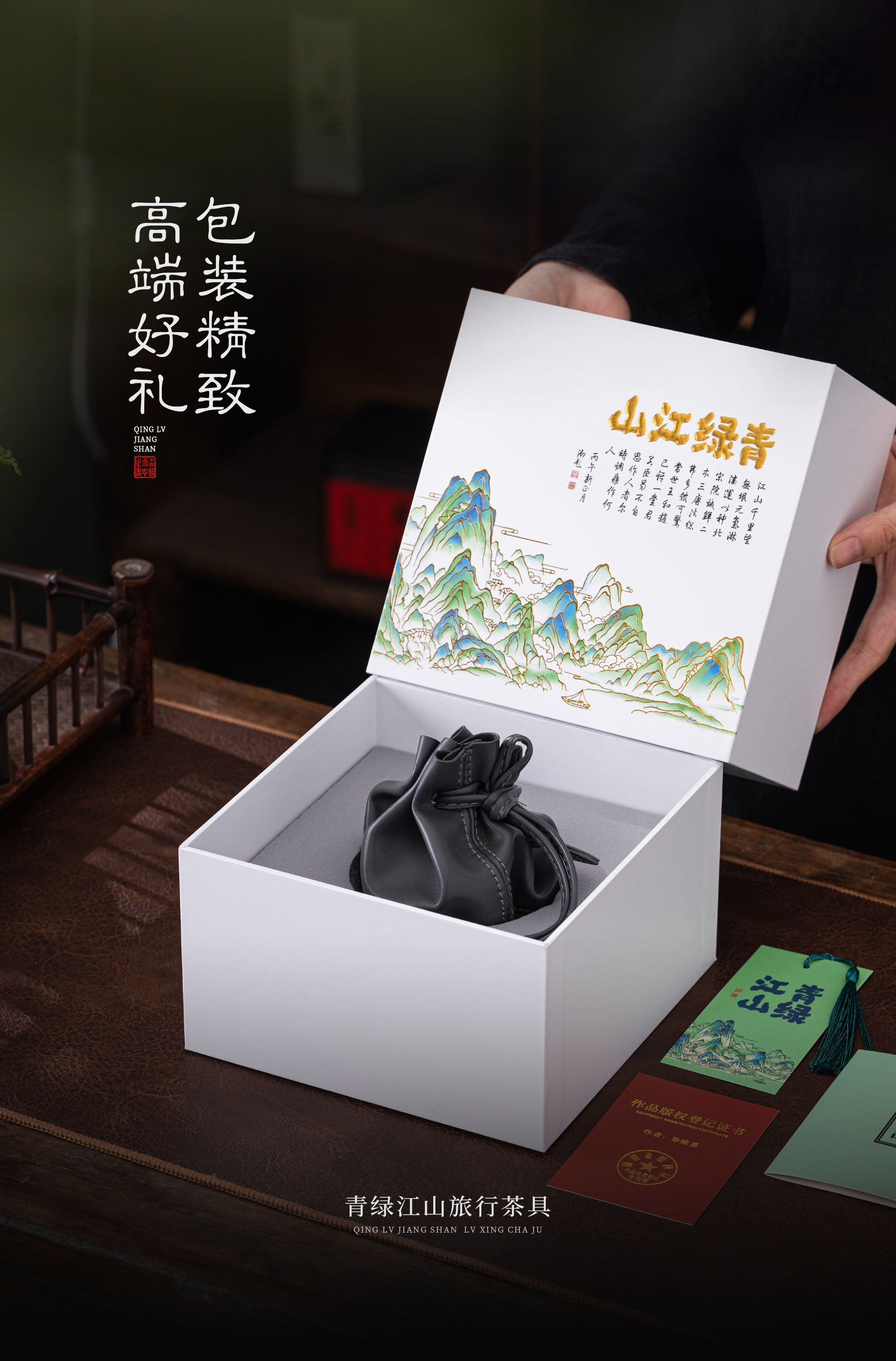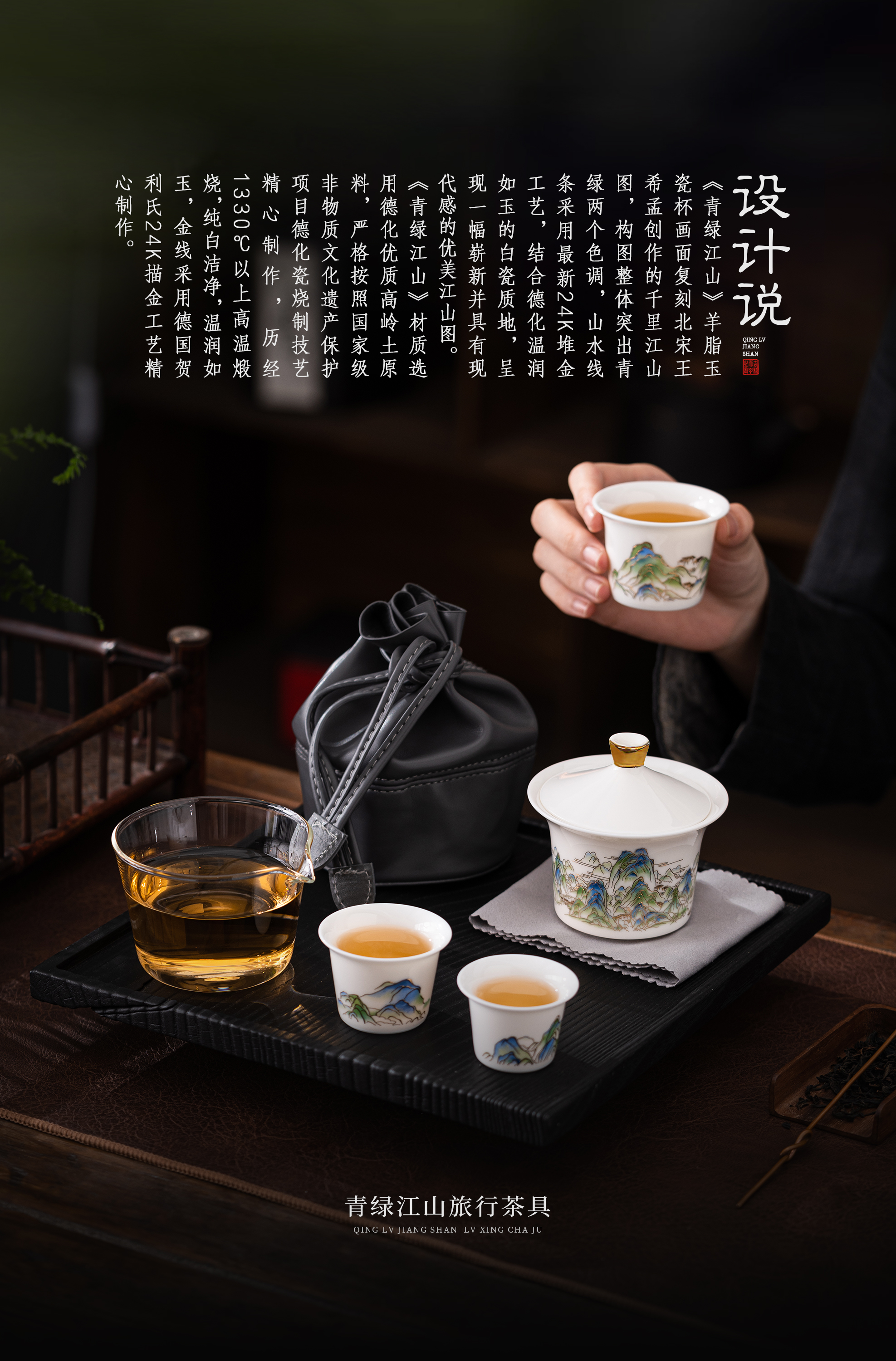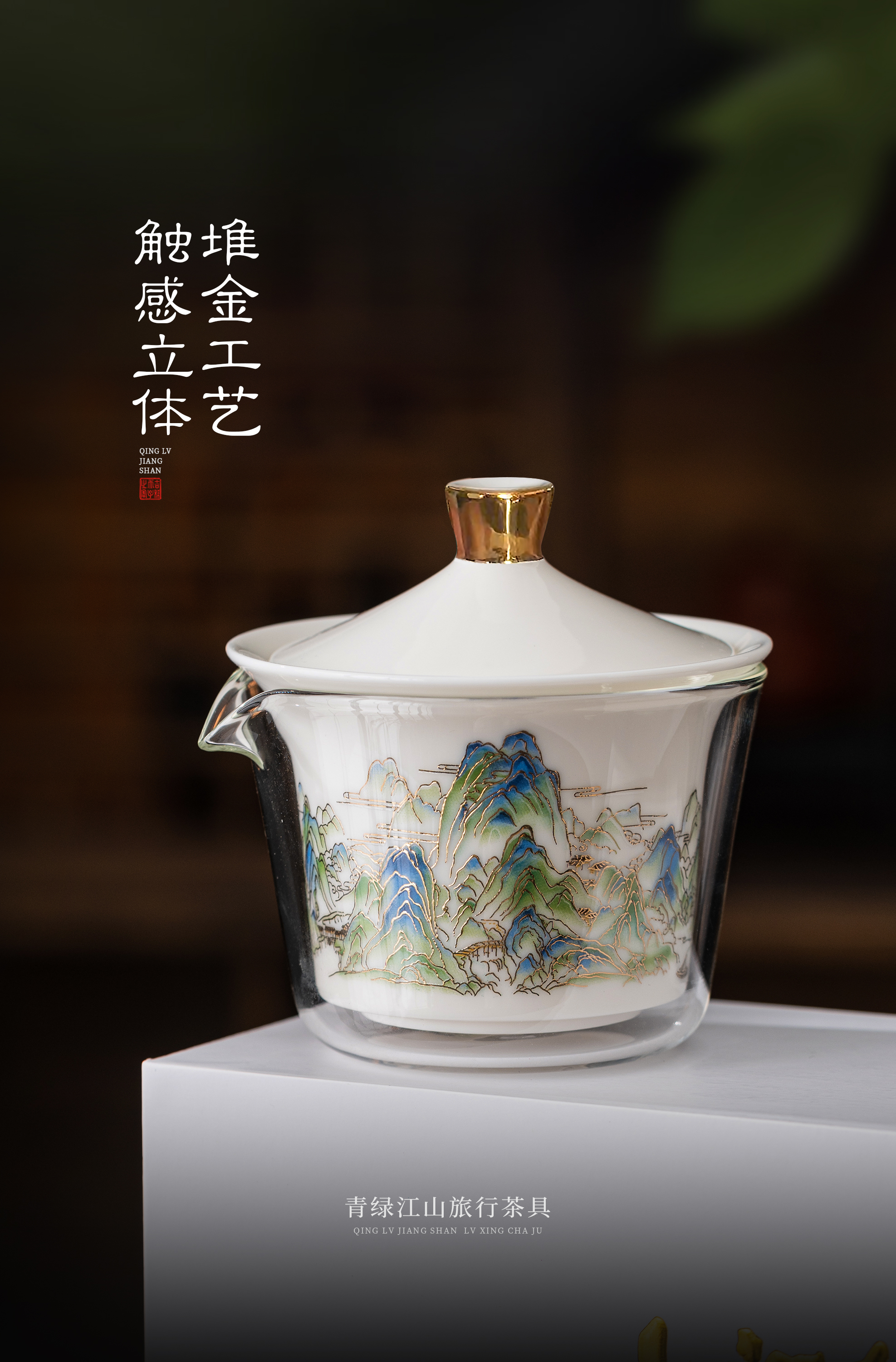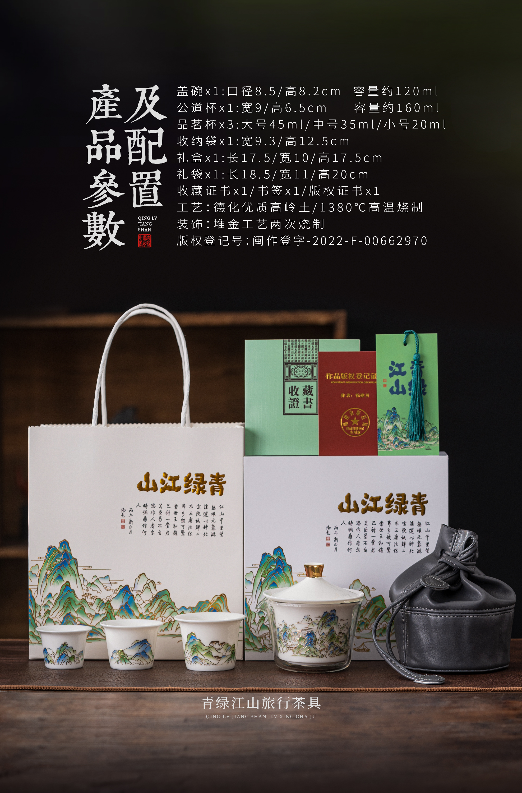 【青绿江山】旅行茶具套组(盖碗),润泽如玉 堆金工艺,原创设计 精致包装