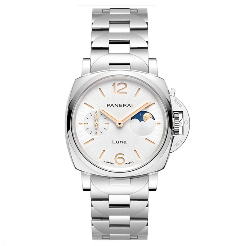 镜面材质 | 蓝宝石水晶玻璃 | 表盘 | 抛光精钢表壳 白色太阳放射饰纹表盘,附夜光阿拉伯数字及小时标示。 3点钟位置设月相显示,9点钟位置设小秒盘。 抛光精钢表冠护桥装置 12边形精钢表背,镌刻Luminor Due庐米诺杜尔系 列logo |