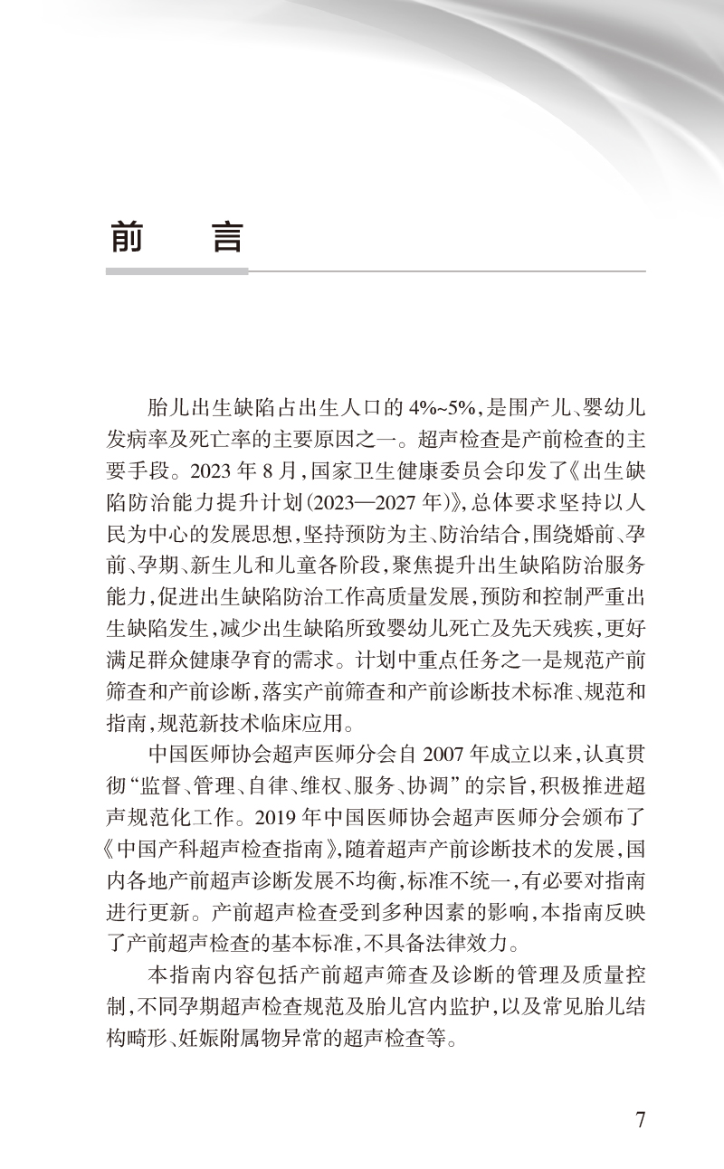 本书由中国医师协会超声医师分会组织编写。第一章为总论,包括对产前超声检查的基本要求、管理、各类产前超声检查的适应证、检查内容、存图要求等。第二章、第三章为早、中、晚孕期超声检查,结合国际妇产科超声协会出版的指南对不同孕周产科超声检查的重点进行了阐述。第四章为产科多普勒超声,第五章为双胎妊娠,第六章第七章为异常妊娠,第八章为妊娠附属物的超声检查。本书着重介绍产科超声指南及产前常见异常的超声诊断、鉴别诊断及诊断时注意事项,重点突出,简明扼要,非常适合产科超声医师、产科临床医师阅读。