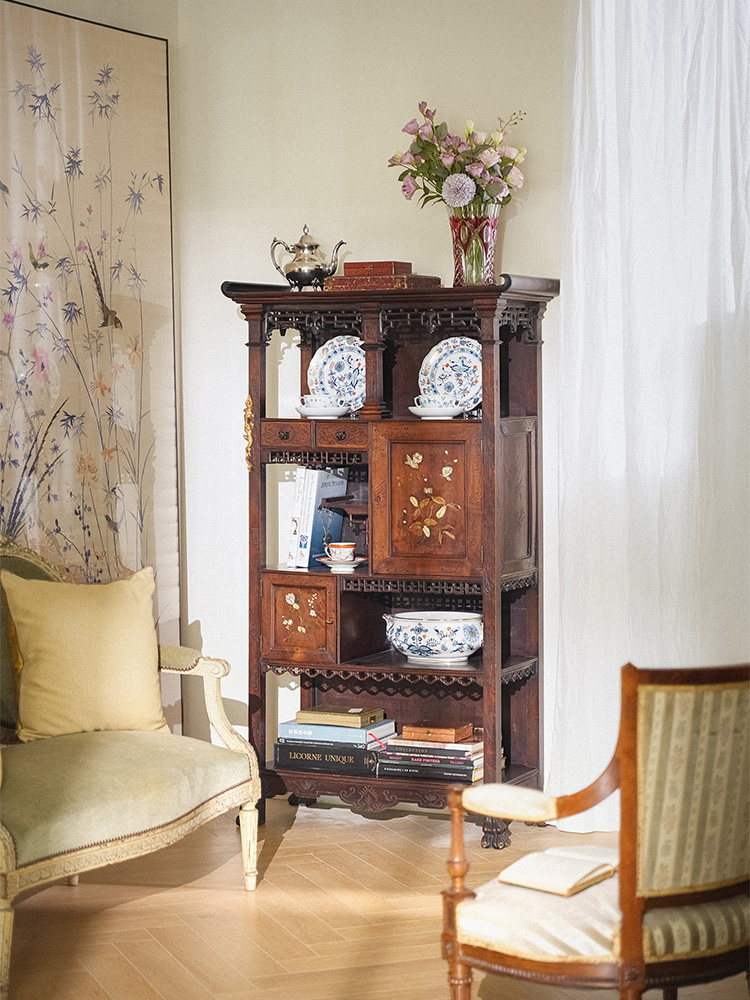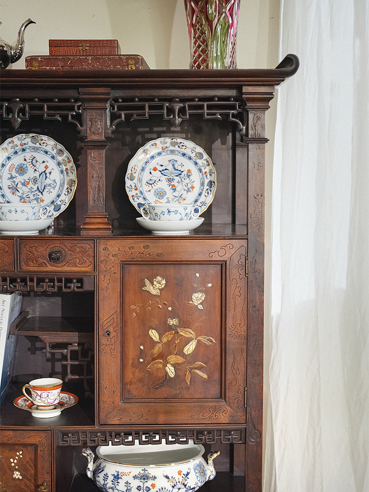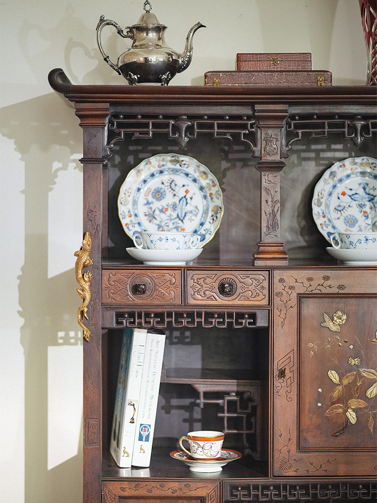 独角鹿西洋古董 1890年代法国出品Viardot东方风格蟠龙造型铜鎏金装饰花鸟镶嵌多宝阁
